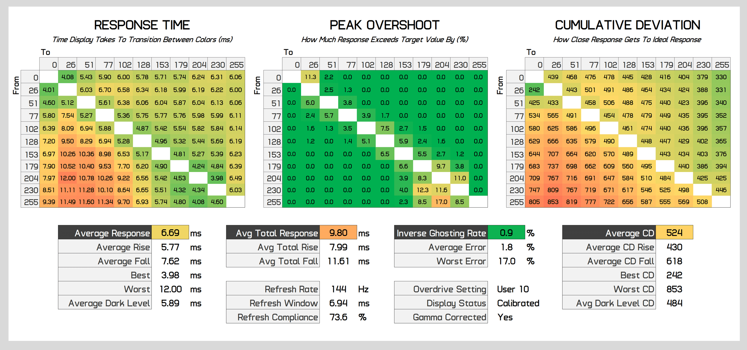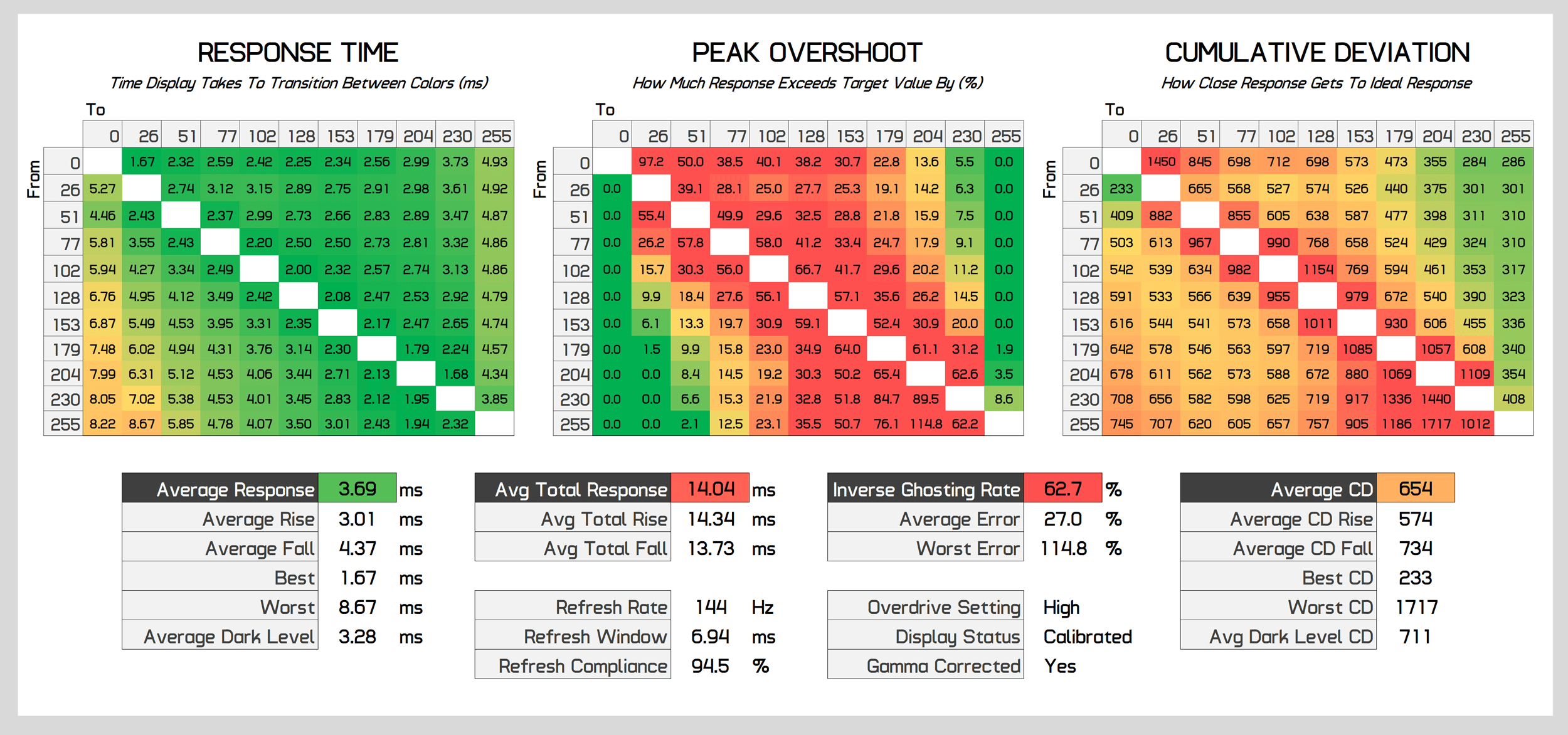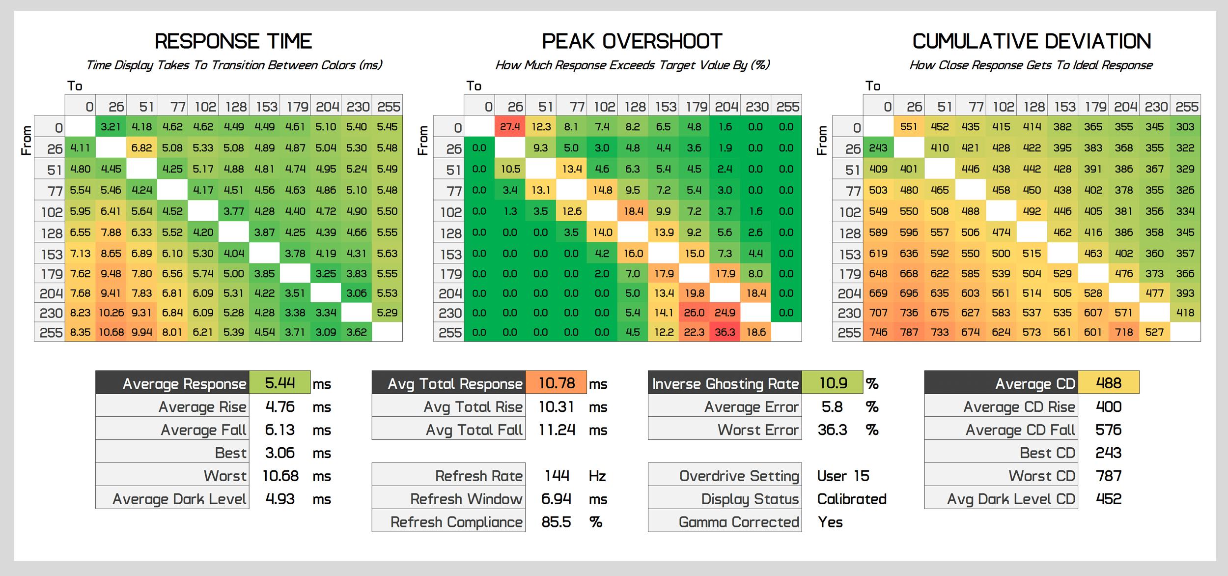 Beyond this you can control overdrive via the user customizable slider, which allows values between 0 and 63. However I found that a significant portion of the range is useless with quite a high level of overshoot. So I'll cut to the chase. When optimizing for the lowest cumulative deviation, I found a value of approximately 15 to give the best experience at 144Hz.