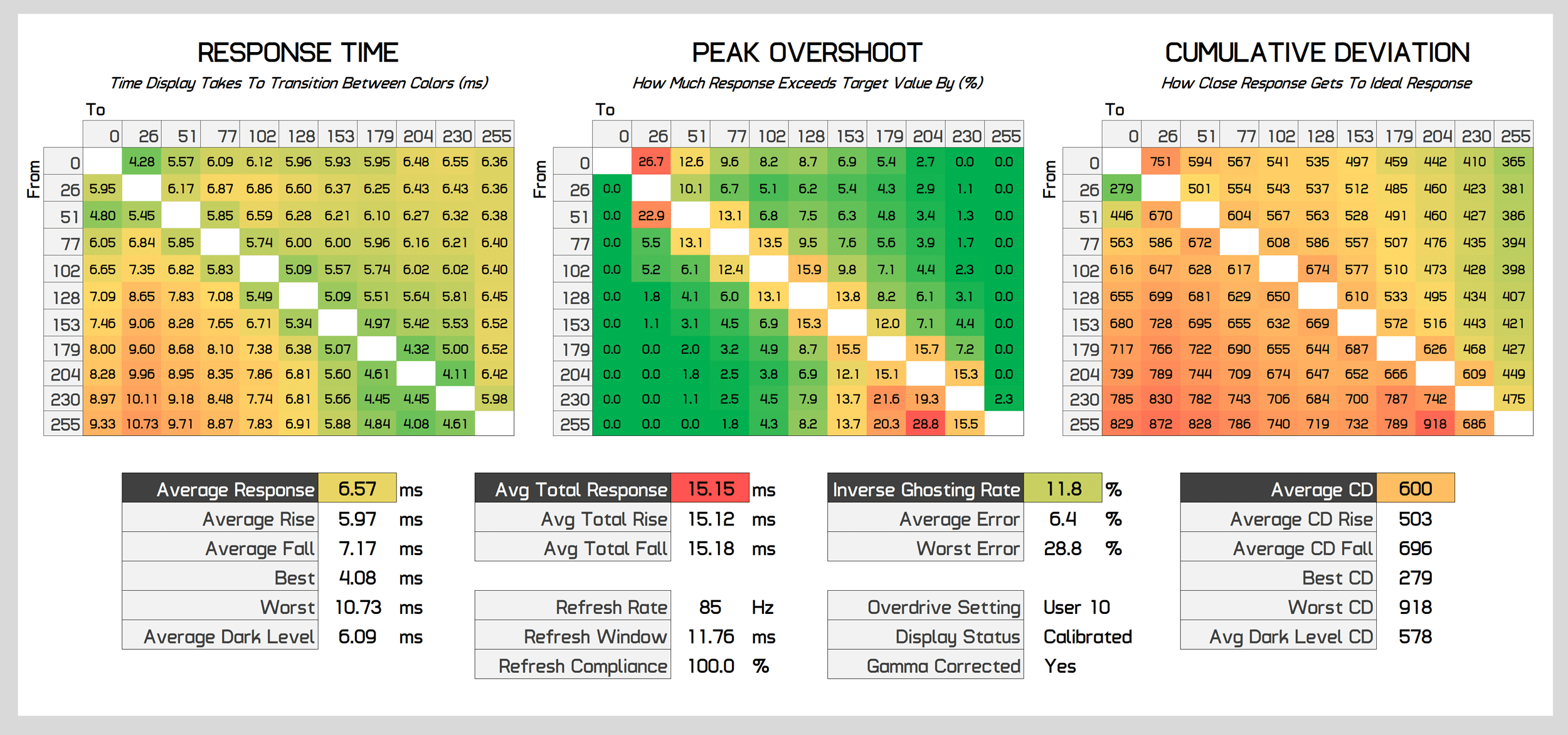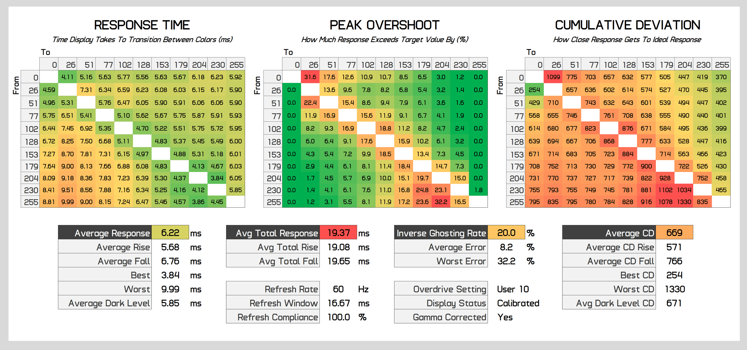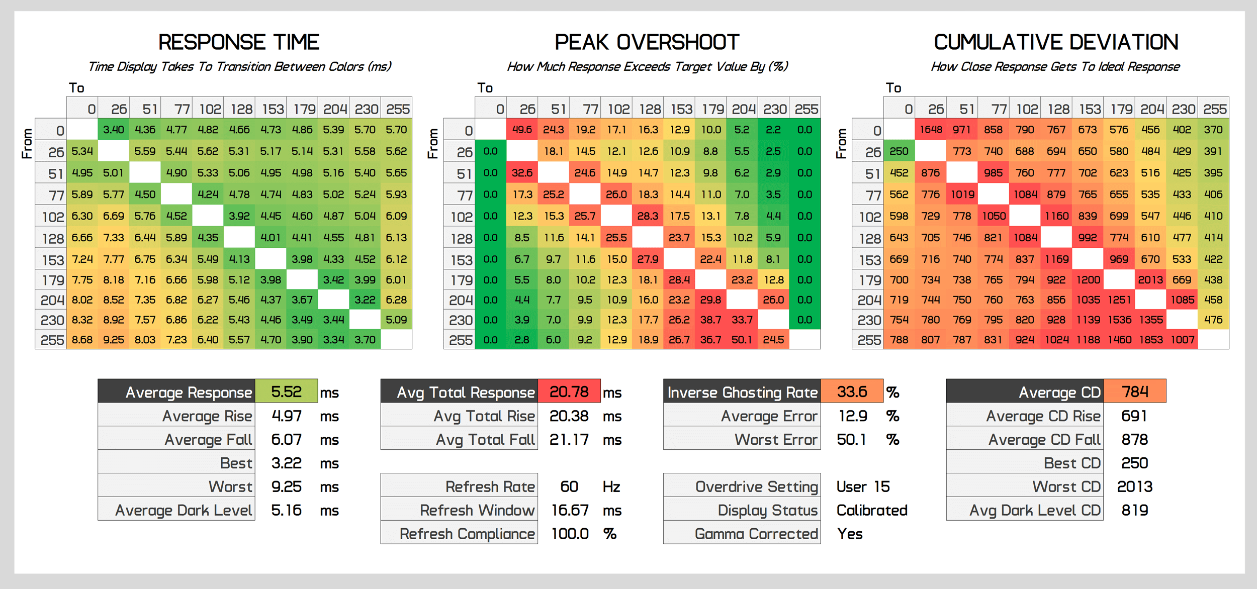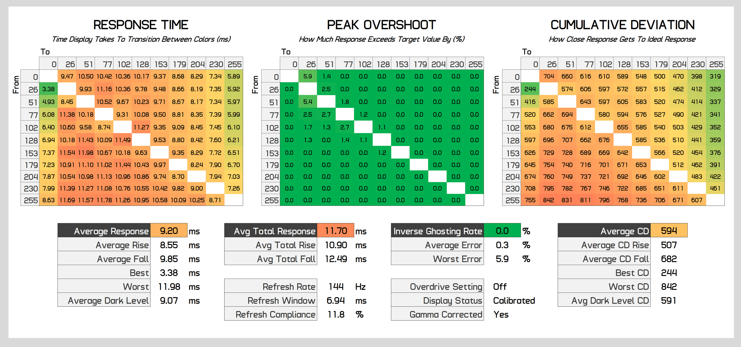 Beyond this you can control overdrive via the user customizable slider, which allows values between 0 and 63. However I found that a significant portion of the range is useless with quite a high level of overshoot. So I'll cut to the chase. When optimizing for the lowest cumulative deviation, I found a value of approximately 15 to give the best experience at 144Hz.
