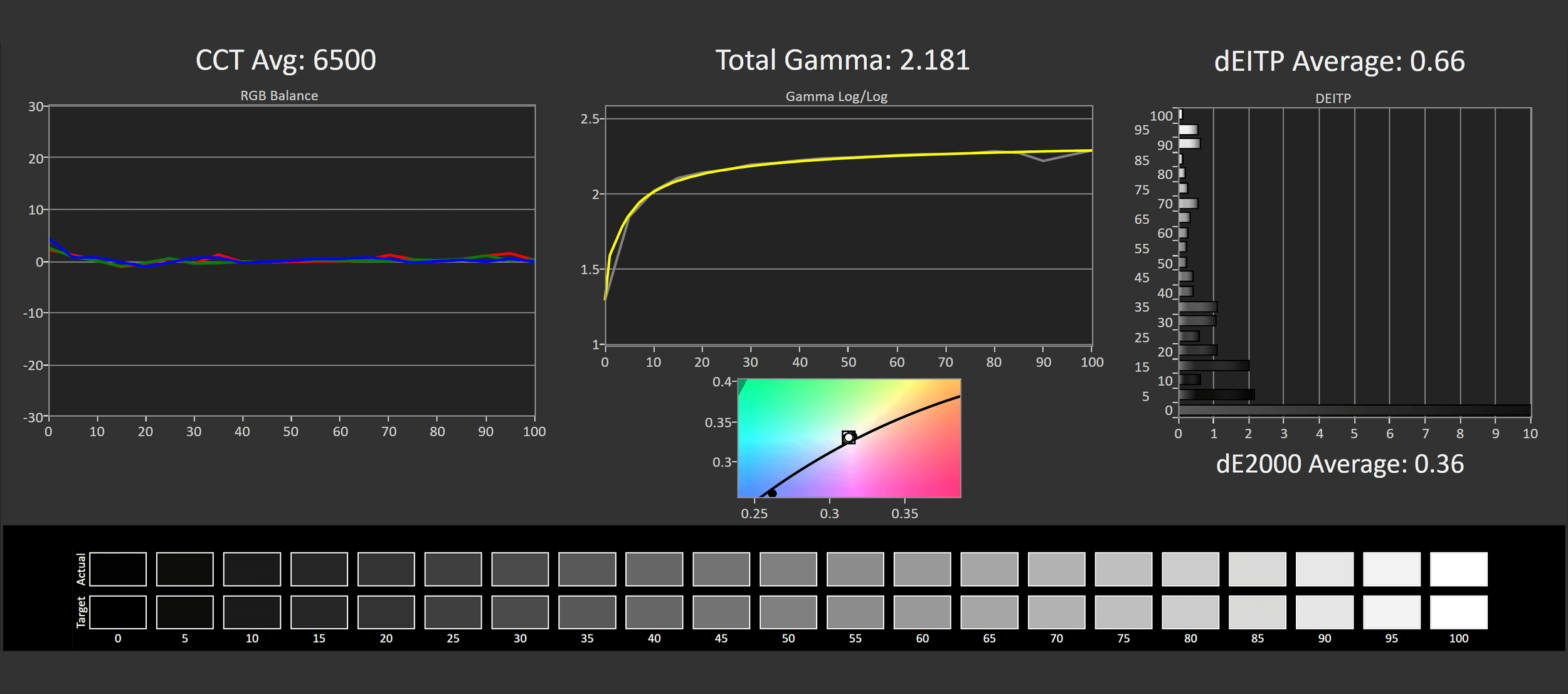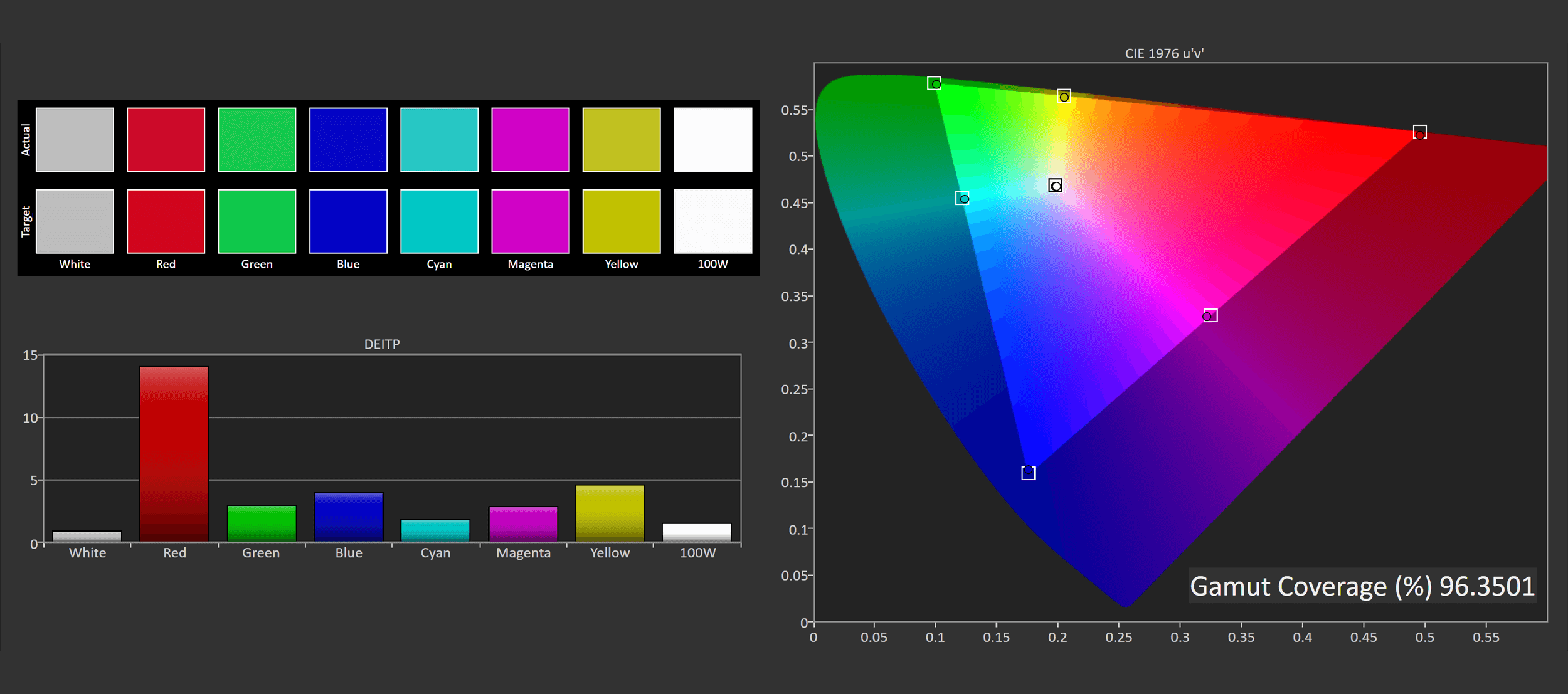 Default factory calibration was pretty good with my unit, at least for greyscale performance. The CCT curve is impressively flat and balanced, leading to perfect tone out of the box. The gamma performance isn't perfect, but decent enough and that leads to good deltaE results. However the default experience using the Spectrum is its wide gamut mode, despite the majority of SDR content only using or requiring sRGB/Rec. 709. What this means is by default, the panel is oversaturated.