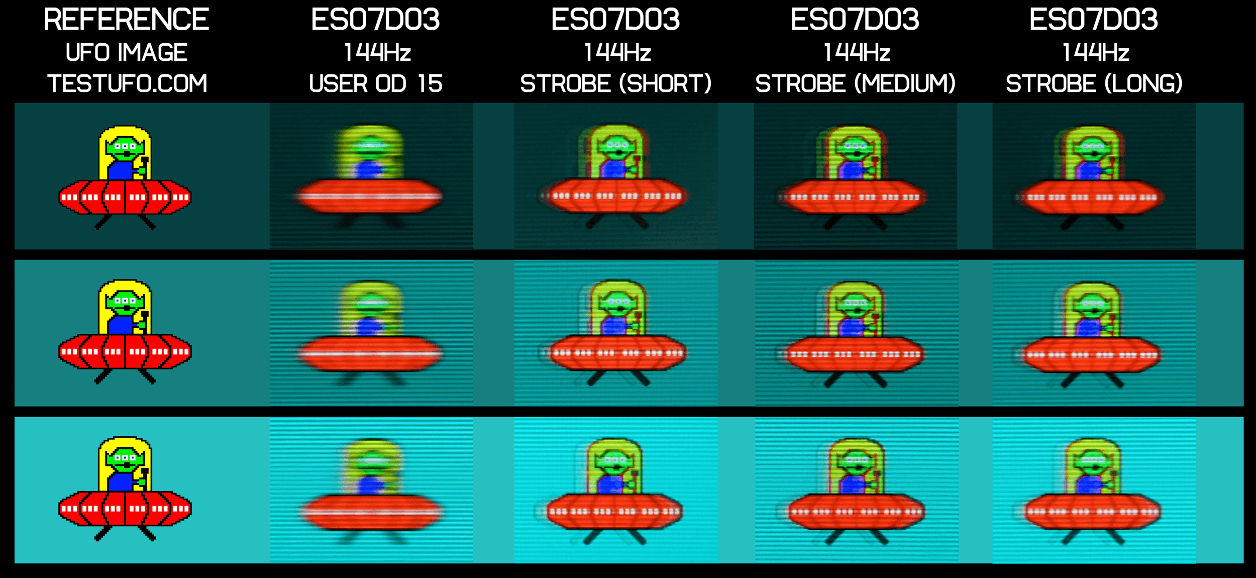 The Eve Spectrum supports backlight strobing, and it's a really great implementation, especially for this sort of panel. The built in presets have minimal strobe crosstalk or double images, leading to noticeably improved clarity compared to running without strobing, and not that many artefacts aside from a slight trail. You get the best image quality with the "short" pulse width, but the lowest brightness, although even the "long" pulse width with a high level of brightness is still decent. This can be further tweaked using either the built in user controls in the OSD, or the BlurBusters Strobe Utility, for the optimal results.