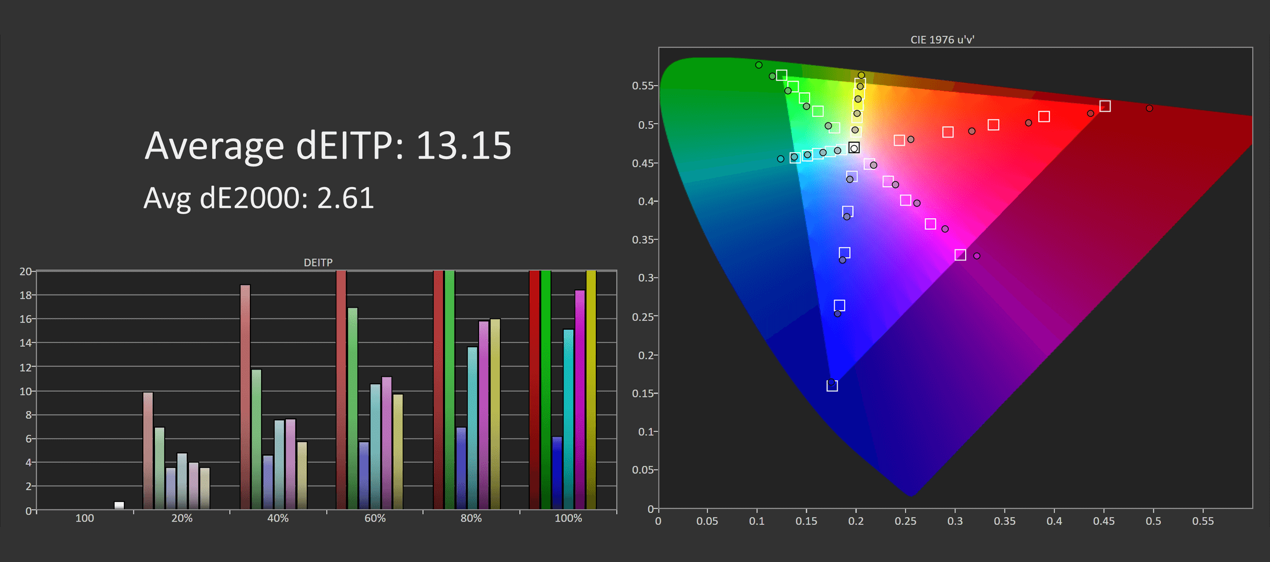 However performance can be improved notably by switching the monitor over to its sRGB mode. Greyscale deltaEs drop in this configuration to below 1.0 in deltaE 2000, and just 3.0 in dEITP, which is very strong, despite some inconsistencies with the gamma curve. Color performance is also very strong, as the color gamut is being managed perfectly and this leads to no oversaturation. All up this sRGB mode is a lot better than average and very usable without any further calibration.