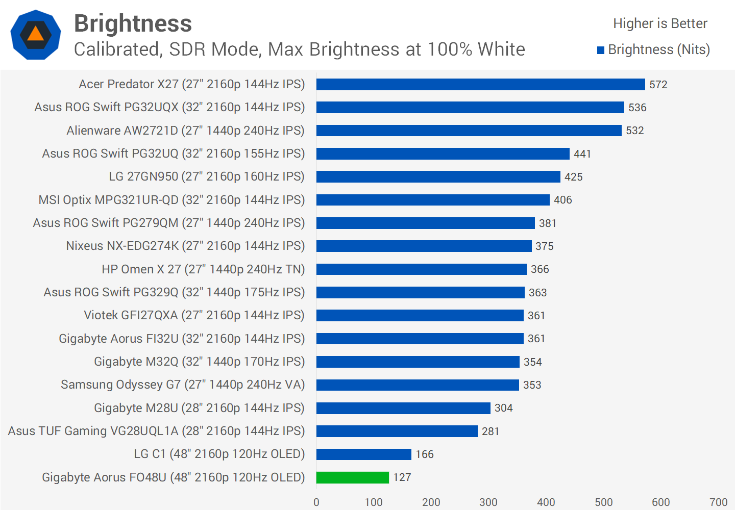 The FO48U does include an "HDR Vivid" mode which increases brightness in the same test and gets closer to what the C1 can do, but it completely destroys accuracy. Darker tones are too bright in this mode, and the white point is strongly tinted blue, so it seems this mode is trying to cheat a high brightness level for the sake of testing. We haven't used this mode in our charts for that reason as it doesn't look good in practice. In real world usage the FO48U is dimmer than the LG C1 and that's just the reality of it.