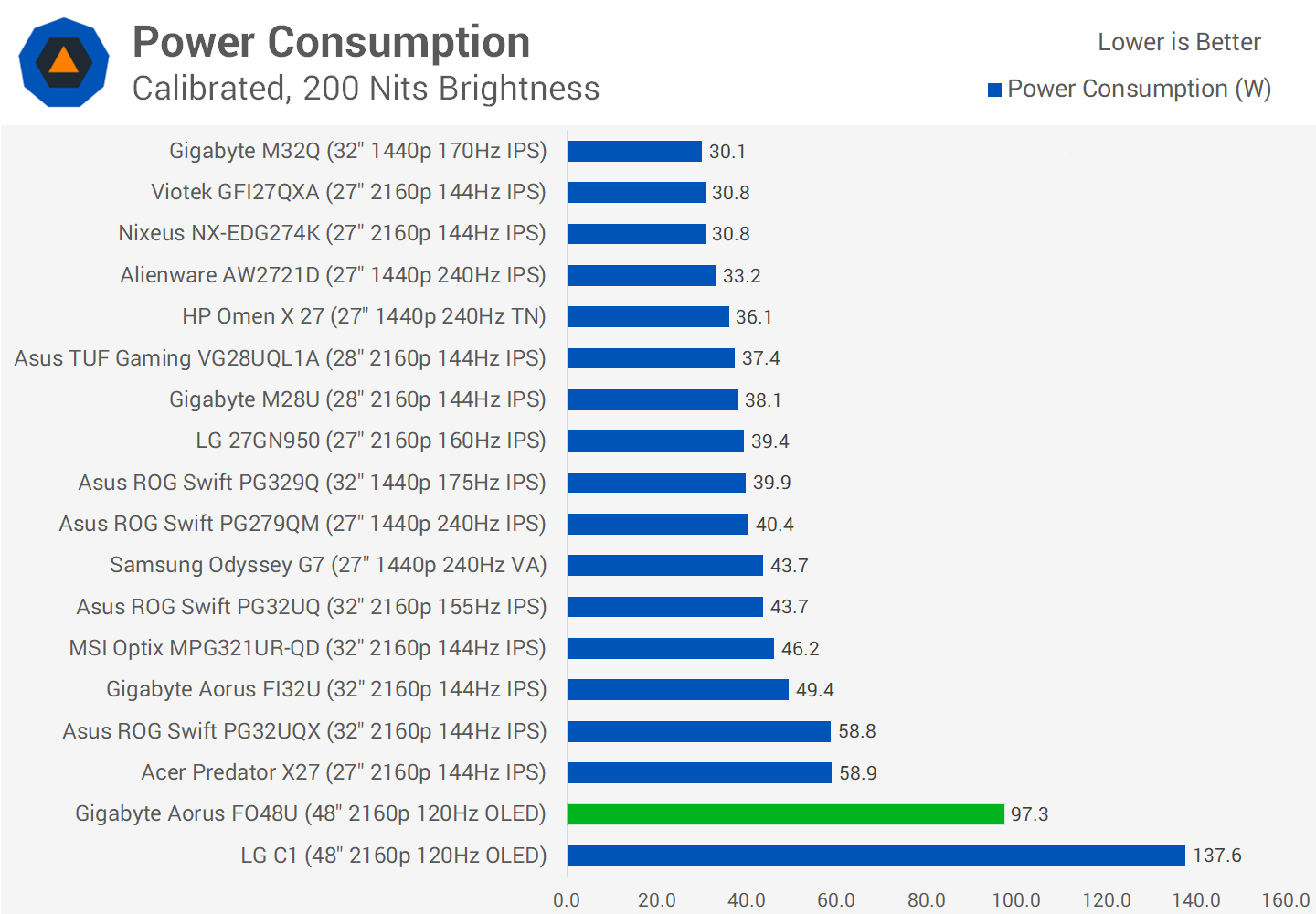 Power consumption is very high, typically double that of an LCD due to its size. And that's at a lower brightness level as well, as the FO48U can't actually hit 200 nits for a full screen white window that we test with for power consumption. It's actually dimmer than the LG C1 as we'll show later in this review, which causes the discrepancy between the Gigabyte and LG models. But basically OLED is not as efficient of a technology as LCD for displaying bright images, so power consumption is high.