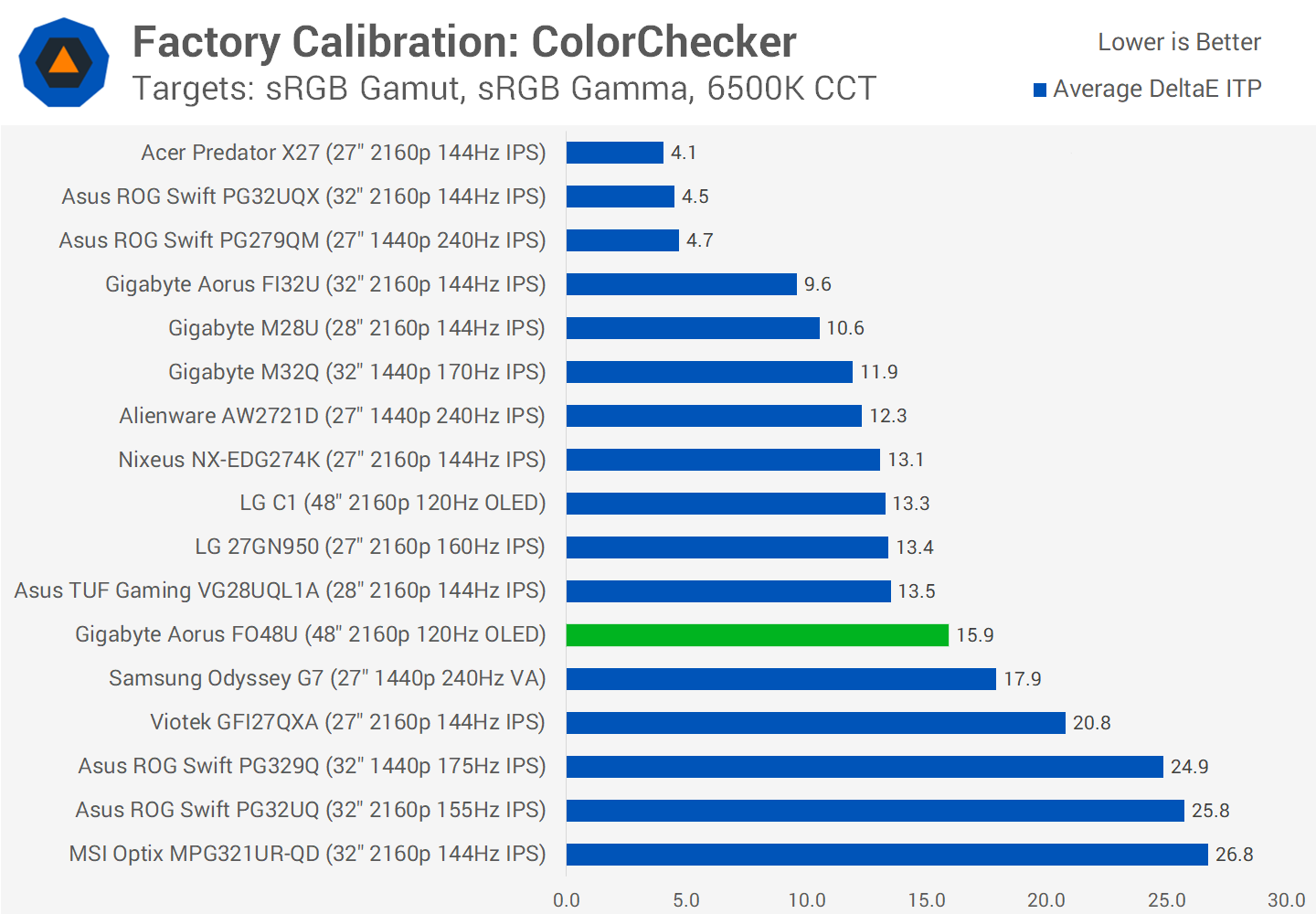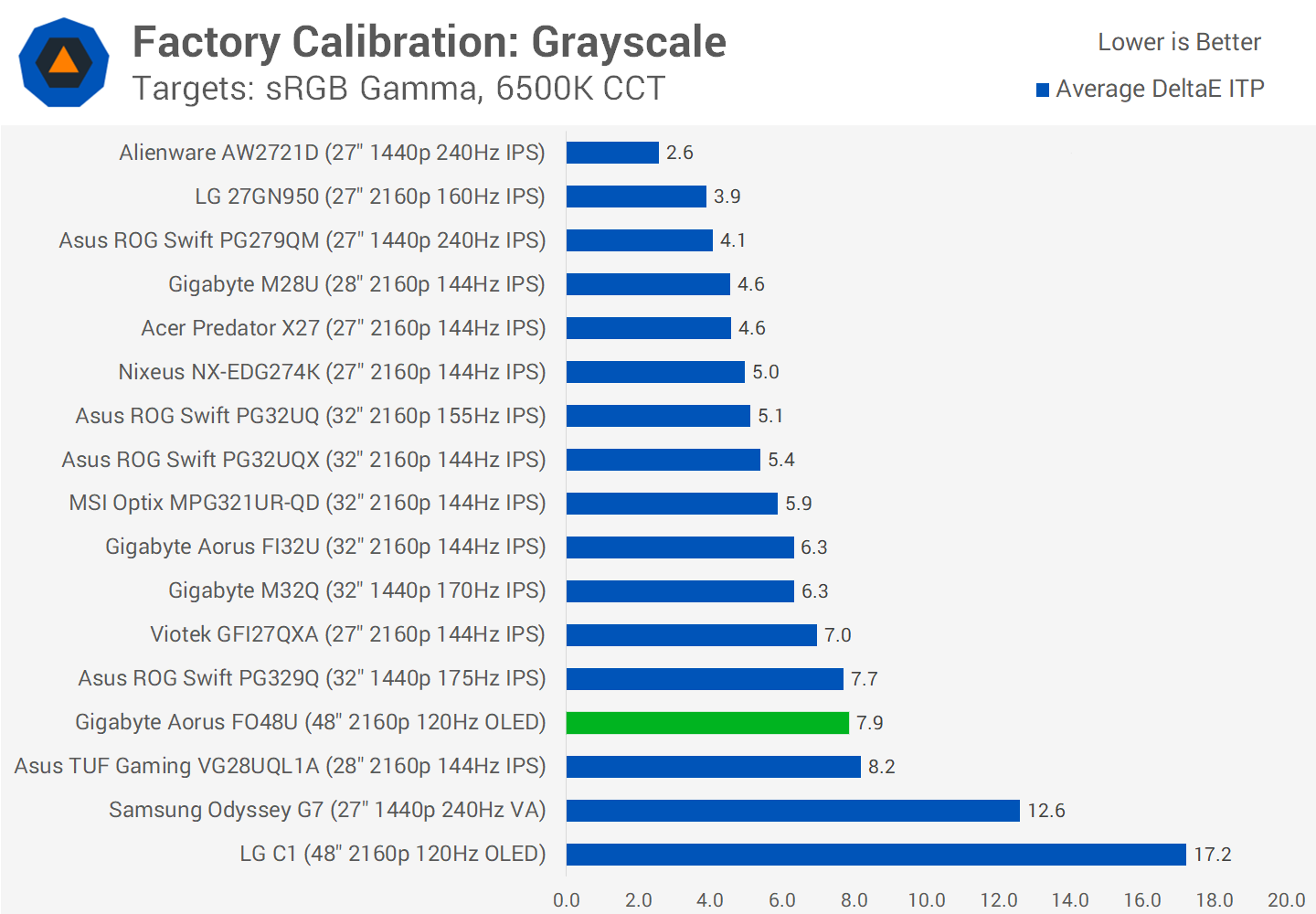 Unfortunately while the C1 defaults to an sRGB color space for SDR usage, the FO48U does not, so colors are oversaturated out of the box, even with the color space mode set to "auto". This is more in line with typical monitor performance, though it's not accurate and the way the LG OLED handles things is better. This isn't the end of the world but when you check performance up against other displays the FO48U is only mid table in both of our tests, in fact greyscale performance could probably do with more optimization.