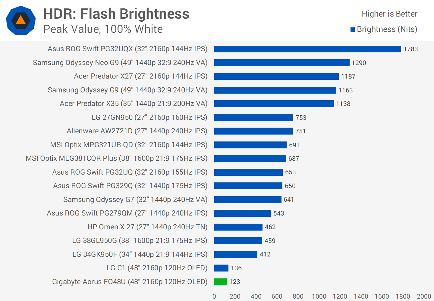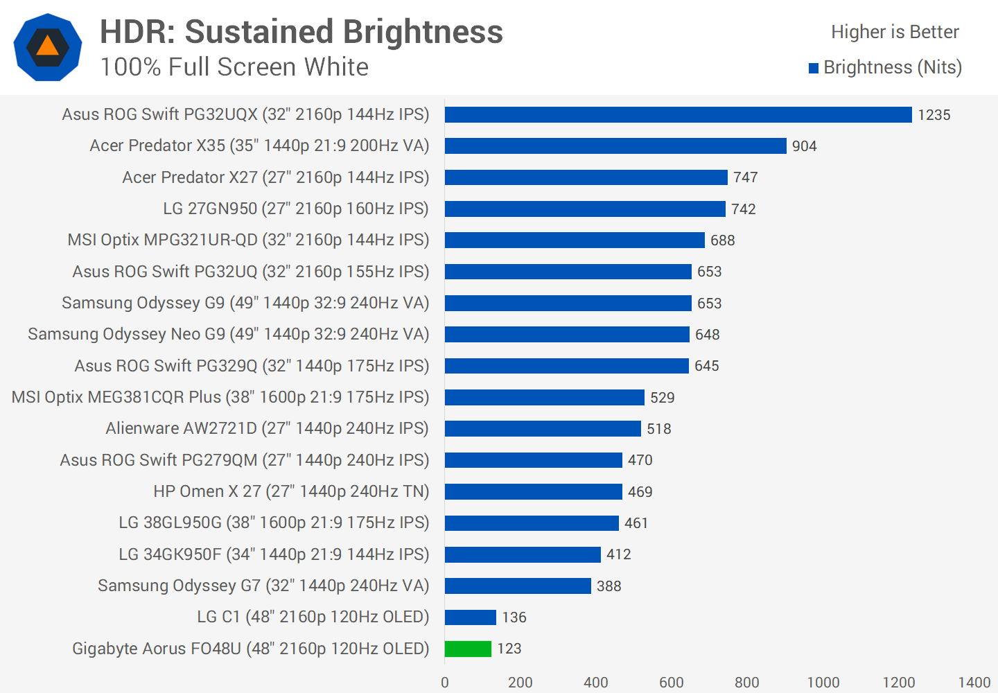 But the one area where this display suffers is once again in brightness. OLEDs do compensate for this to some degree by their zero black levels, but a full screen white image topping out at 123 nits can only take you so far. This pales in comparison to the best LCD monitors of today. There's also really no capacity for this display to produce a bright full screen flash for something like an explosion, which is disappointing.