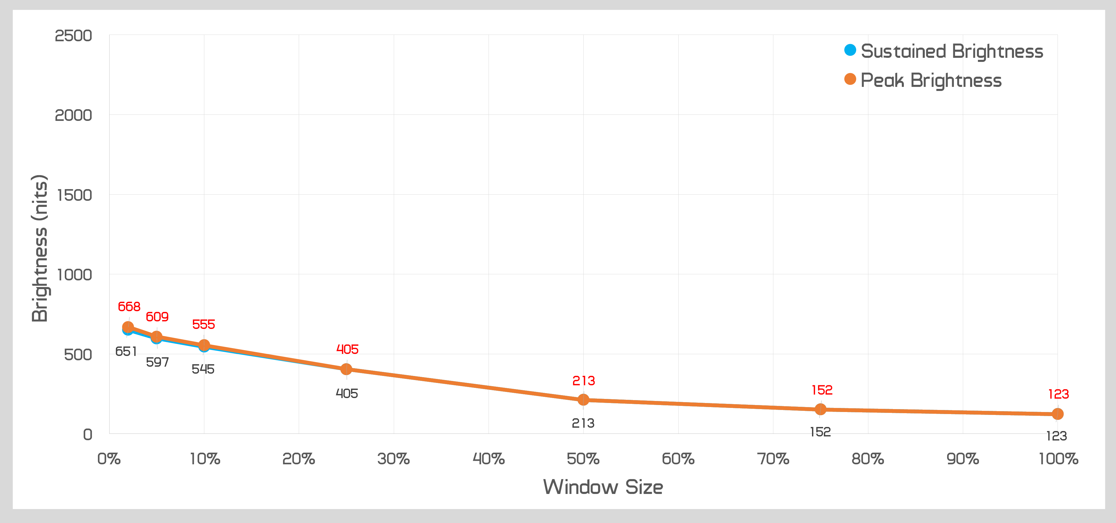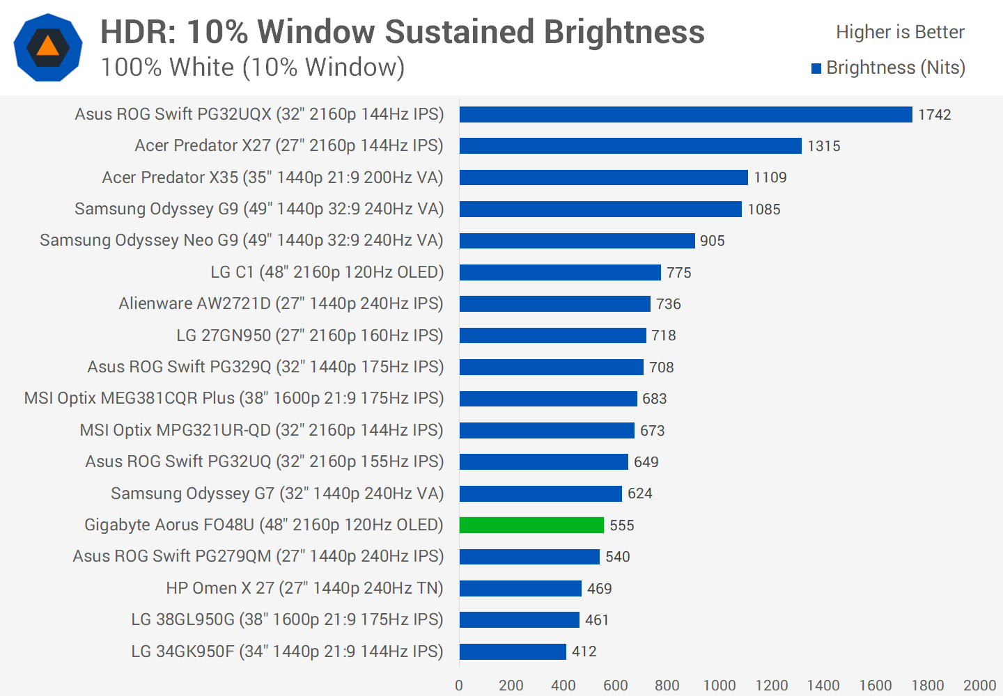 Brightness vs window size is a little better for the FO48U, which performs similarly to the C1 down to a window size of 25%, and eventually closes the gap at smaller window sizes like 2%. Fundamentally though, HDR brightness is on the weaker end of the scale and while I still think it looks great for HDR in general, it's not as great as the LG C1.