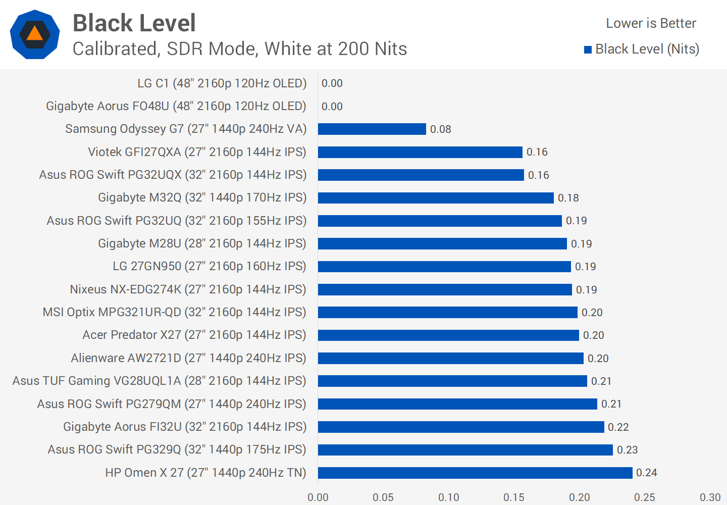 Obviously the main advantage here though is the contrast ratio. While LCDs top out at around 12000:1 in our worst case single frame contrast tests, OLEDs are still capable of infinite contrast so they look far better and don't suffer from blooming issues.