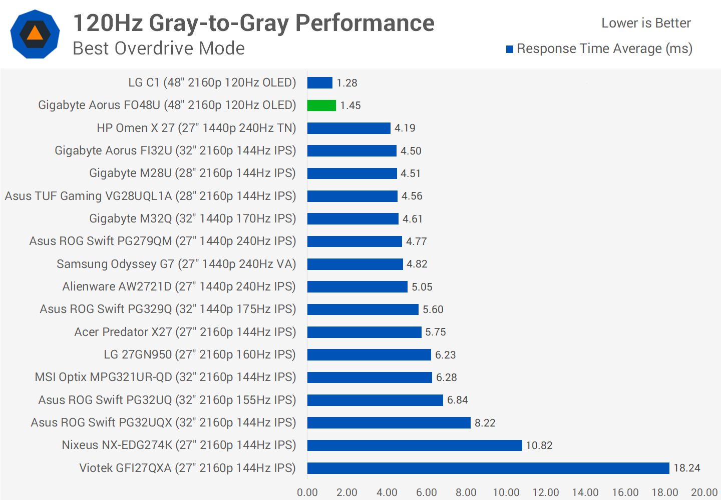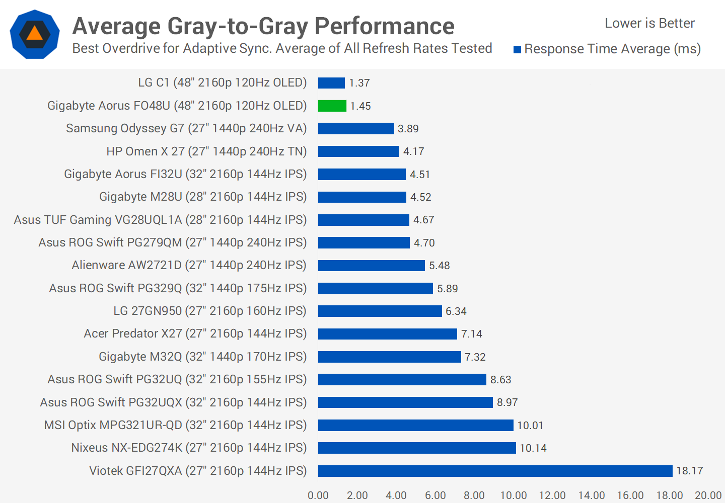 In terms of response time performance, because the FO48U is an OLED panel, it's extremely fast and doesn't require overdrive settings. The automatic brightness limiter did make it a bit more difficult than usual to gather these numbers but we found a suitable workaround that's very accurate, which was basically to make the test window small.
