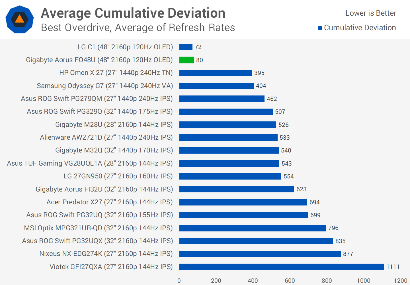 But it's not just about response times, cumulative deviation is also important to getting an idea how fast the FO48U and OLED panels are. These displays aren't just fast, but they are fast over the vast majority of the transition with very little lingering delay at either end. This leads to exceptionally good cumulative deviation, as the transition behavior is very close to the ideal instant square-edge response. LCD panels are laughable in comparison as seen in the huge delta between them and the top of the table OLEDs.