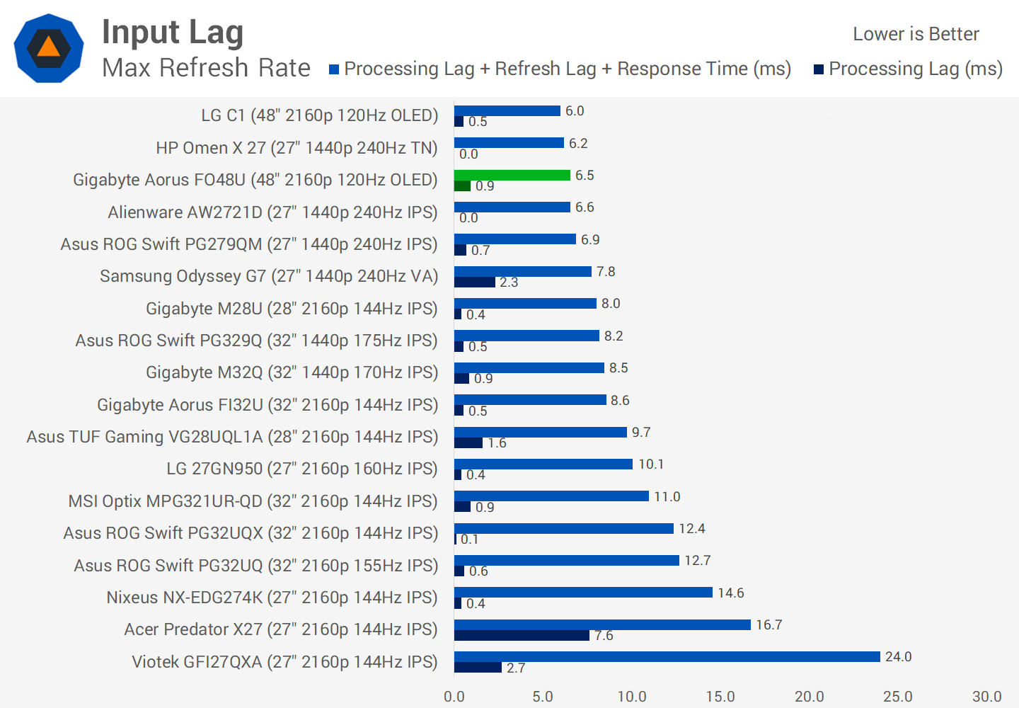 Input lag is a non issue with the FO48U, coming in at under 1ms of processing delay, and a total delay in the chain equivalent to 240Hz monitors due to its extremely fast transition times. This means that while the FO48U doesn't feel as smooth as a 240Hz monitor as you are only seeing half the amount of refreshes, the actual delay to getting the image into your eyeballs is just as fast. However the FO48U has no inherent delay advantage over the LG C1, which in its PC configuration also has very low input lag, so removing all those TV features hasn't given Gigabyte any leg up.