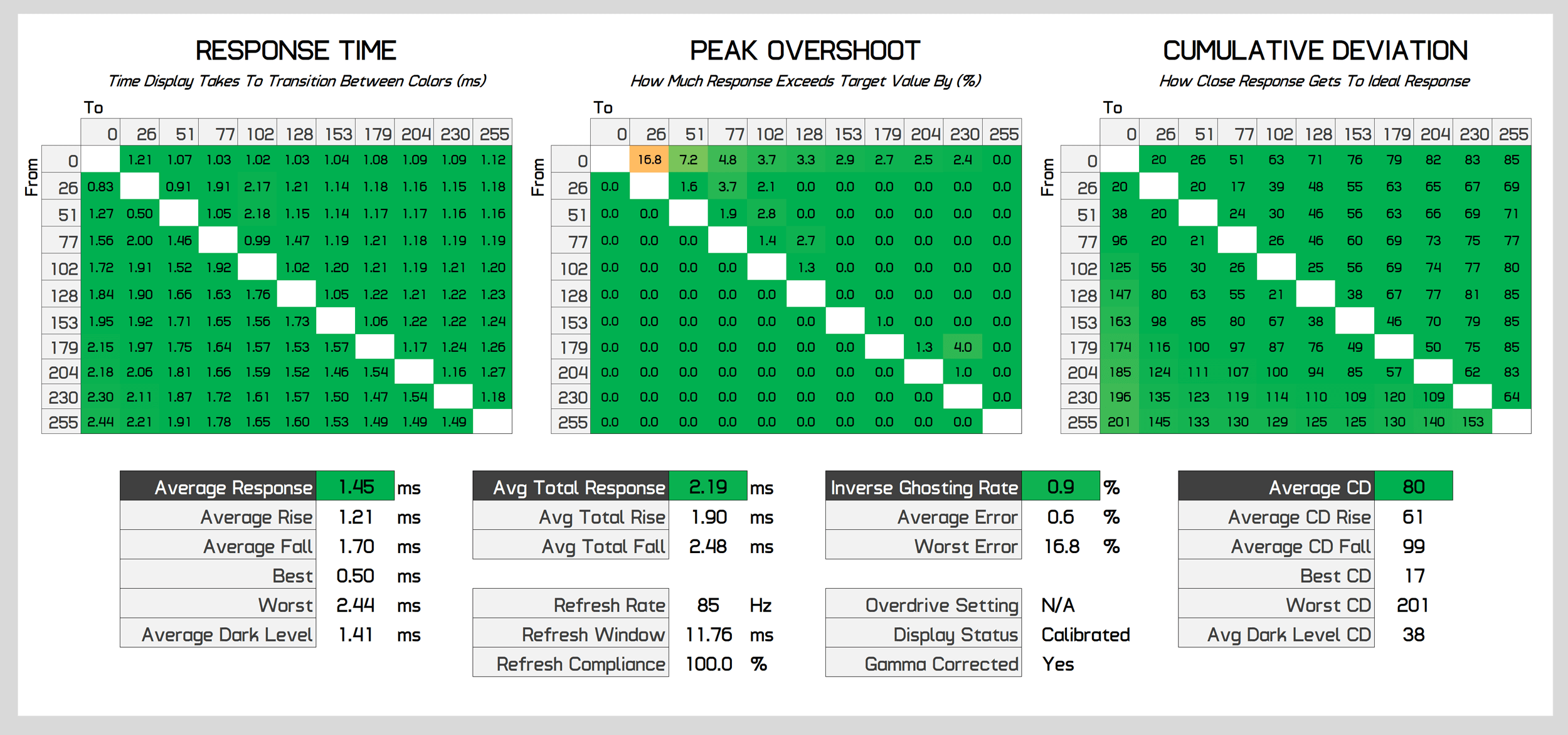 It gets better looking at average performance across the refresh range, where the FO48U is even further ahead of the LCD pack. Not only is overshoot completely negligible on average, response times are outstanding, so at any refresh rate you can be sure motion performance is as good as you can get.