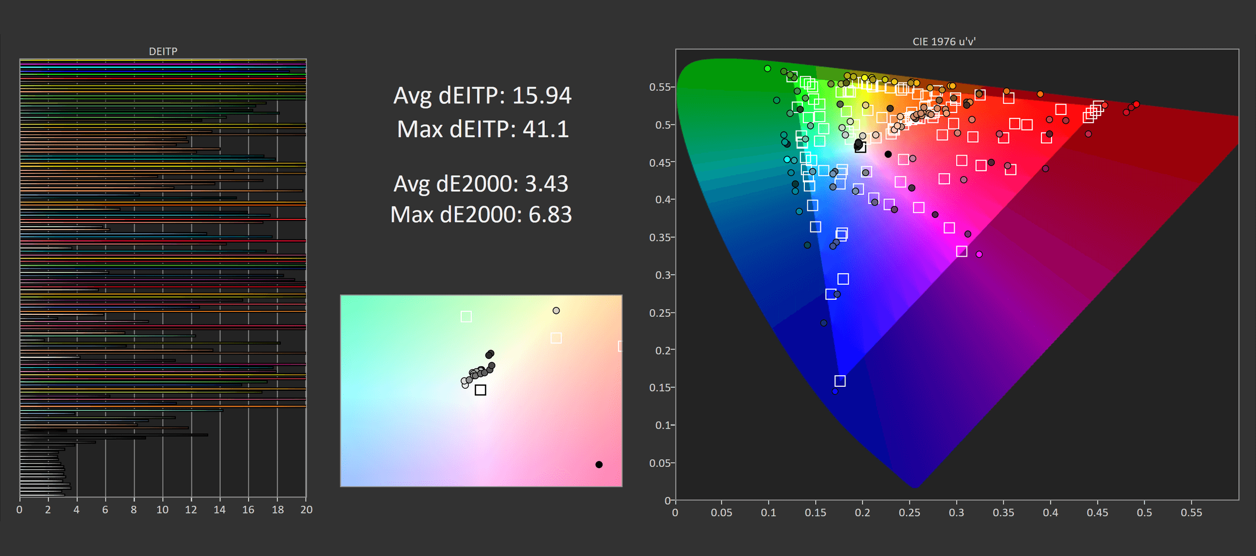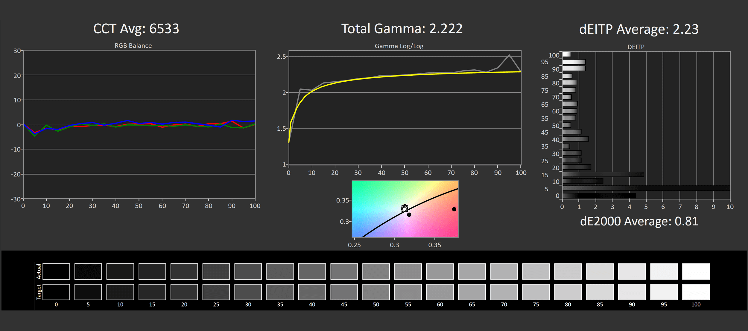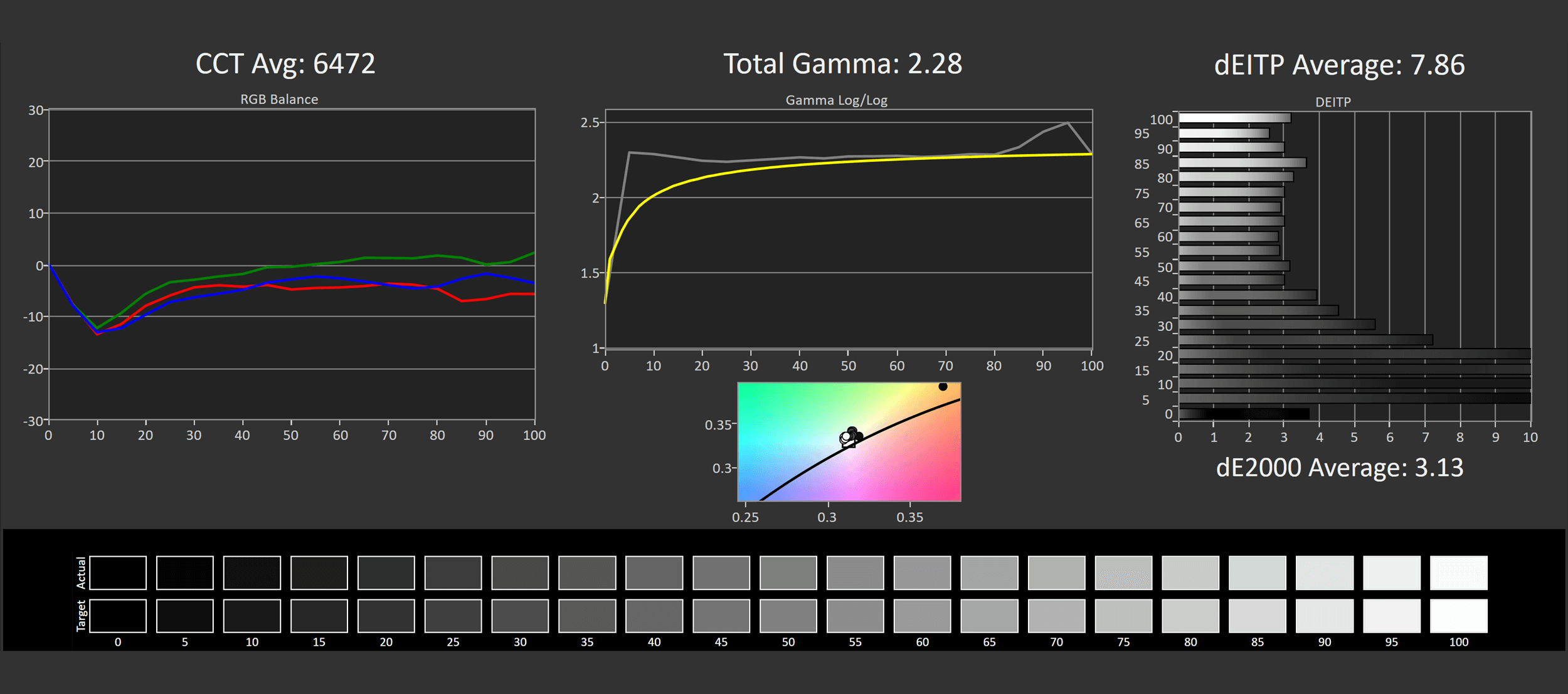 One of the main issues with the LG C1 was terrible out of the box calibration, particularly for greyscale. That's less of an issue with the Gigabyte model. The default mode isn't perfect and both the gamma and color temperature charts are a little wonky for sRGB usage, leading to only mid-range deltaEs – but this is miles better than how the C1 comes configured.