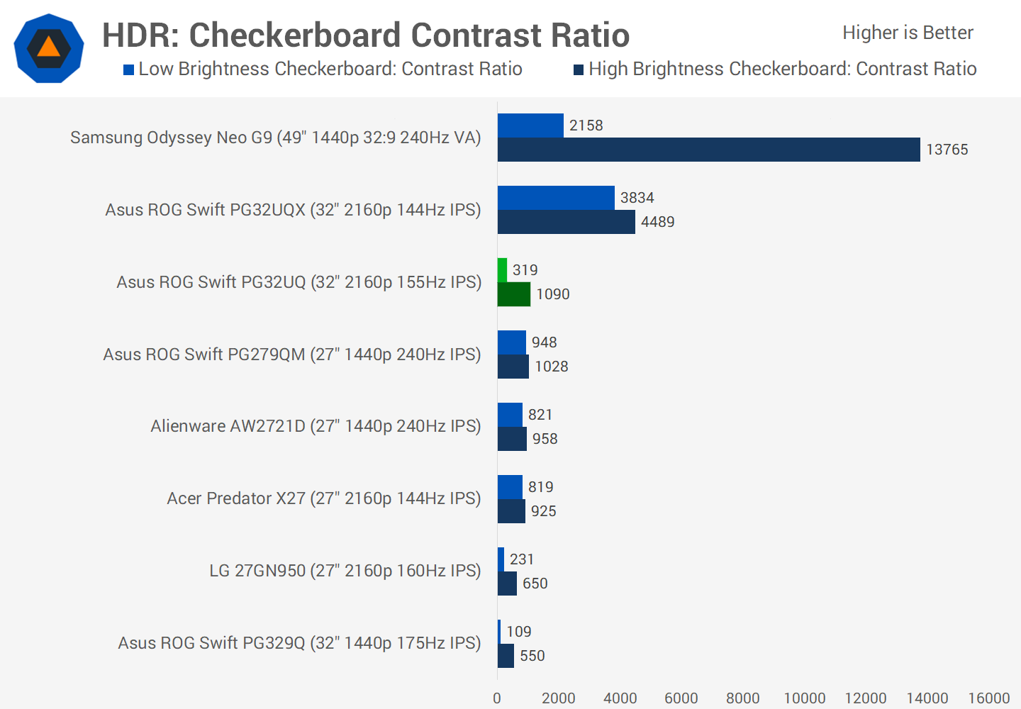 Then for worst case HDR contrast in the checkerboard test you get native panel performance as edge lit dimming is totally unable to dim small areas and therefore just enables the backlight at all times. This performance is plainly not suitable for HDR and about a quarter of what you get from the PG32UQX. What this means is that in a large portion of HDR content that has complex areas that need dimming or brightening, the PG32UQ is unable to deliver anywhere near an HDR experience