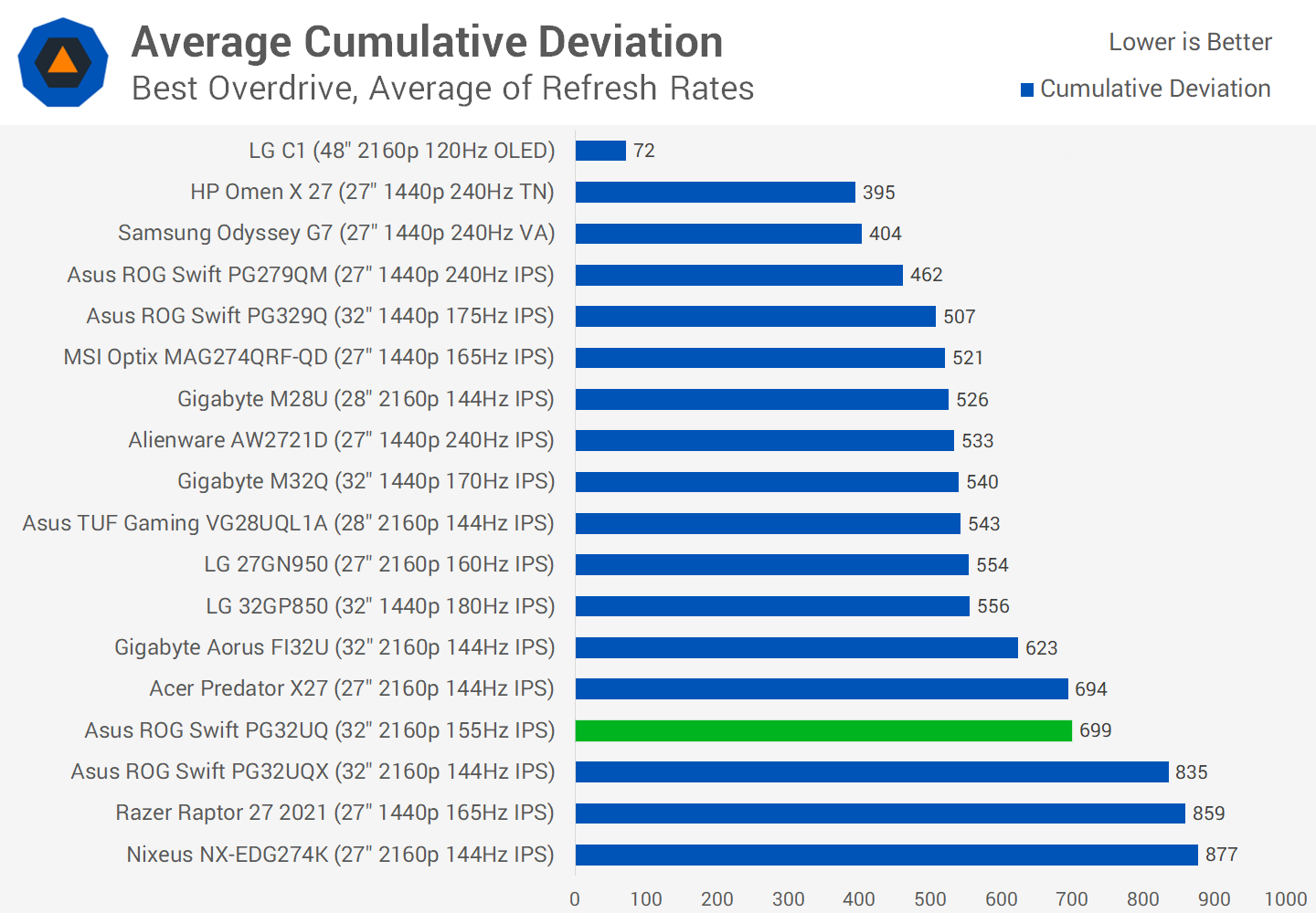 In cumulative deviation there is some positive news as we can better see the balance between response times and overshoot - and the PG32UQ is more towards the slow response, no overshoot end of the spectrum. What's good to see is that in this metric, the PG32UQ is clearly better than the slow PG32UQX, in fact it's 19% better which is substantial. The non-X model is just that little bit faster to complete most of the transition, and does so with less overshoot, so it benefits in cumulative deviation.