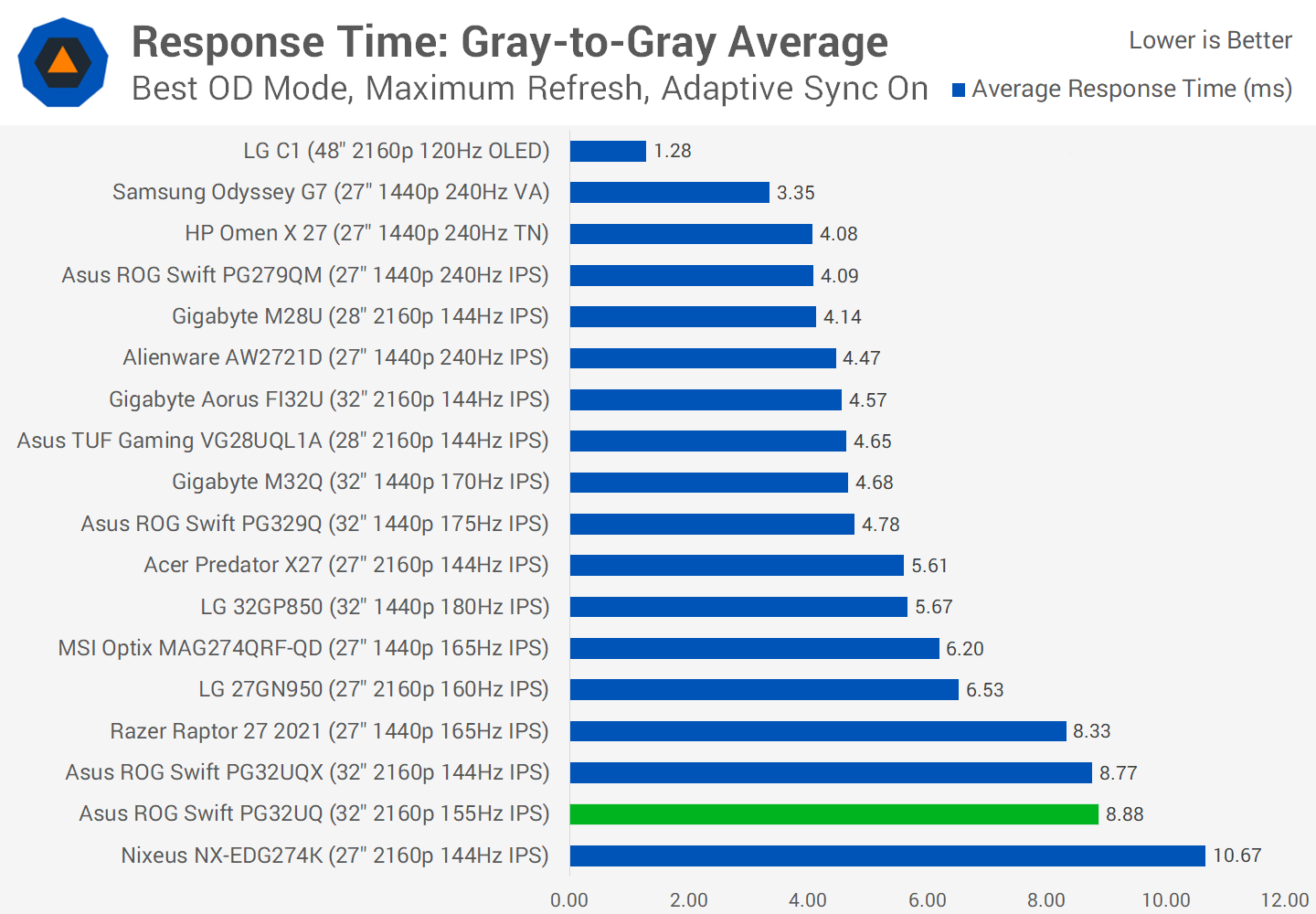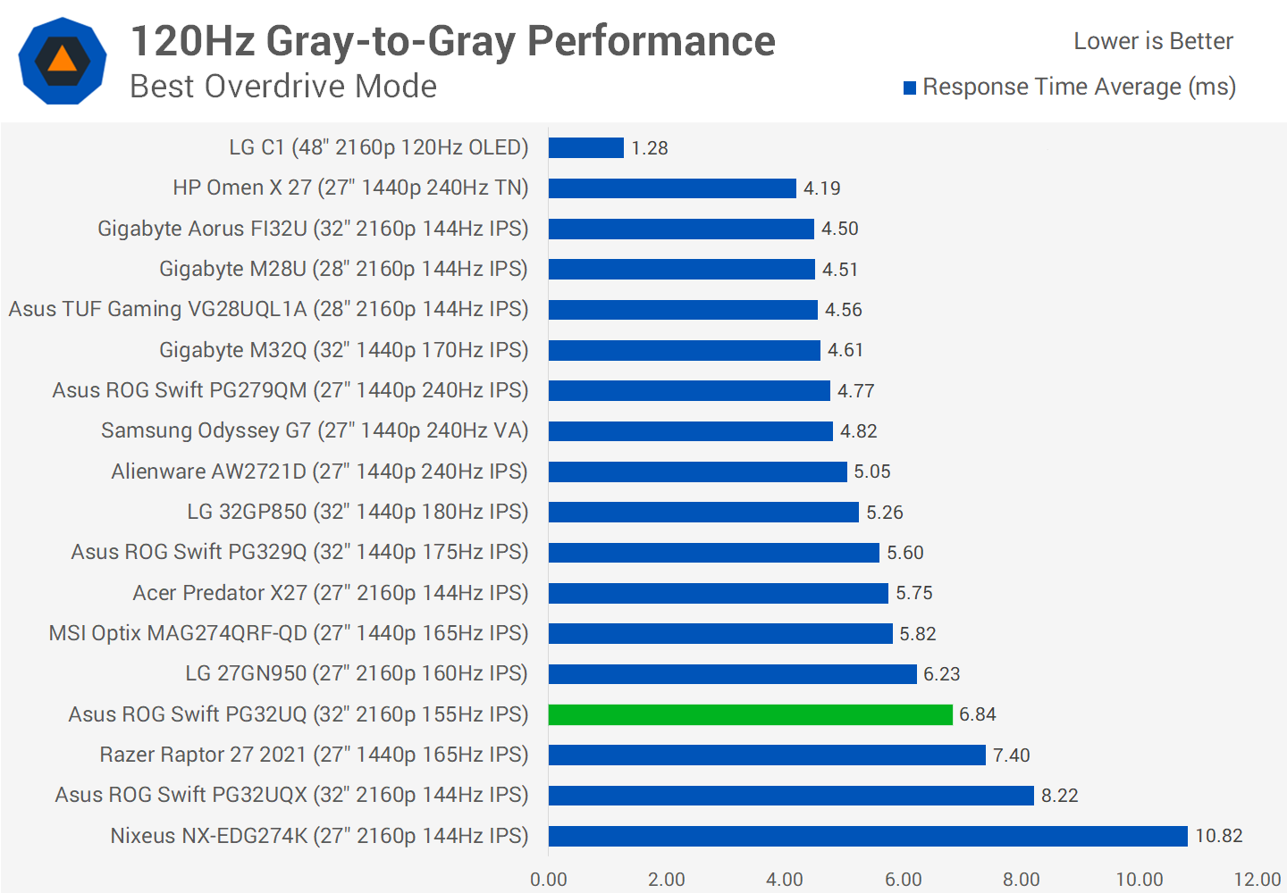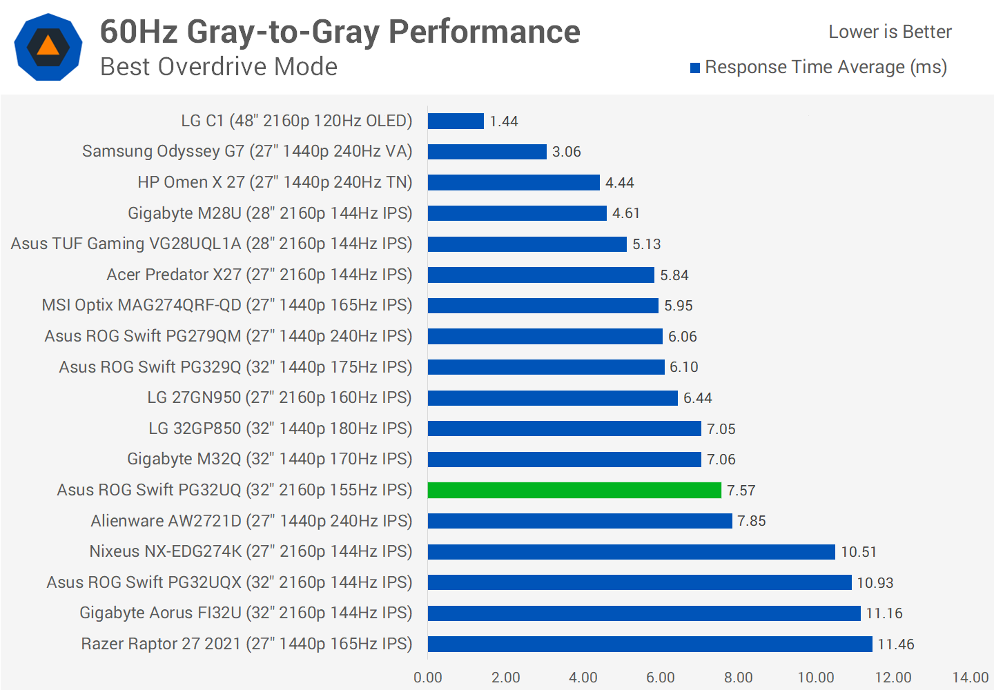 Yes, it's slower than the Gigabyte FI32U, but it's better at most other things. It has much better gamut coverage making it much more suitable for content creation, it has better semi-HDR functionality, better native contrast and superior backlight strobing. It also gets closer to having a single overdrive mode experience, despite generally falling behind in response times. Of the two, we'd choose the PG32UQ but only at a discount, and hopefully with more testing and newer releases we'll find a 32-inch 4K monitor that is better.
