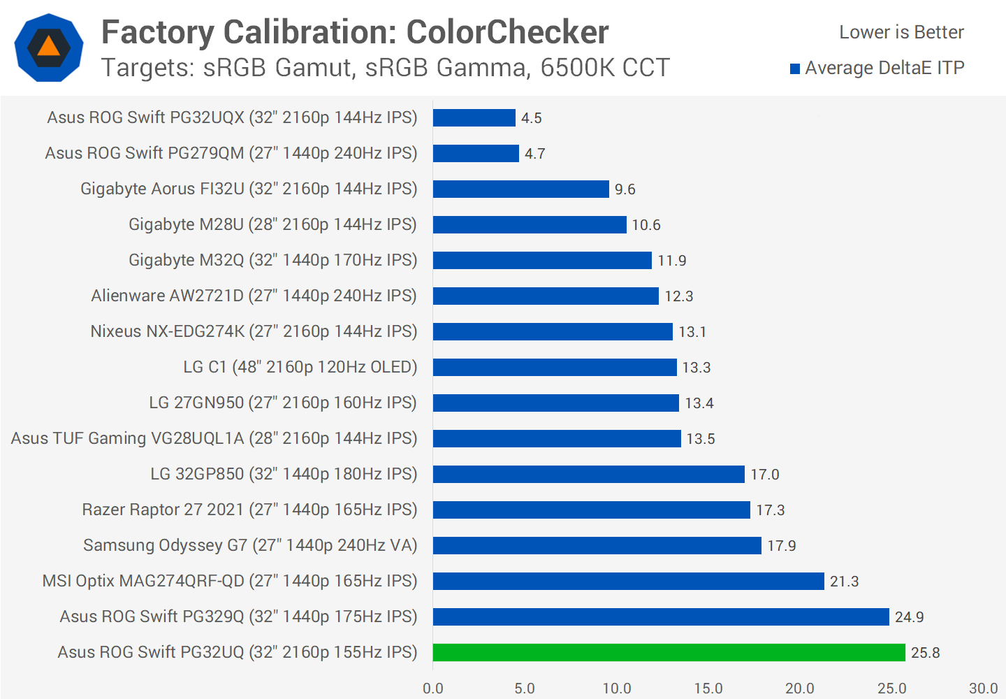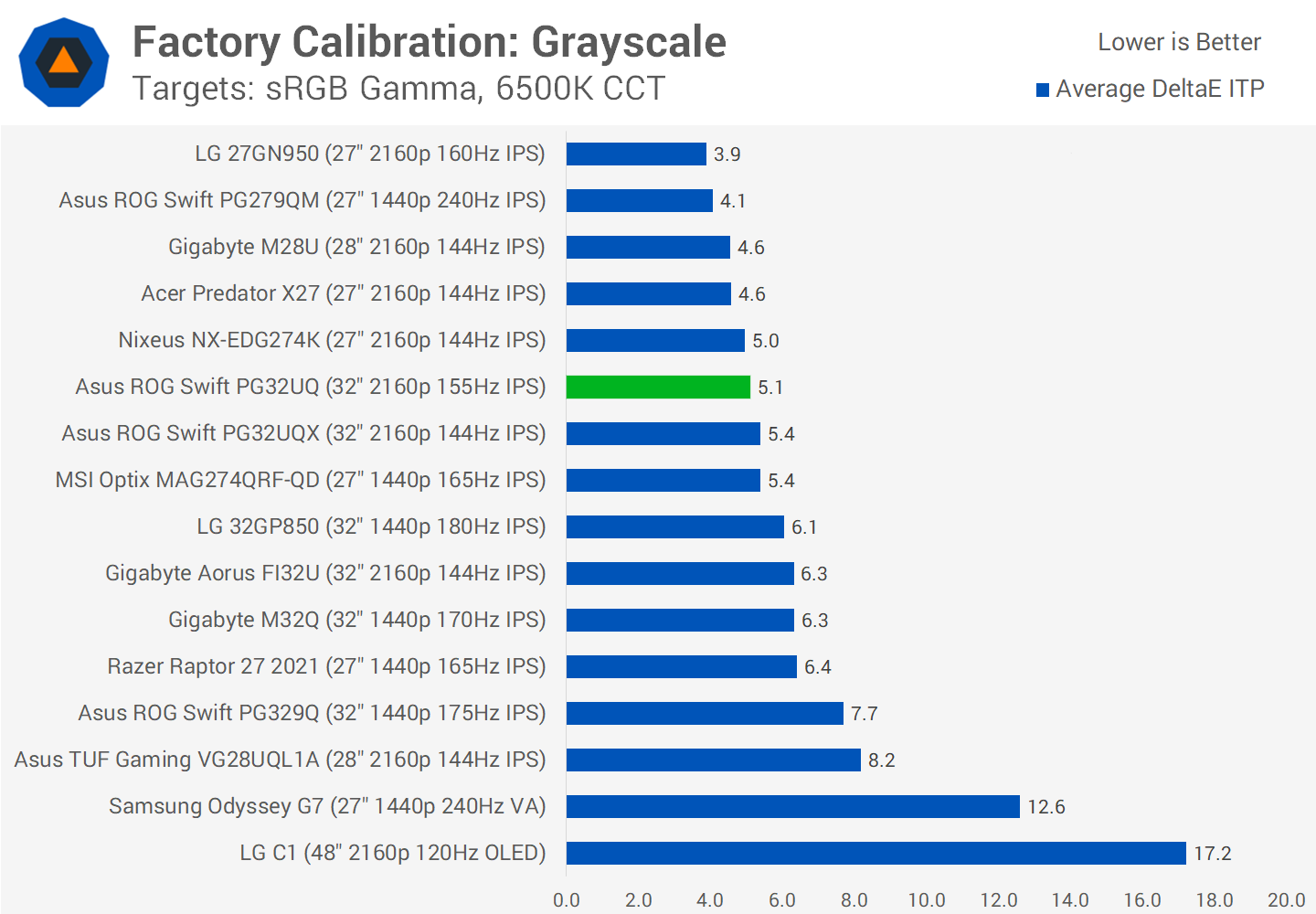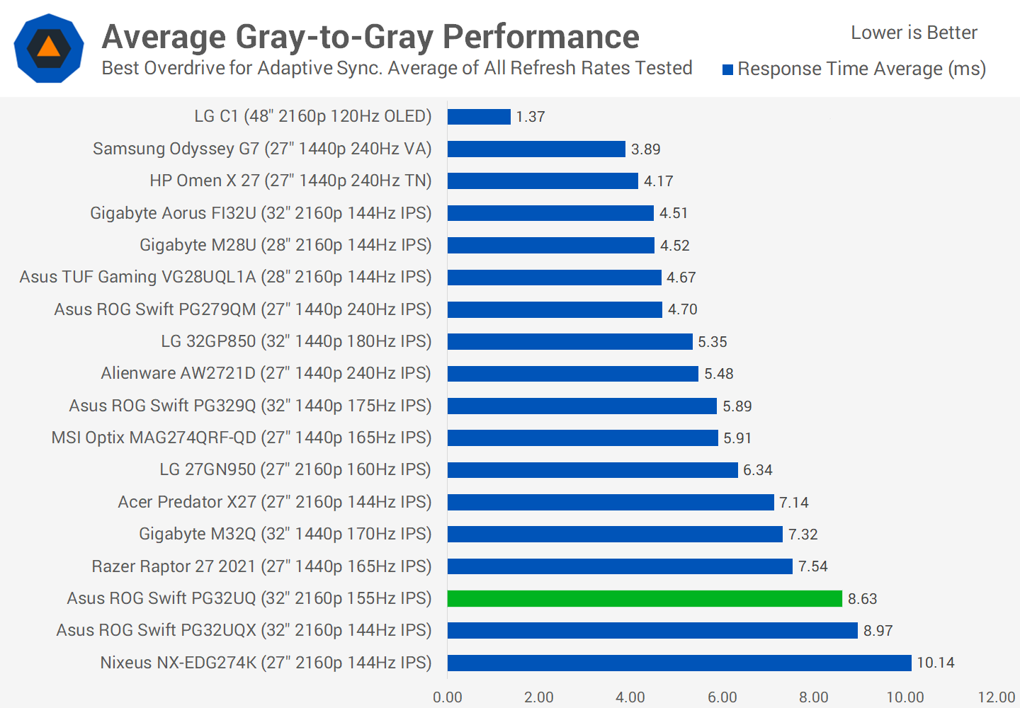 Yes, it's slower than the Gigabyte FI32U, but it's better at most other things. It has much better gamut coverage making it much more suitable for content creation, it has better semi-HDR functionality, better native contrast and superior backlight strobing. It also gets closer to having a single overdrive mode experience, despite generally falling behind in response times. Of the two, we'd choose the PG32UQ but only at a discount, and hopefully with more testing and newer releases we'll find a 32-inch 4K monitor that is better.