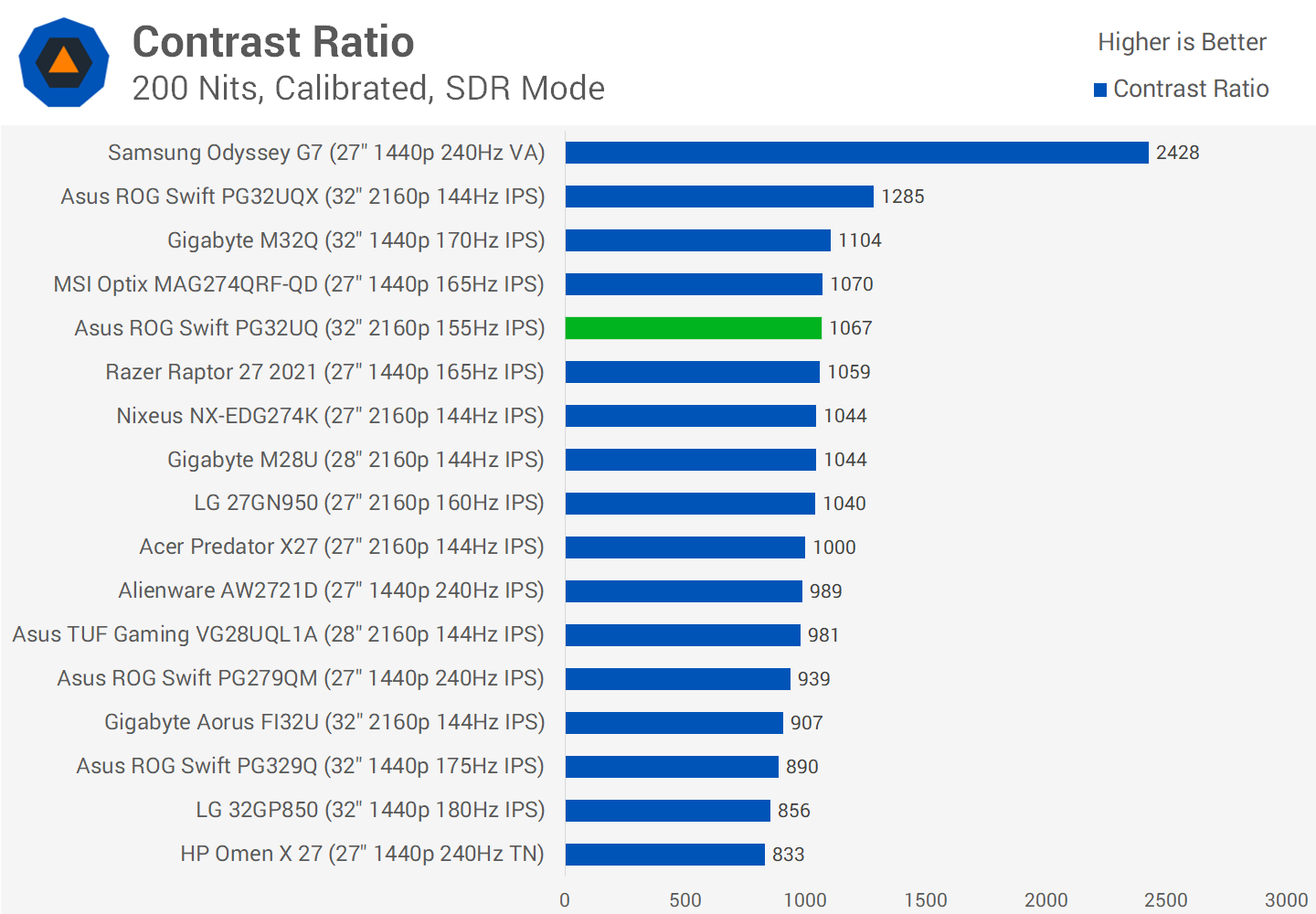 I recorded quite a decent contrast ratio for an IPS panel with the PG32UQ, and this is without local dimming enabled, which is the default configuration. 1067:1 puts this monitor in the upper end for IPS panels, similar to most modern AU Optronics models and better than the Gigabyte FI32U. However, contrast is still poor in general, as IPS panels are absolutely destroyed in black levels by VA panels and OLEDs.