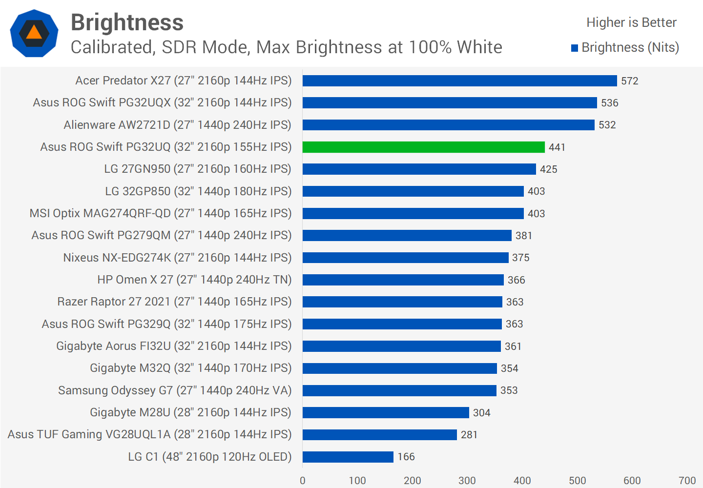 No issues with display brightness as the PG32UQ is capable of 440 nits, higher than most monitors and sufficient for all types of indoor usage. Minimum brightness though is not great, bottoming out at 82 nits so it's not the best display for usage in the dark.