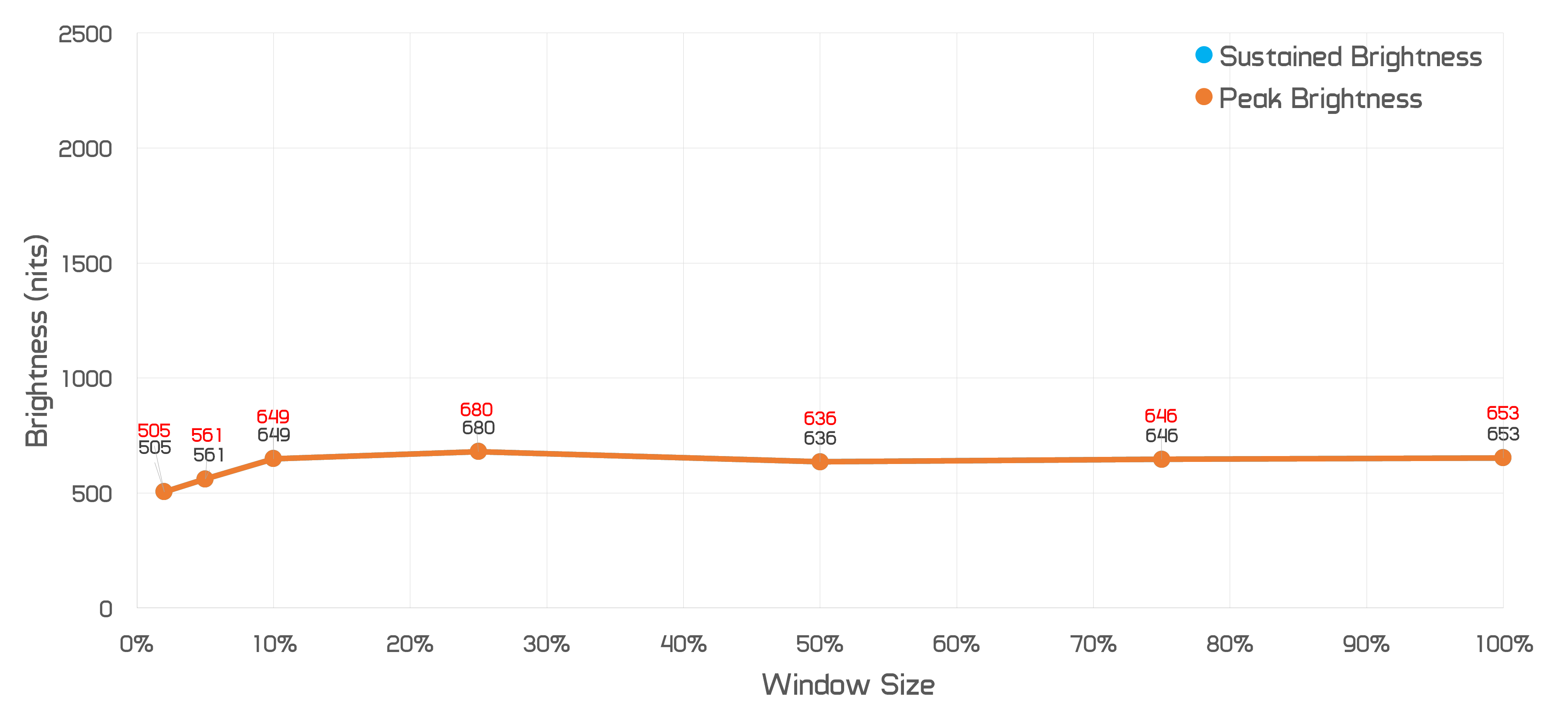 Sustained brightness is solid at a touch over 650 nits which is mid-range for an HDR panel, and obviously about half that of the PG32UQX. Similar brightness at a 10% window, so the PG32UQ appears to cap out at this brightness level. Indeed when measuring both peak and sustained brightness, I reported no difference at all, so the PG32UQ can't push up brightness for short flashes either.