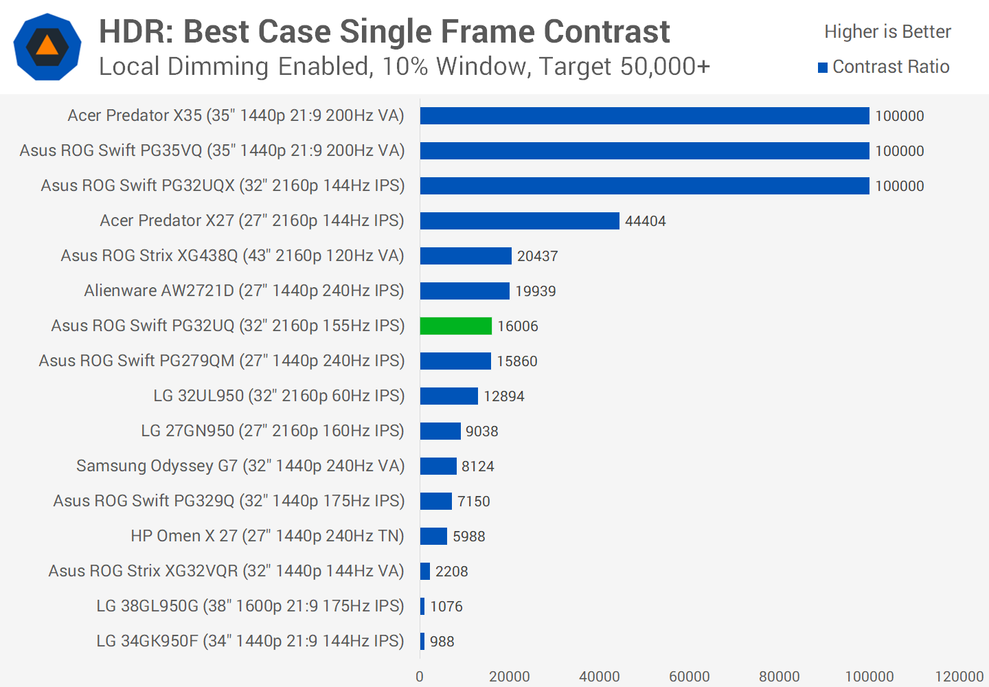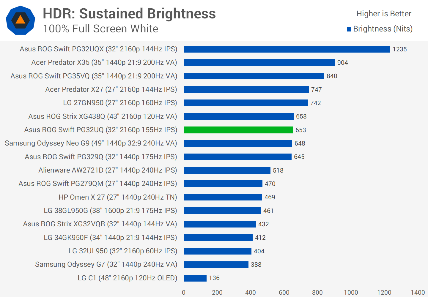 Wrapping up the testing we have HDR performance. The PG32UQ is a semi-HDR panel, because it meets two of the three main criteria for HDR and has limited local dimming functionality. Brightness exceeds 600 nits which is what we want to see, and the panel is capable of a very wide color gamut. However the key area to HDR is contrast, and 16 edge lit dimming zones is not sufficient for true HDR, though it will have some benefit over SDR in ideal conditions.