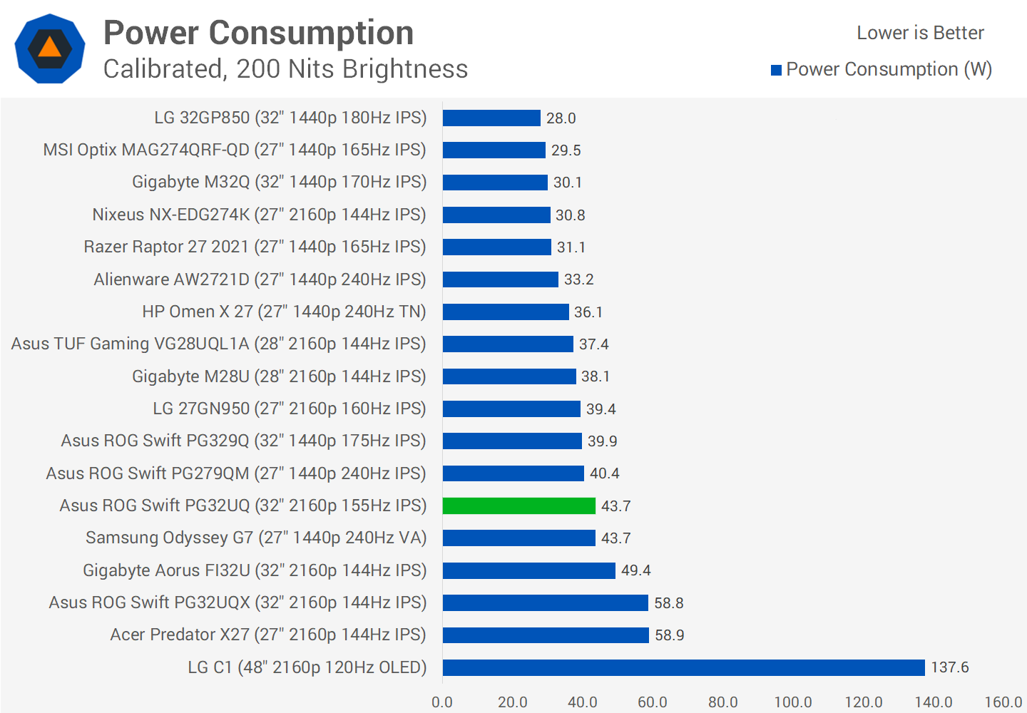Power consumption is as expected. This display is 13% more efficient than the Gigabyte FI32U and a decent 35% more efficient than the PG32UQX, suggesting that dropping the mini-LED backlight and G-Sync module does indeed save a bit of power and heat output.