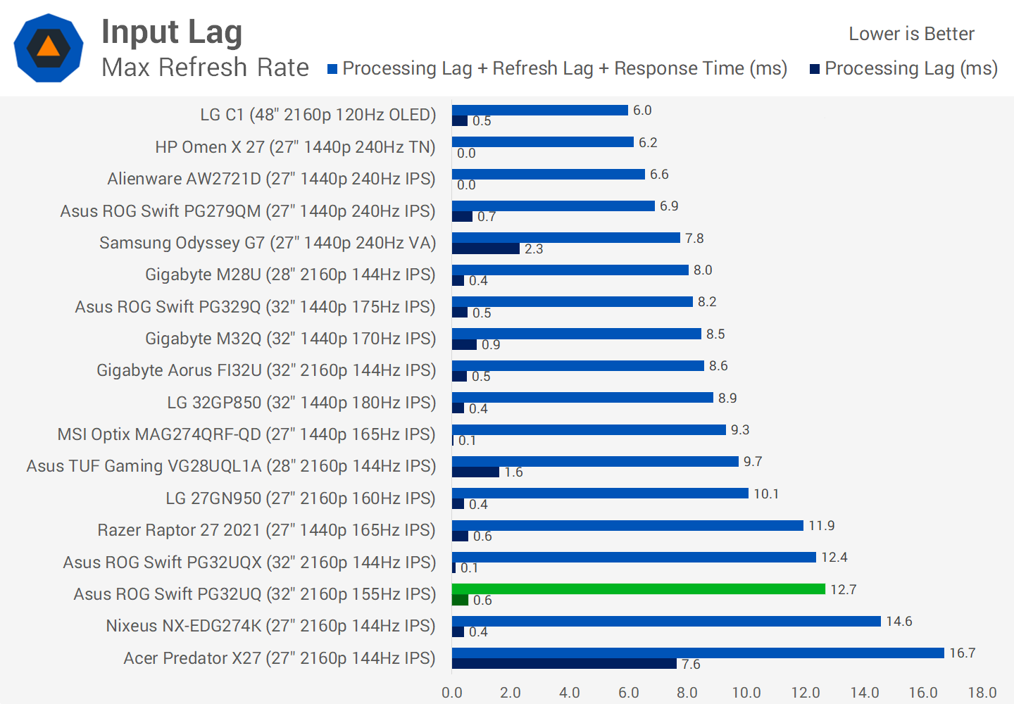 Input latency is low, with a processing delay below 1ms, indicating that most lag you'll get is from the moderate refresh rate and slower response times. The FI32U is a step above here, then of course for the best input lag you're better off with a 1440p 240Hz monitor in this price class.