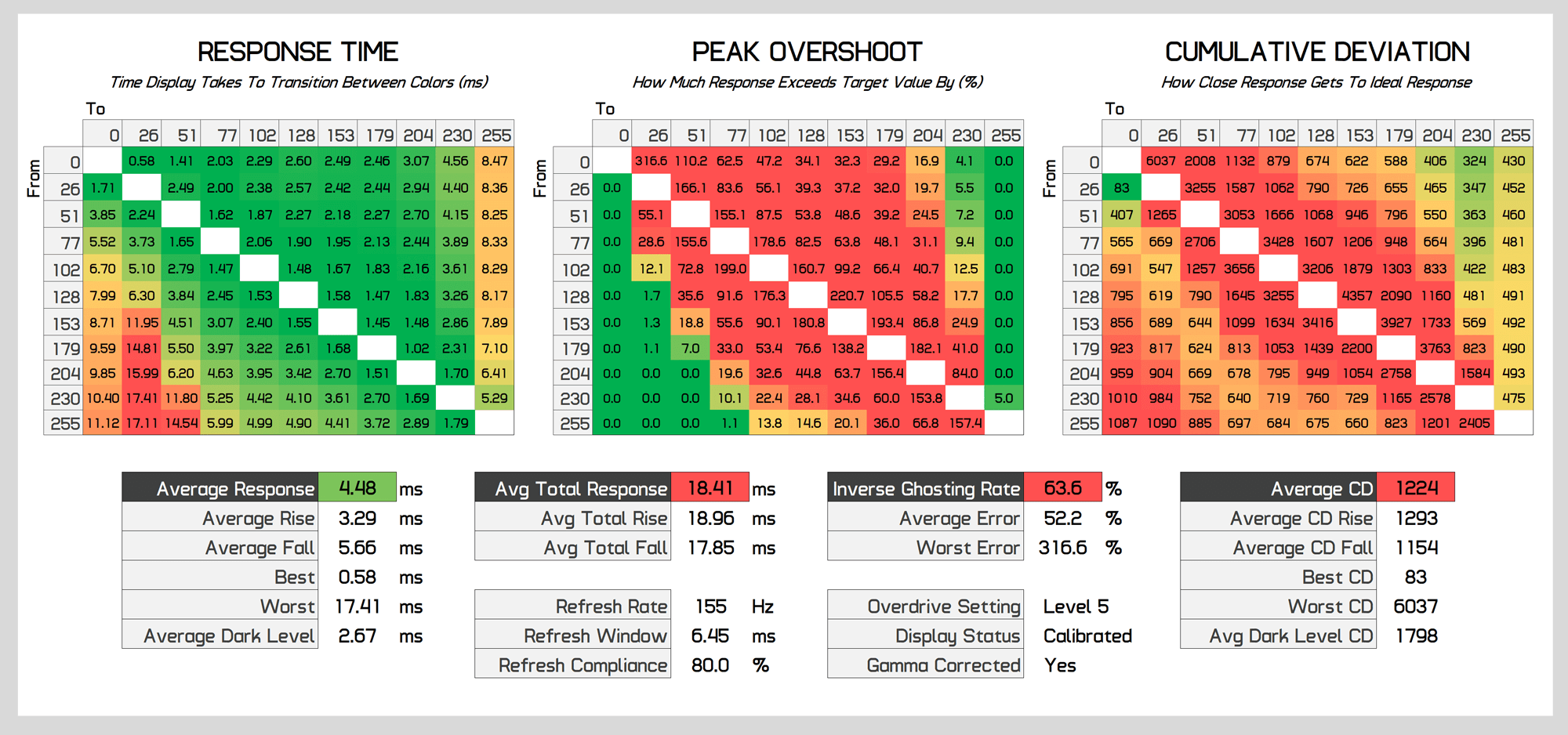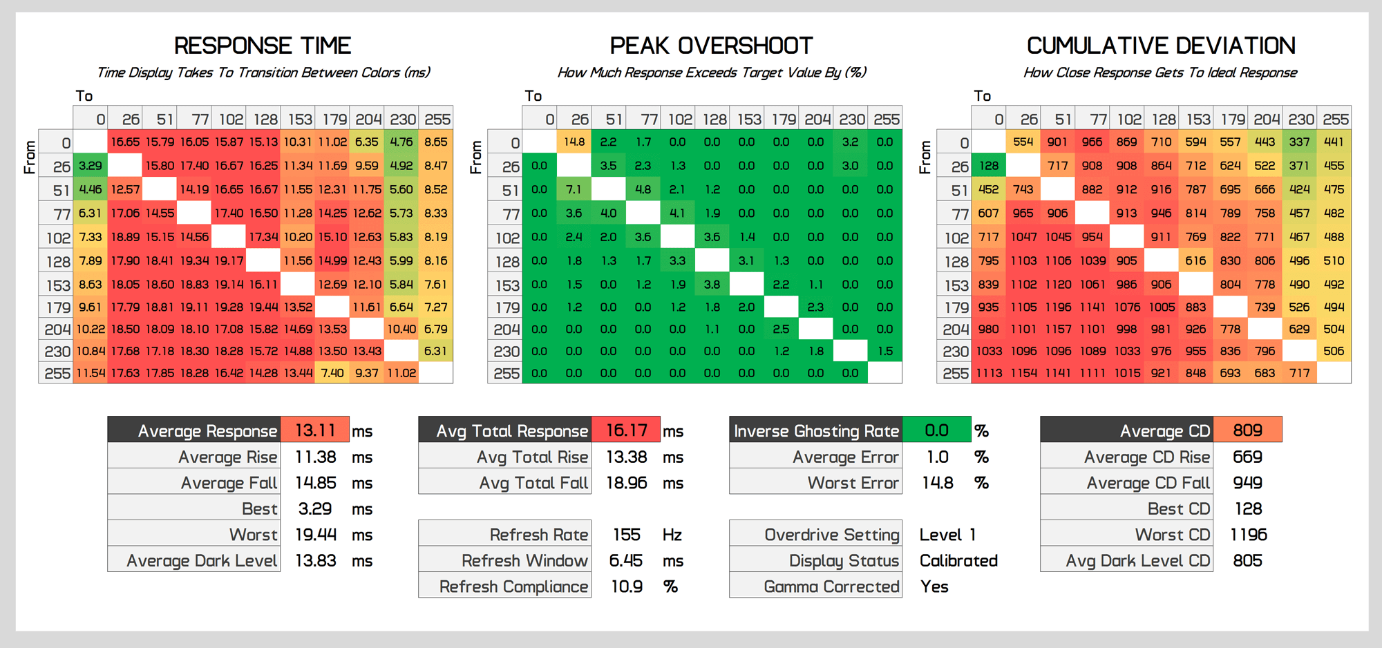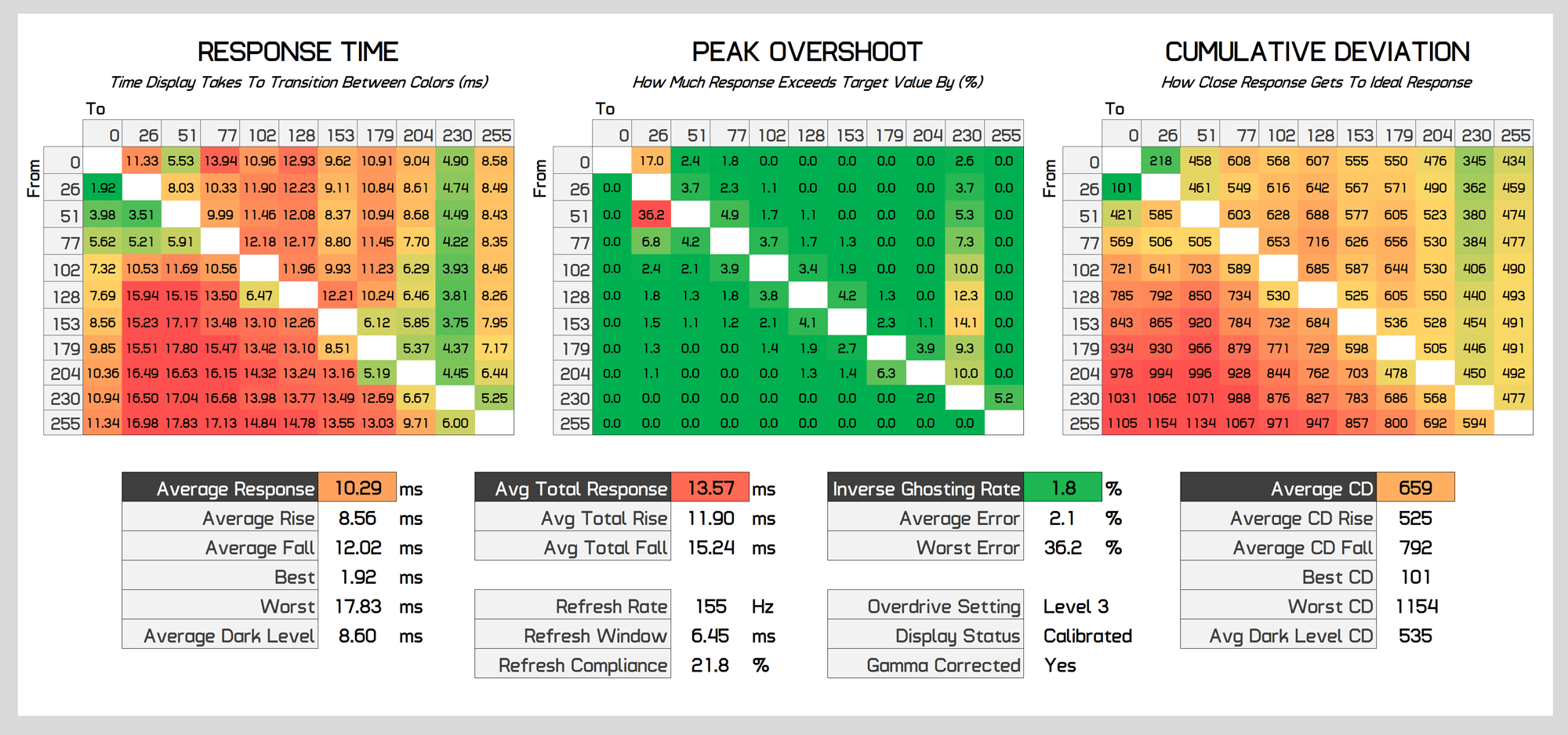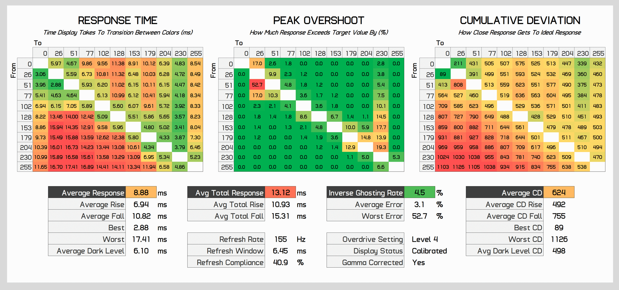 Then we get Level 4 overdrive which improves performance to an 8.88ms average response time and this only comes at the expense of a slight increase to overshoot. With cumulative deviation decreasing now to 624, this is the best overdrive mode we've tested so far and the ideal mode for gaming at 155Hz. Unfortunately though, this mode still isn't that fast and refresh compliance below 50% is disappointing, suggesting perhaps the panel isn't quite fast enough for gaming at this refresh rate.