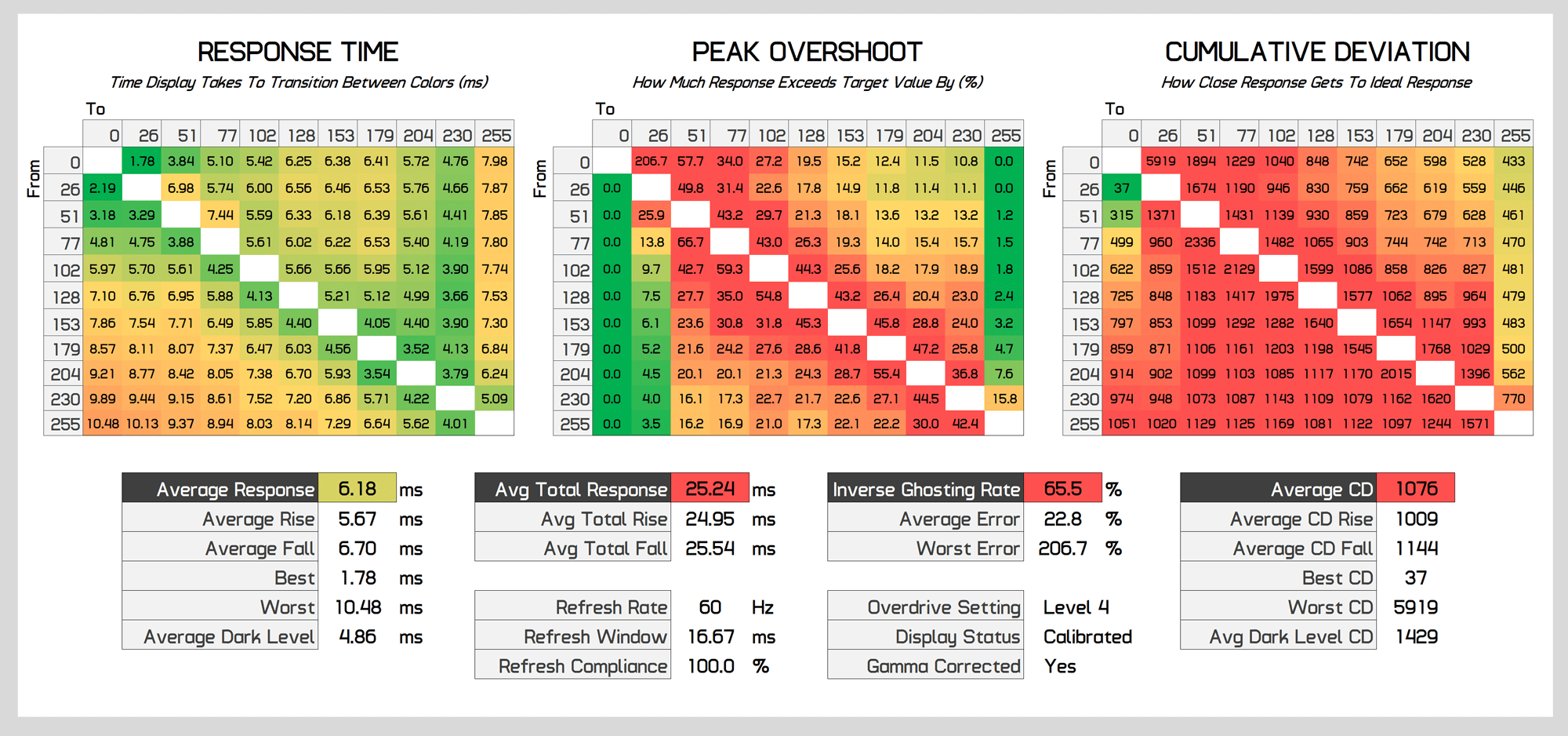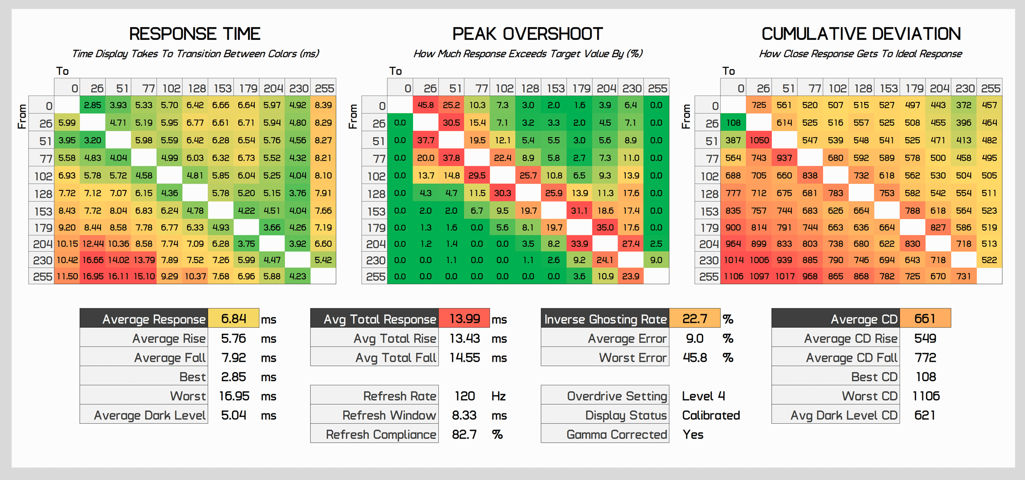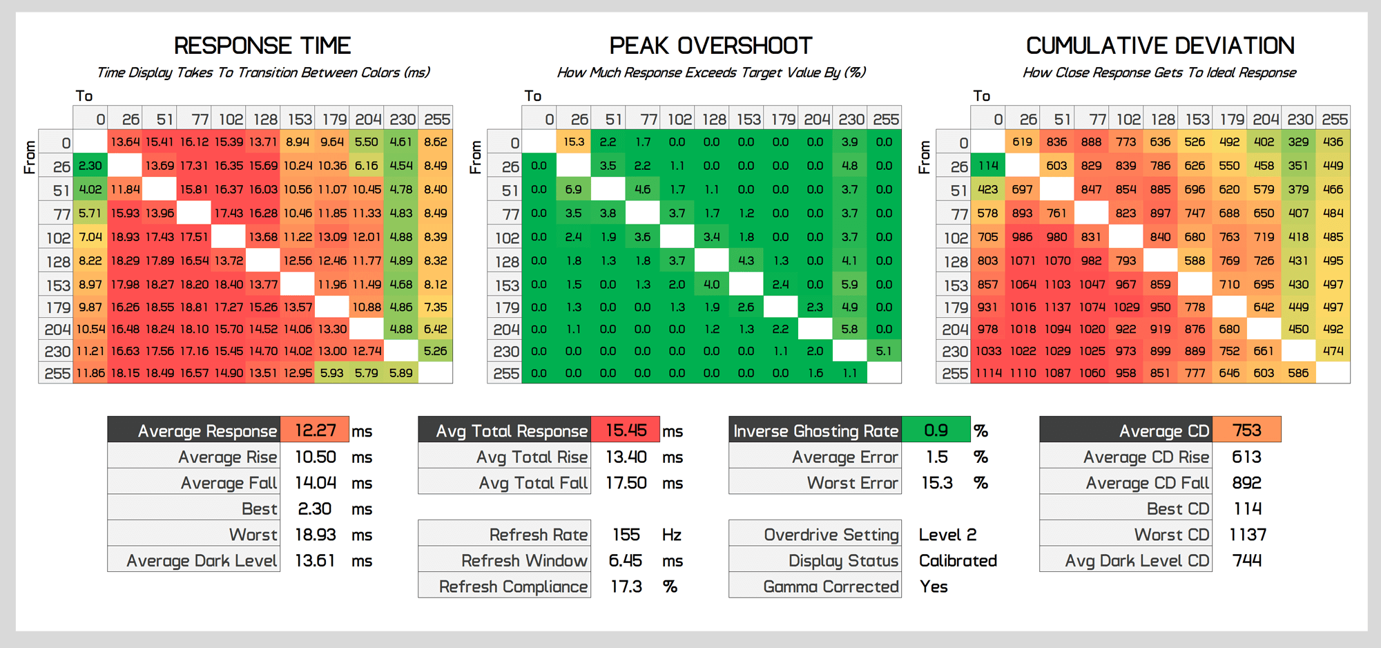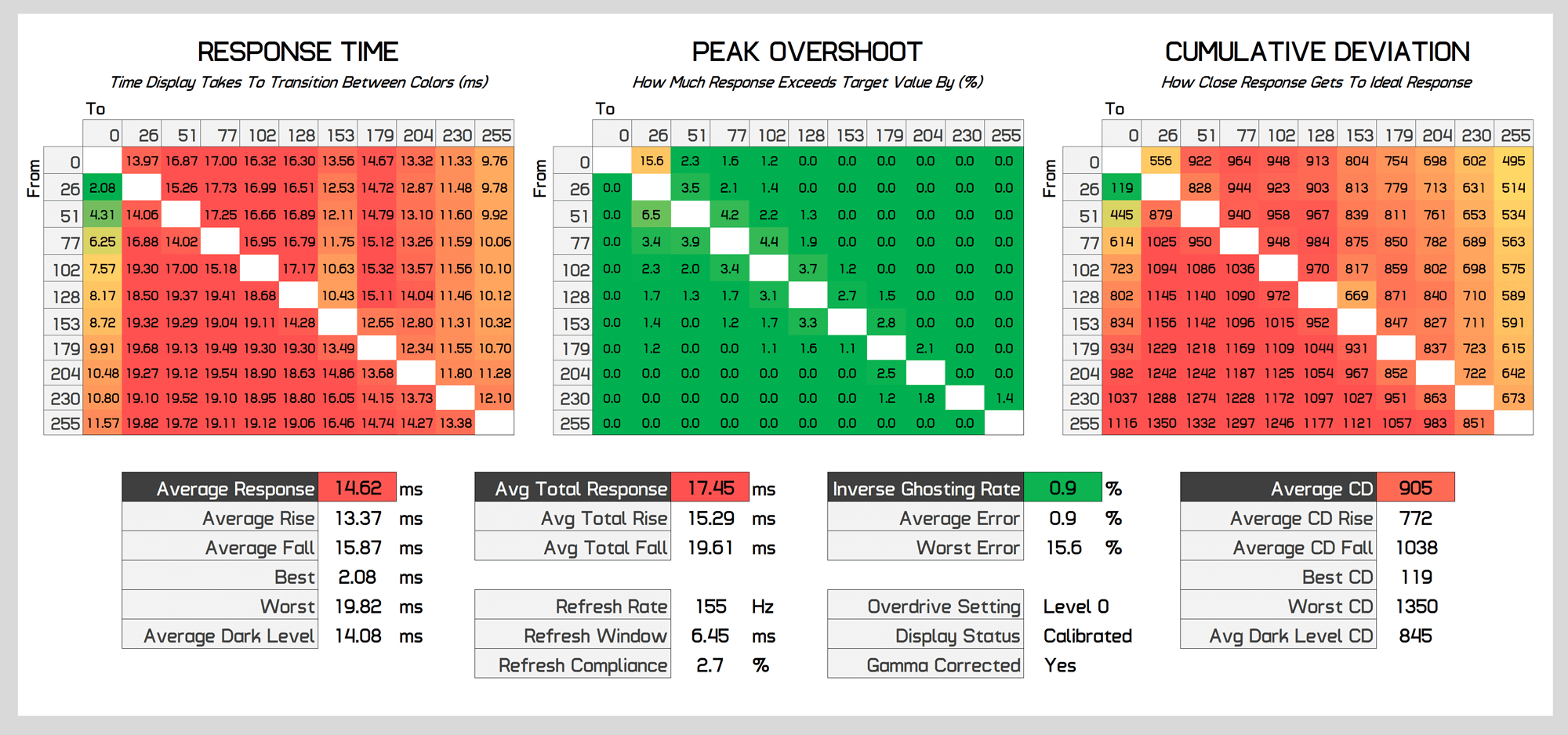 Then we get Level 4 overdrive which improves performance to an 8.88ms average response time and this only comes at the expense of a slight increase to overshoot. With cumulative deviation decreasing now to 624, this is the best overdrive mode we've tested so far and the ideal mode for gaming at 155Hz. Unfortunately though, this mode still isn't that fast and refresh compliance below 50% is disappointing, suggesting perhaps the panel isn't quite fast enough for gaming at this refresh rate.