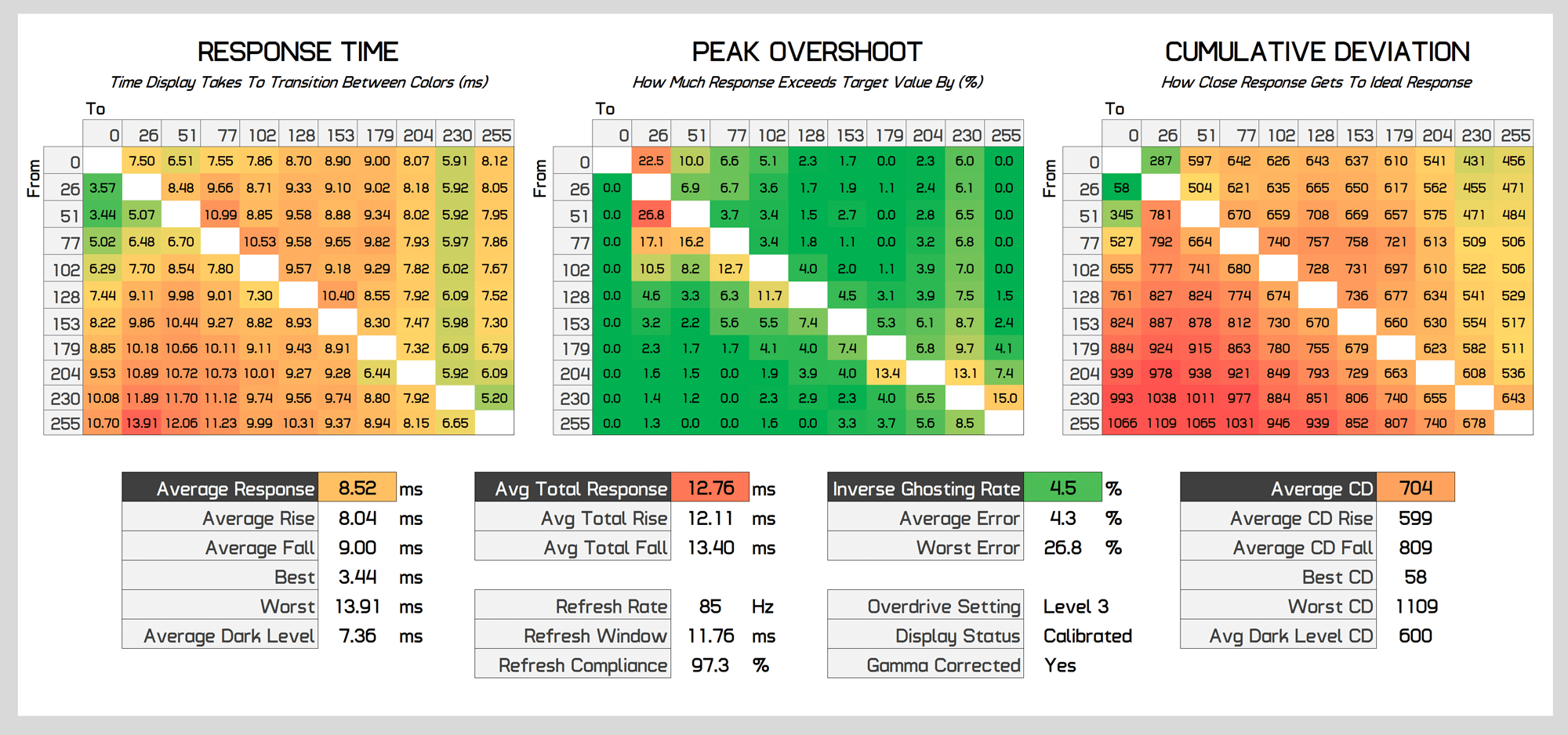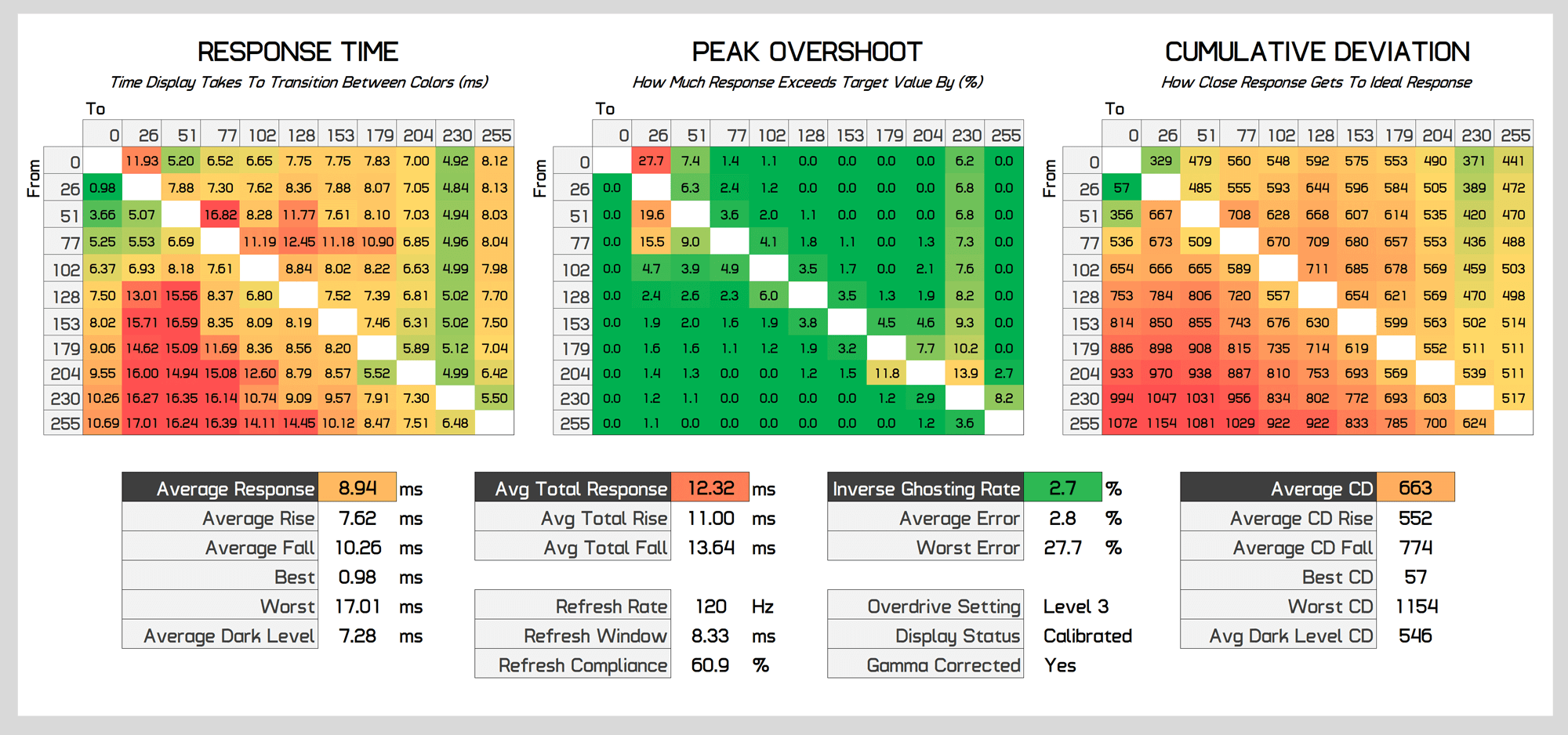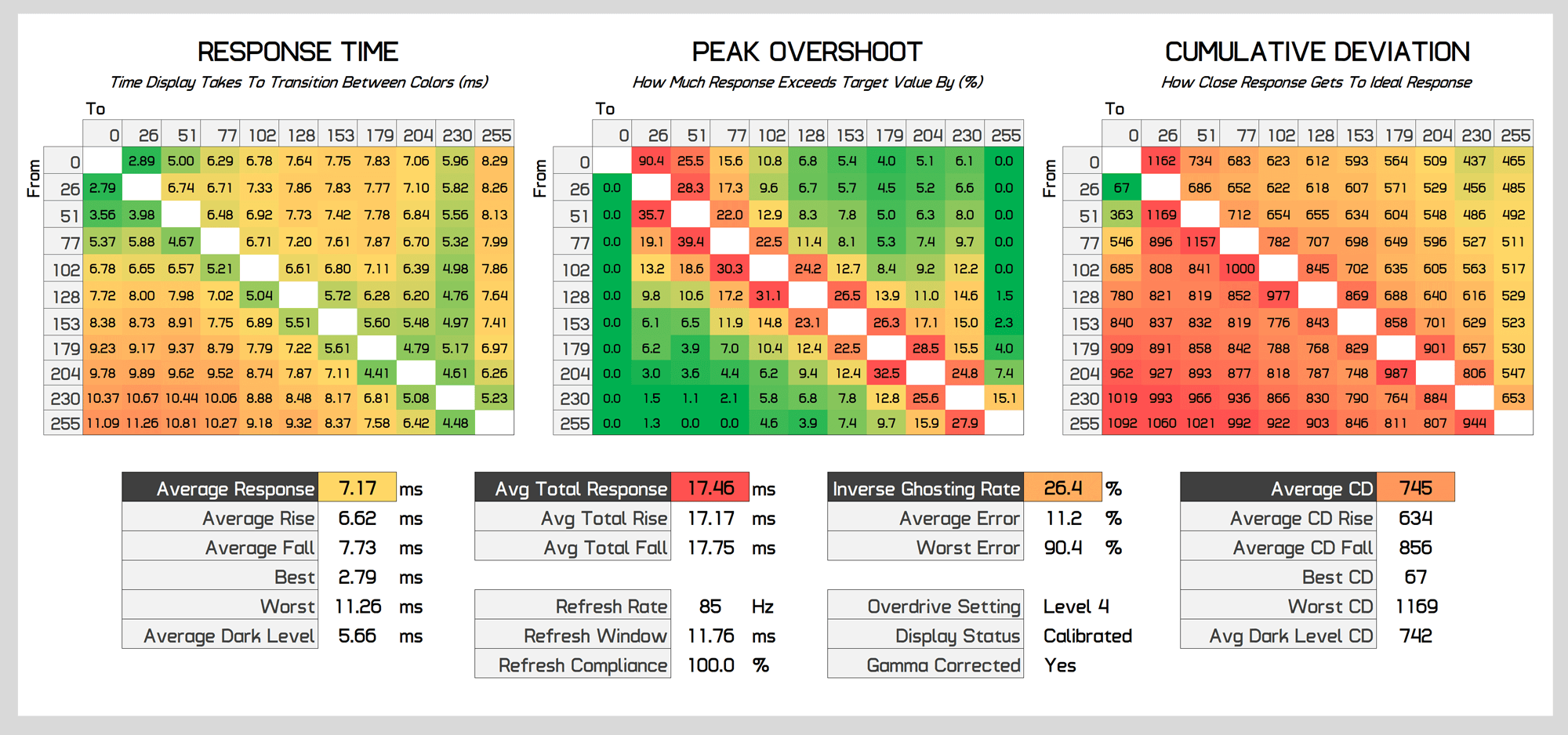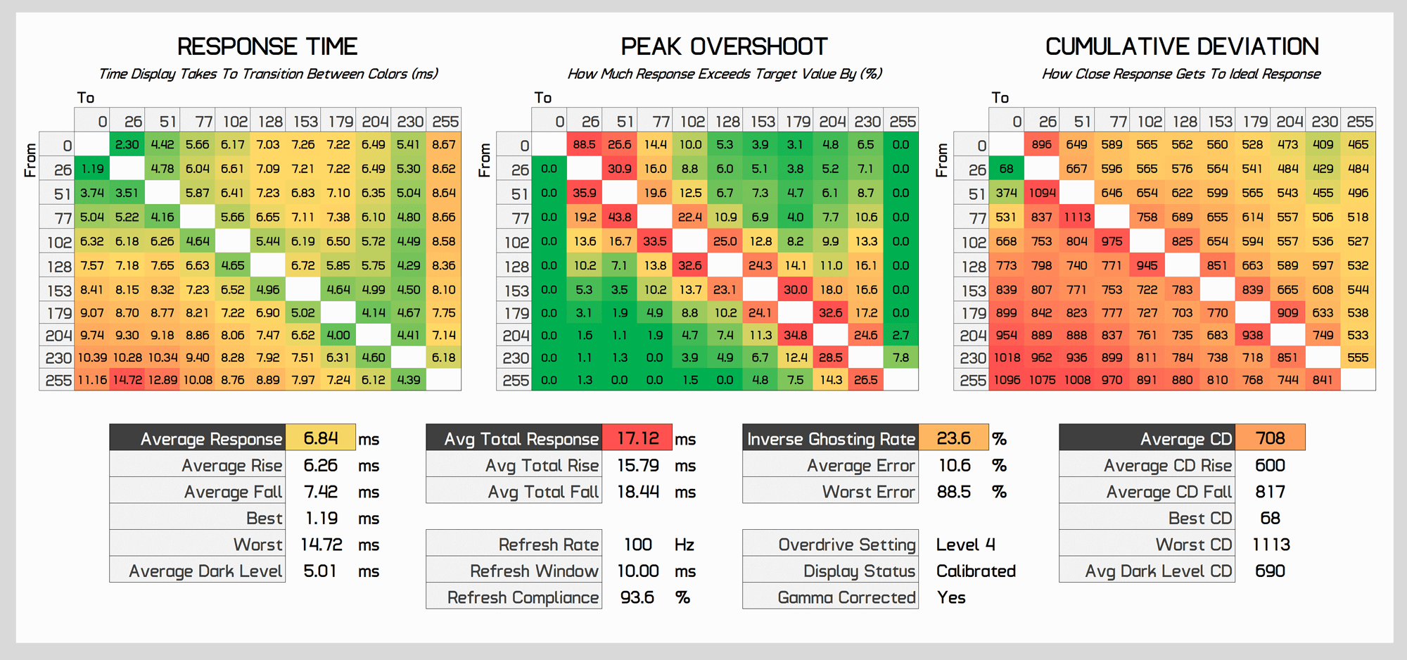 Then we get Level 4 overdrive which improves performance to an 8.88ms average response time and this only comes at the expense of a slight increase to overshoot. With cumulative deviation decreasing now to 624, this is the best overdrive mode we've tested so far and the ideal mode for gaming at 155Hz. Unfortunately though, this mode still isn't that fast and refresh compliance below 50% is disappointing, suggesting perhaps the panel isn't quite fast enough for gaming at this refresh rate.