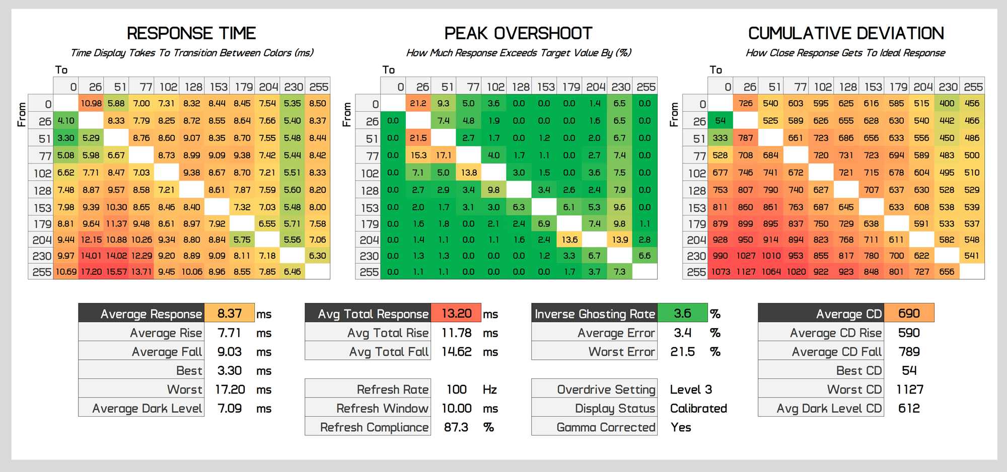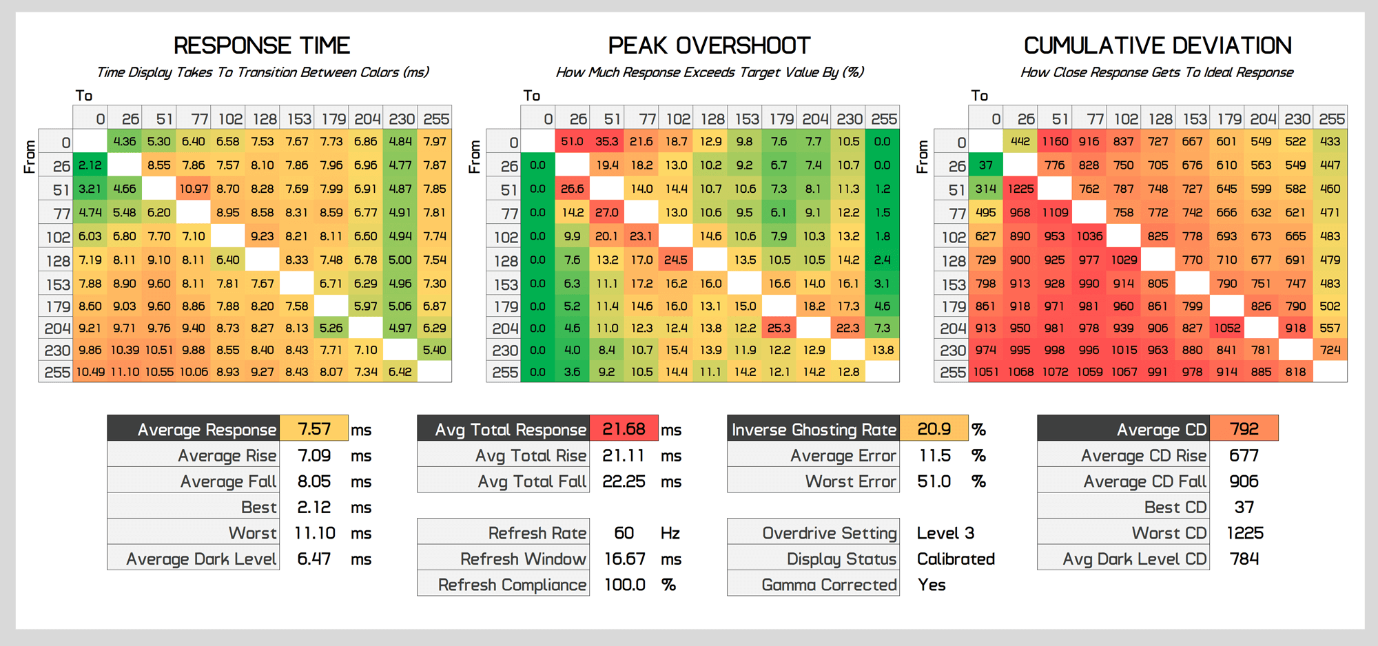 The other alternate option is to use Level 3 overdrive. This mode is a little bit slower at the top end, but consistently has less overshoot, and at 100Hz and below actually has the lowest cumulative deviation value which suggests it produces slightly better visuals. There is still a fall off in performance at 60Hz but this time it's much more manageable with less overshoot so this is definitely the more optimal mode to use at 60Hz.
