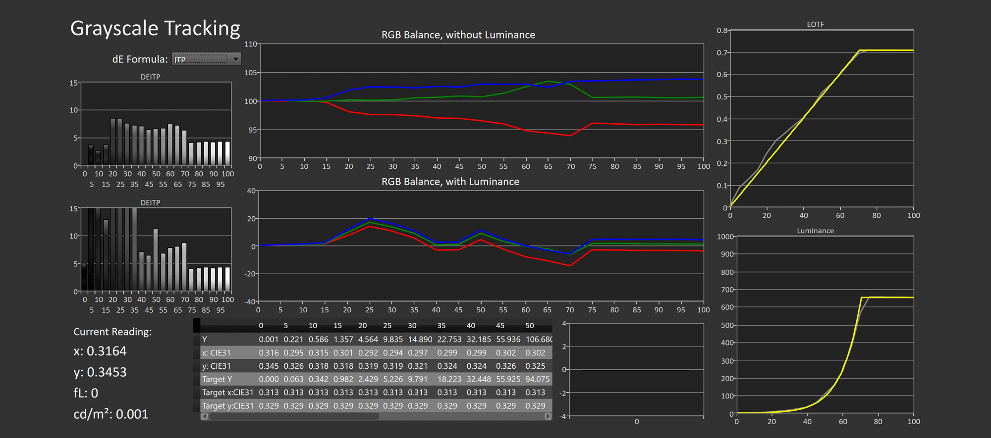 For HDR accuracy, greyscale tracking is mediocre for lower luminance values: anything below 30 nits is too bright when displayed on the PG32UQ, and black levels (below 2 nits) are raised as well which seems to be an effect of the backlight not being able to dim itself enough. Basically the bottom 5% of the HDR tone curve cannot be displayed at all on the PG32UQ in most situations as the minimum brightness level of the backlight is too high, which leads to these raised blacks. Above 30 nits though, luminance tracking is good and roll-off around 650 nits is very good.