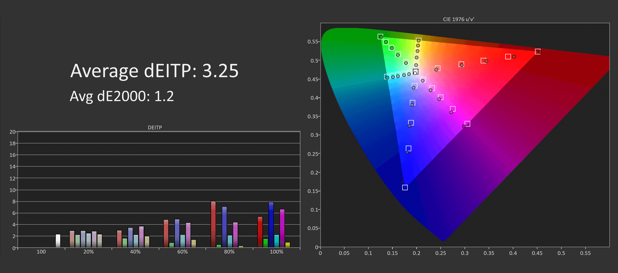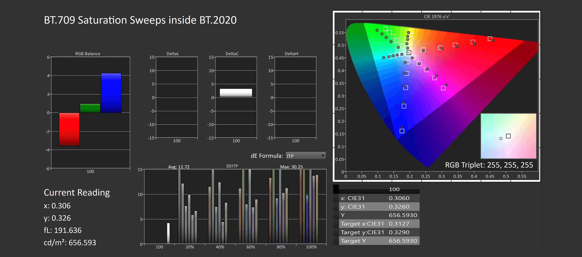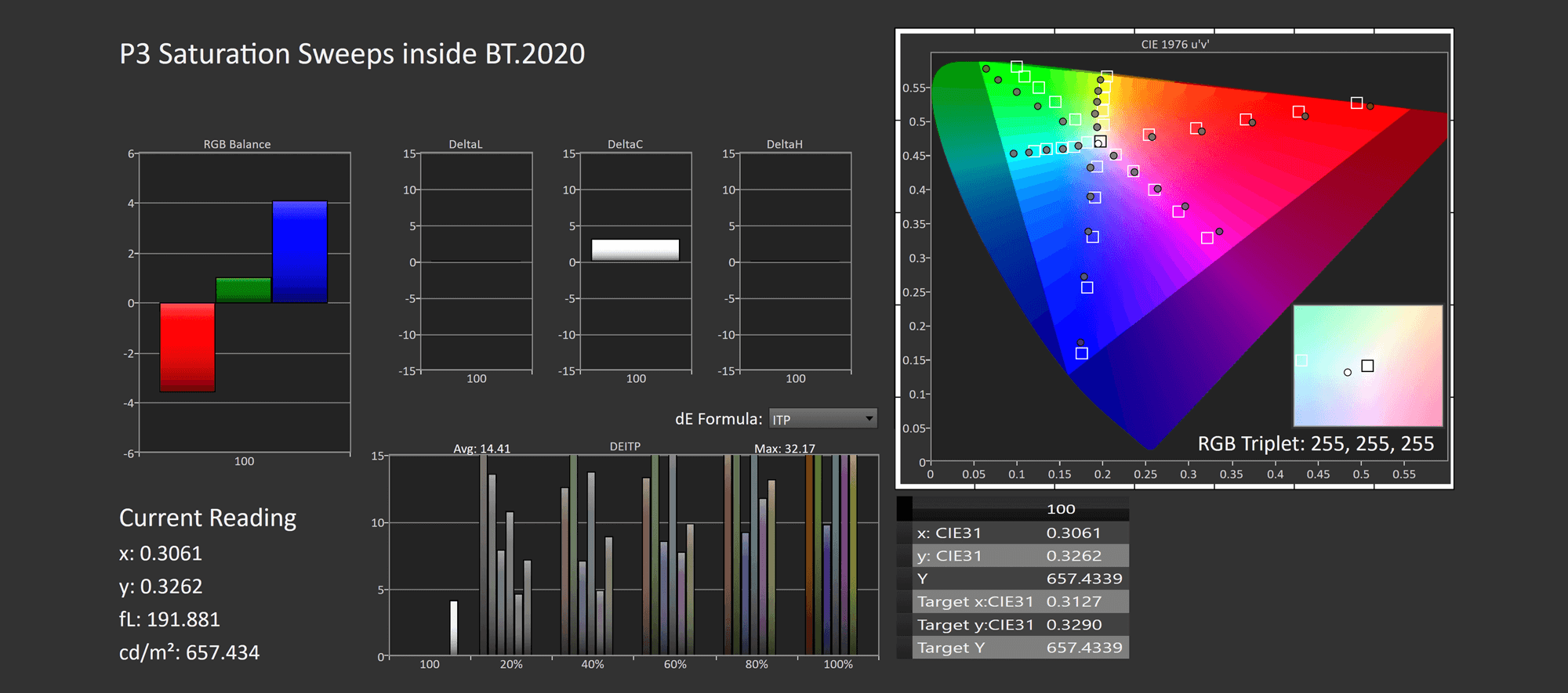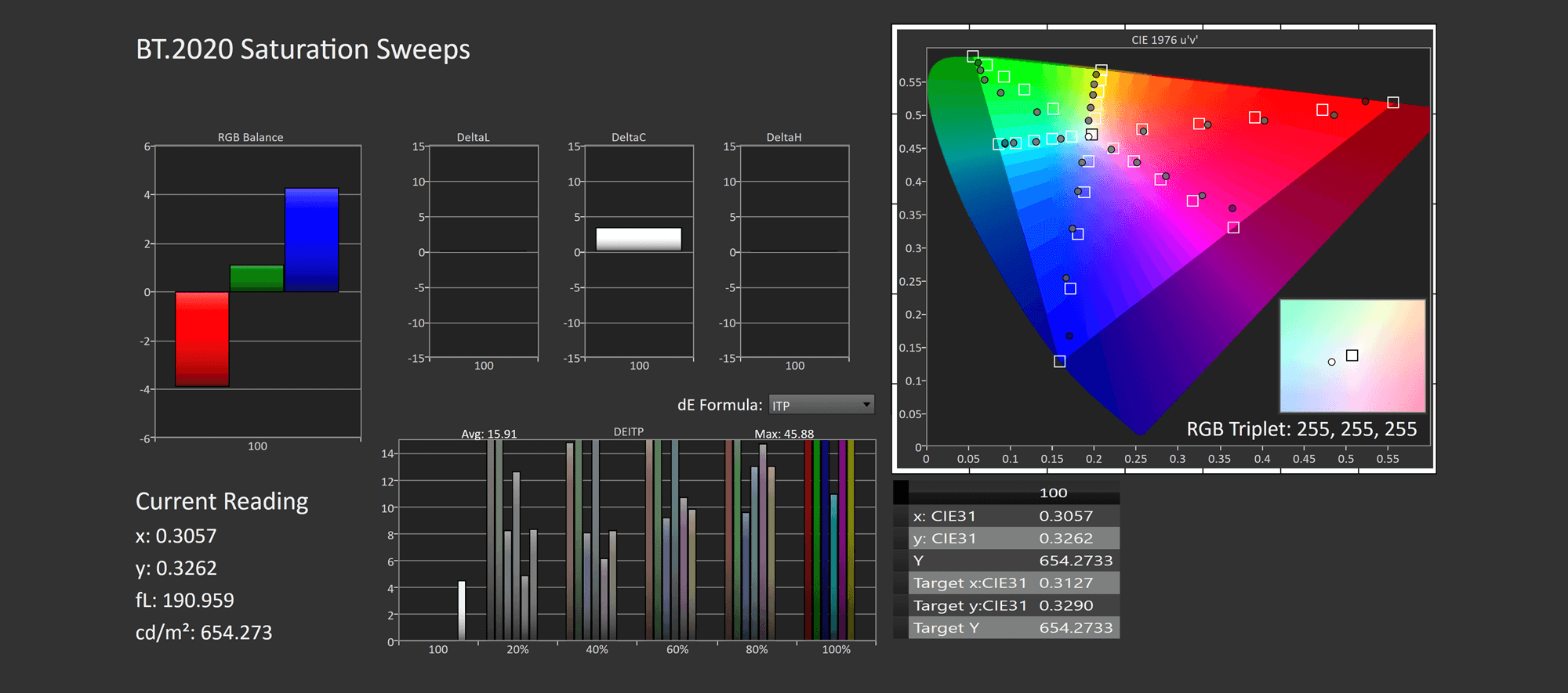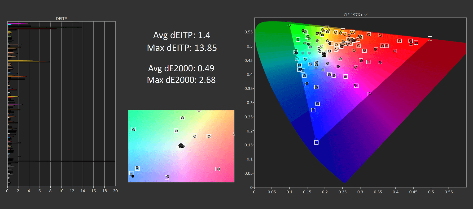 Saturation accuracy for BT.2020 isn't great despite covering a lot of this color space. P3 and Rec. 709 inside HDR are also a bit oversaturated, especially for greens, but not horrendous. Would have liked to see a bit better accuracy here as this cannot be calibrated, but given the rest of the panel's HDR performance this is fine.