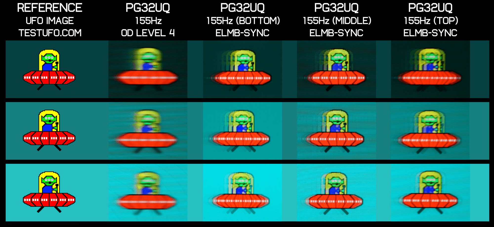 The PG32UQ does support backlight strobing through ELMB-Sync, meaning it can be used with or without adaptive sync enabled. When it's used with adaptive sync, this is one of the better implementations I've seen from Asus, it looks like they've put some work in here to reduce the blur that was in this mode previously. The PG32UQ still has some strobe crosstalk as the panel itself isn't fast enough to keep up with the strobing, and you can't tune strobe length or brightness in this mode, but you can adjust the clarity position. This is handy because there's a limited range where you get the best clarity, in the default middle position there is a lot more crosstalk in the top and bottom sections of the monitor.