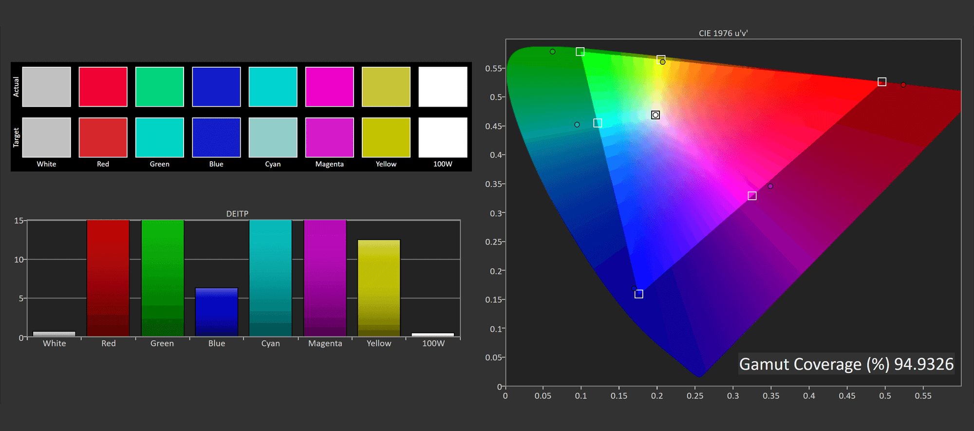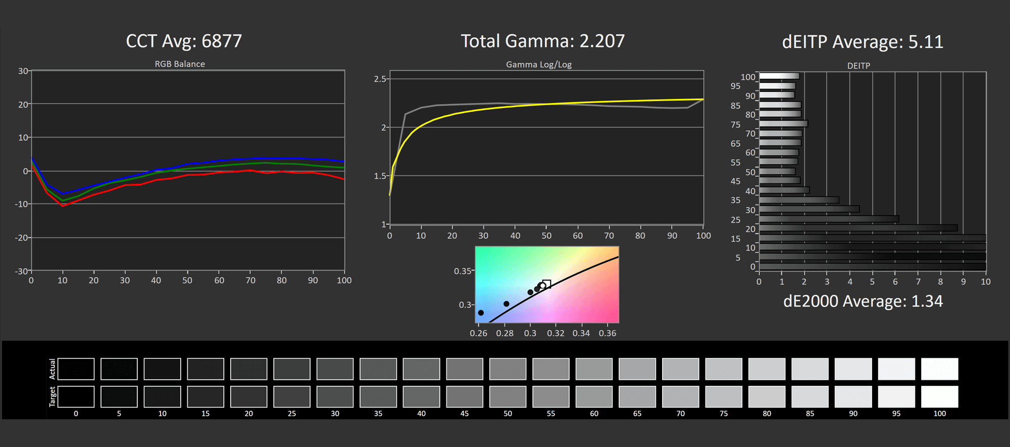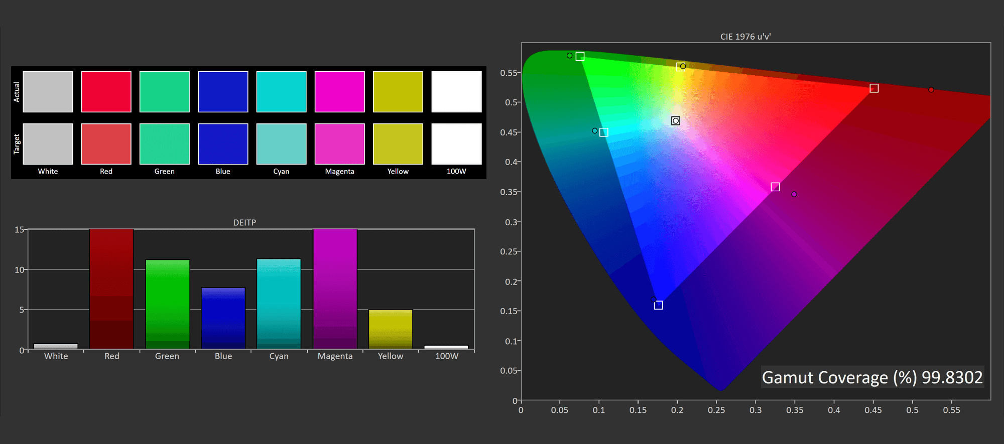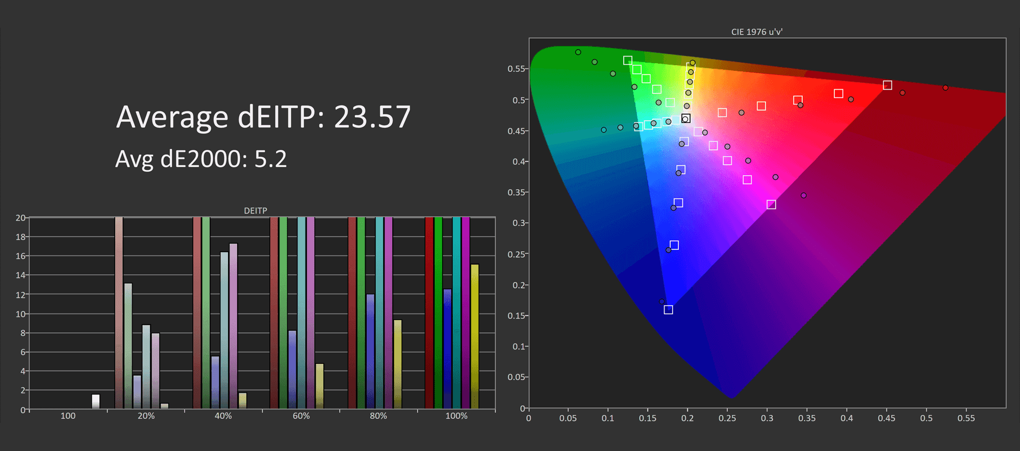 You can see this play out in calibration comparisons. Greyscale results are pretty good, in the upper portion of the chart, but ColorChecker results are totally inaccurate as the wide gamut is left unclamped by default.