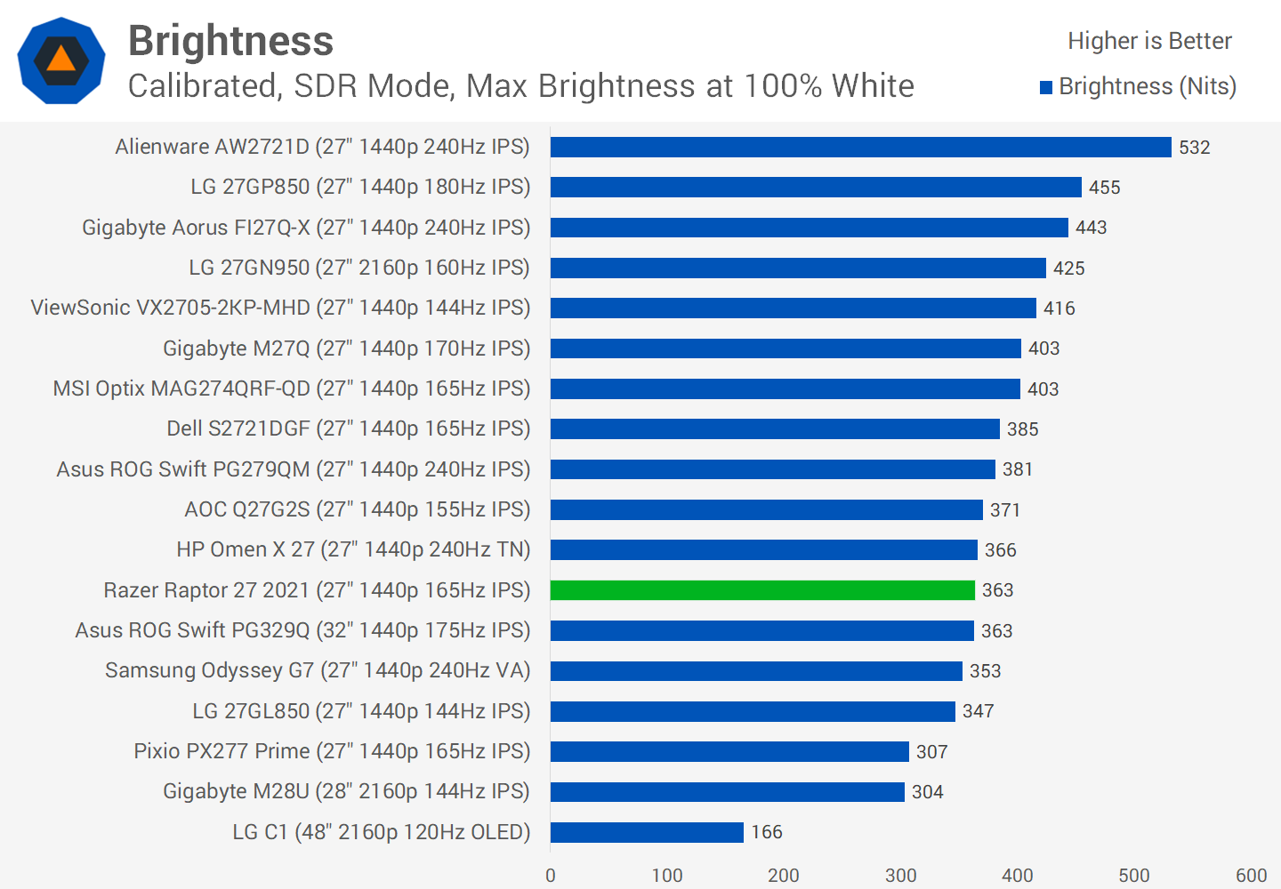 The Raptor 27's peak SDR brightness is acceptable at 363 nits, though this falls short of the 380 nits Razer advertises. The only way to increase brightness beyond this figure is to run the monitor in the HDR mode, which can do approximately 450 nits. This will artificially make the HDR mode look brighter and subjectively "better" despite this display not including proper HDR hardware like local dimming. Minimum brightness is pretty good, at 40 nits.