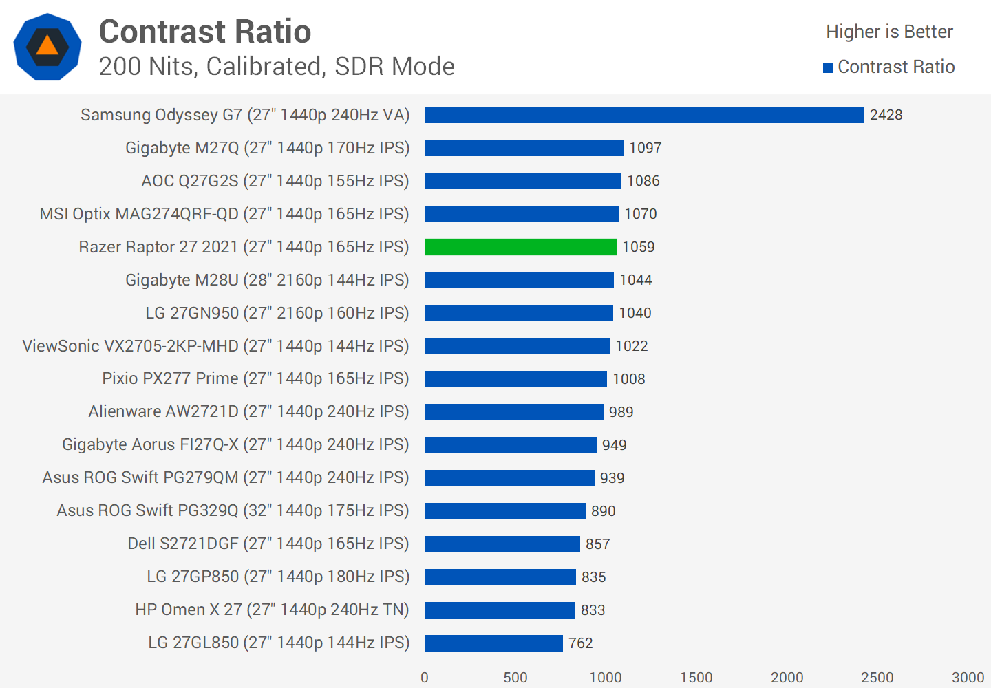 Contrast ratio is okay for an IPS panel at a little above 1000:1, although it's still an IPS-level contrast ratio, so it's quite a lot worse than today's VA panels like the Samsung Odyssey G7, and that means dark levels aren't great. Still, as Razer don't appear to be using an LG panel, you don't have to worry about a sub-1000:1 contrast ratio like with the 27GP850.