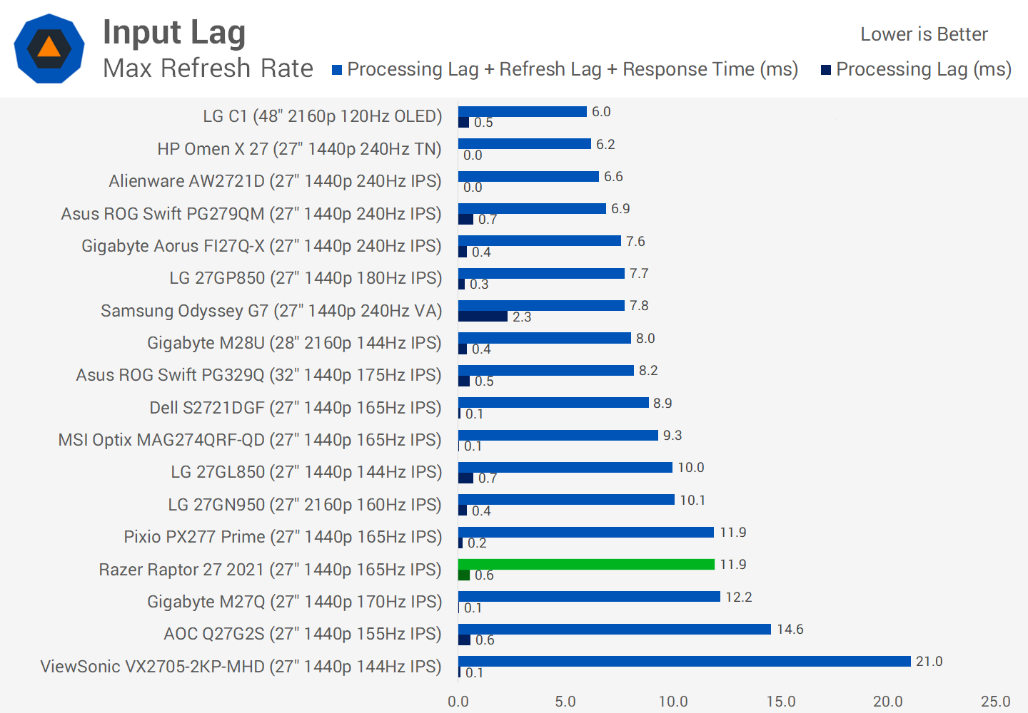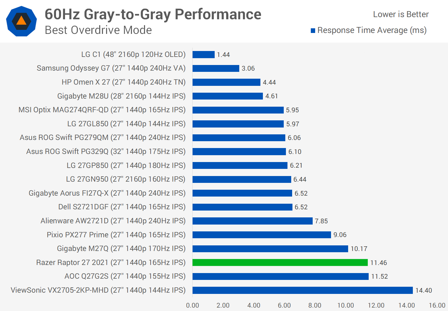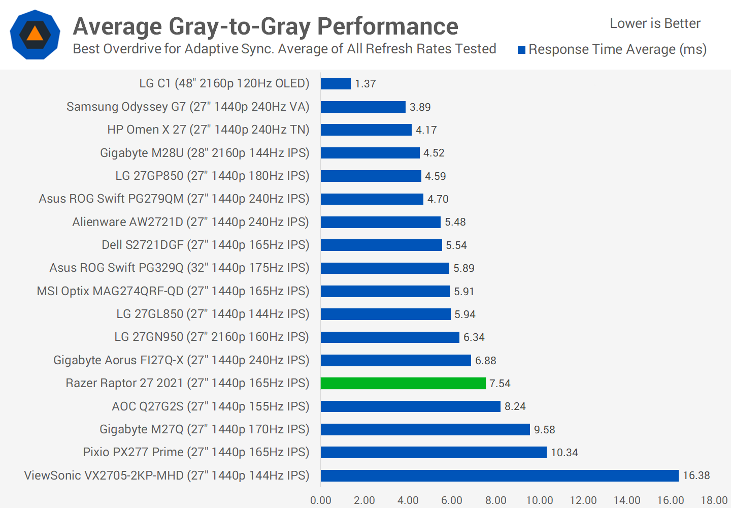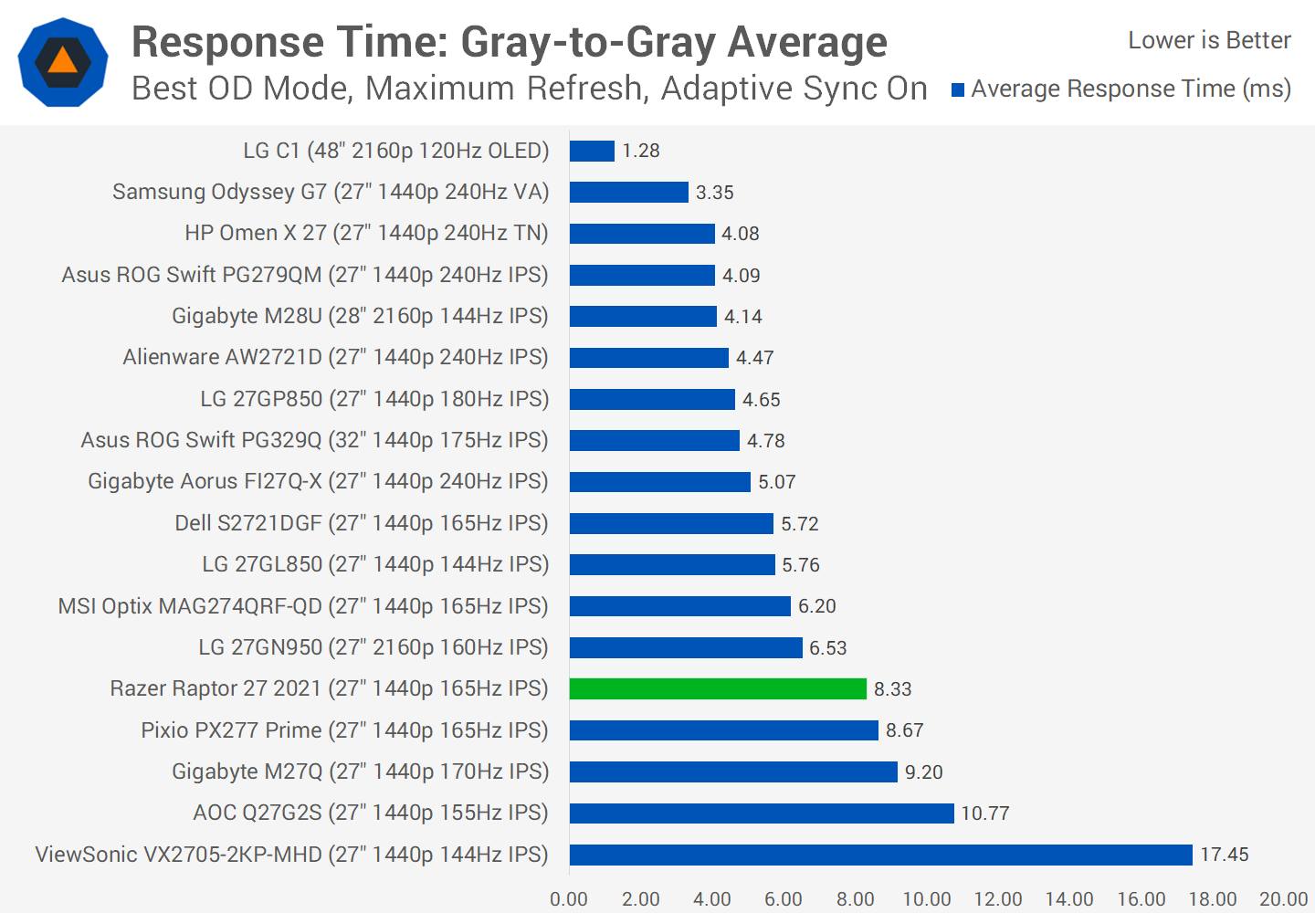 But it gets worse when comparing the Raptor to other monitors, as not only is the variable refresh rate experience bad, it's also a slow monitor relative to others even in the best conditions. It performs similarly to the Pixio PX277 Prime and Gigabyte M27Q which are both around the $350 mark - again the Raptor is an $800 product. The MSI MAG274QRF-QD is 34% faster at 165Hz and this only gets worse with products like the LG 27GP850 providing nearly 80% faster transition times. Ouch.