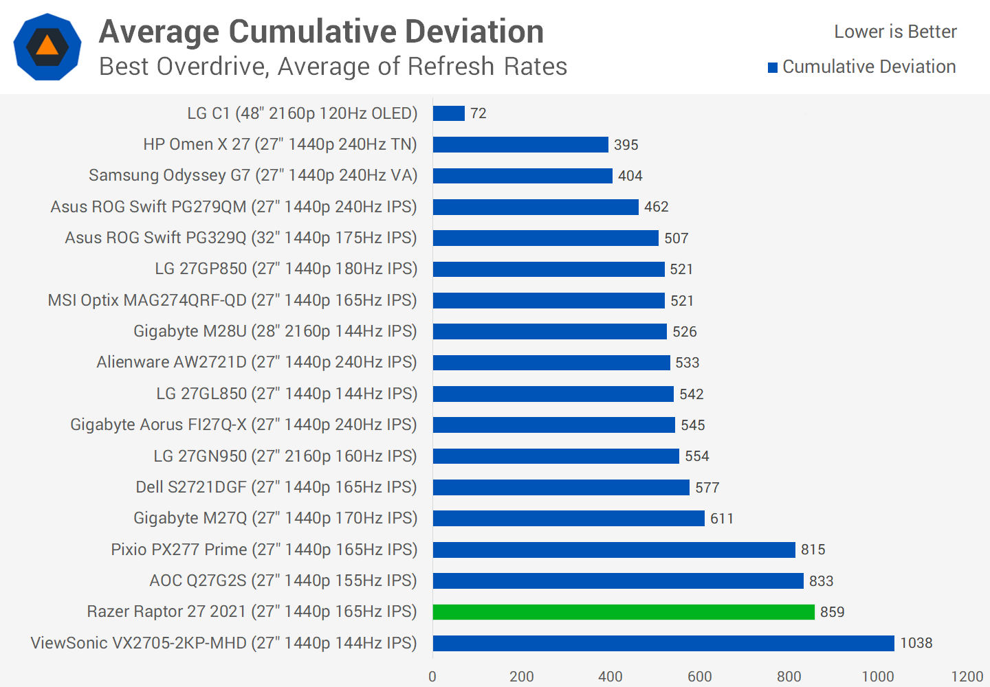 This comes across well in the cumulative deviation numbers, which show the balance of overshoot and response times in a single number, while also telling us how close a monitor gets to the ideal instant response time. The Razer Raptor 27 is astonishingly bad for an $800 product in this metric, only matching the entry-level Pixio PX277 Prime and getting slaughtered by most modern IPS gaming monitors including the $330 Gigabyte M27Q and basically everything else. A good score for an IPS is around 520, 65% better than what the Raptor 27 is providing.