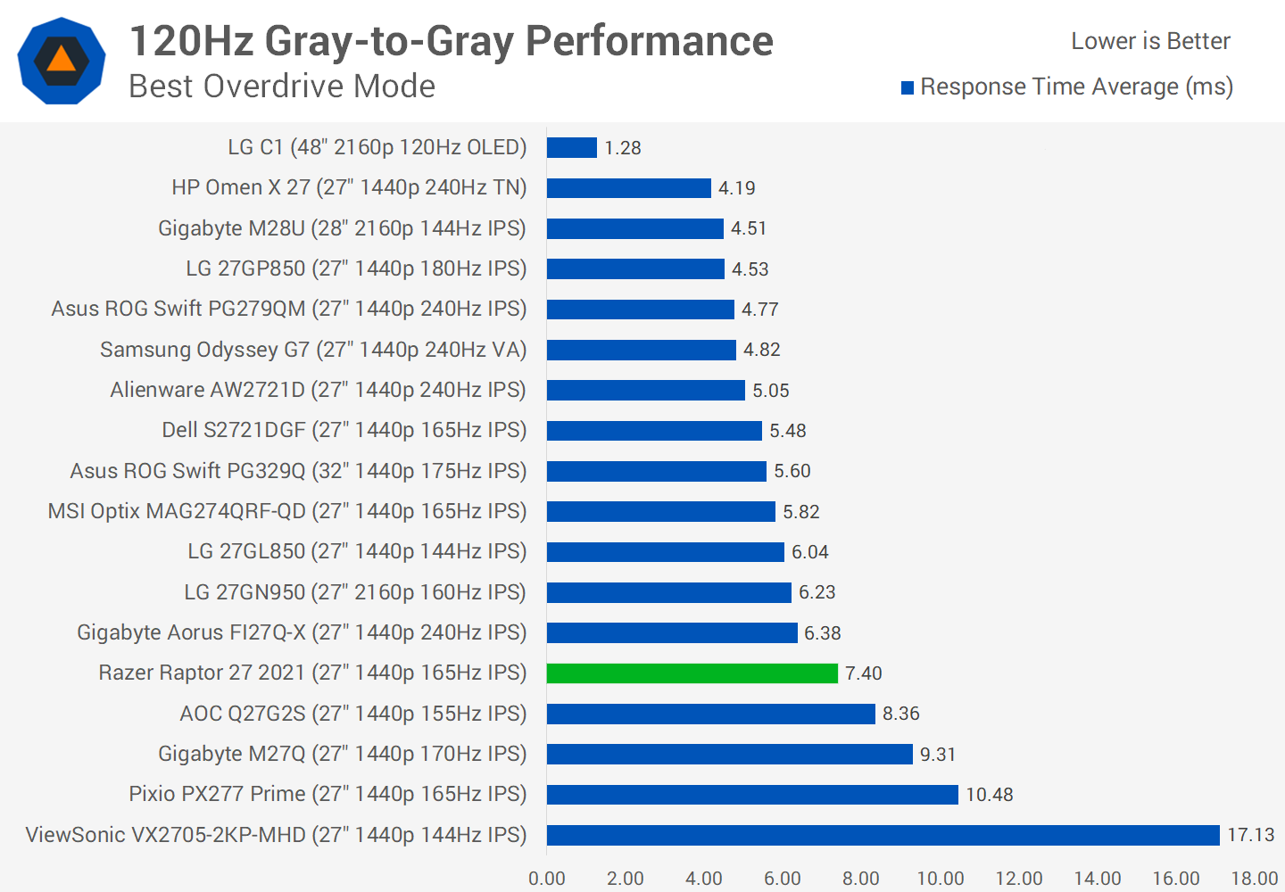 At a fixed 120Hz refresh rate, the Raptor performs poorly, with a slow response time and lots of overshoot. It's no better at 60Hz, where ideally you should turn the overdrive setting down to Weak to get the best performance. Here the Razer monitor is even slower than Gigabyte's entry level and great value M27Q which is ridiculous for a high-end product.