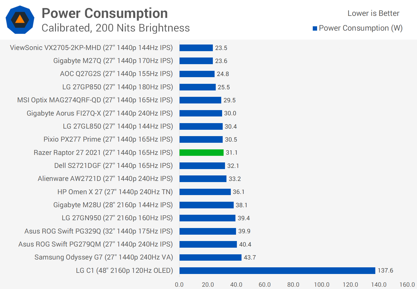 Power consumption is good. Even with the RGB LED light bar enabled, the Raptor 27 consumes a similar amount of power to other monitors with 27-inch screen sizes and similar specifications. So thankfully this is a non issue.