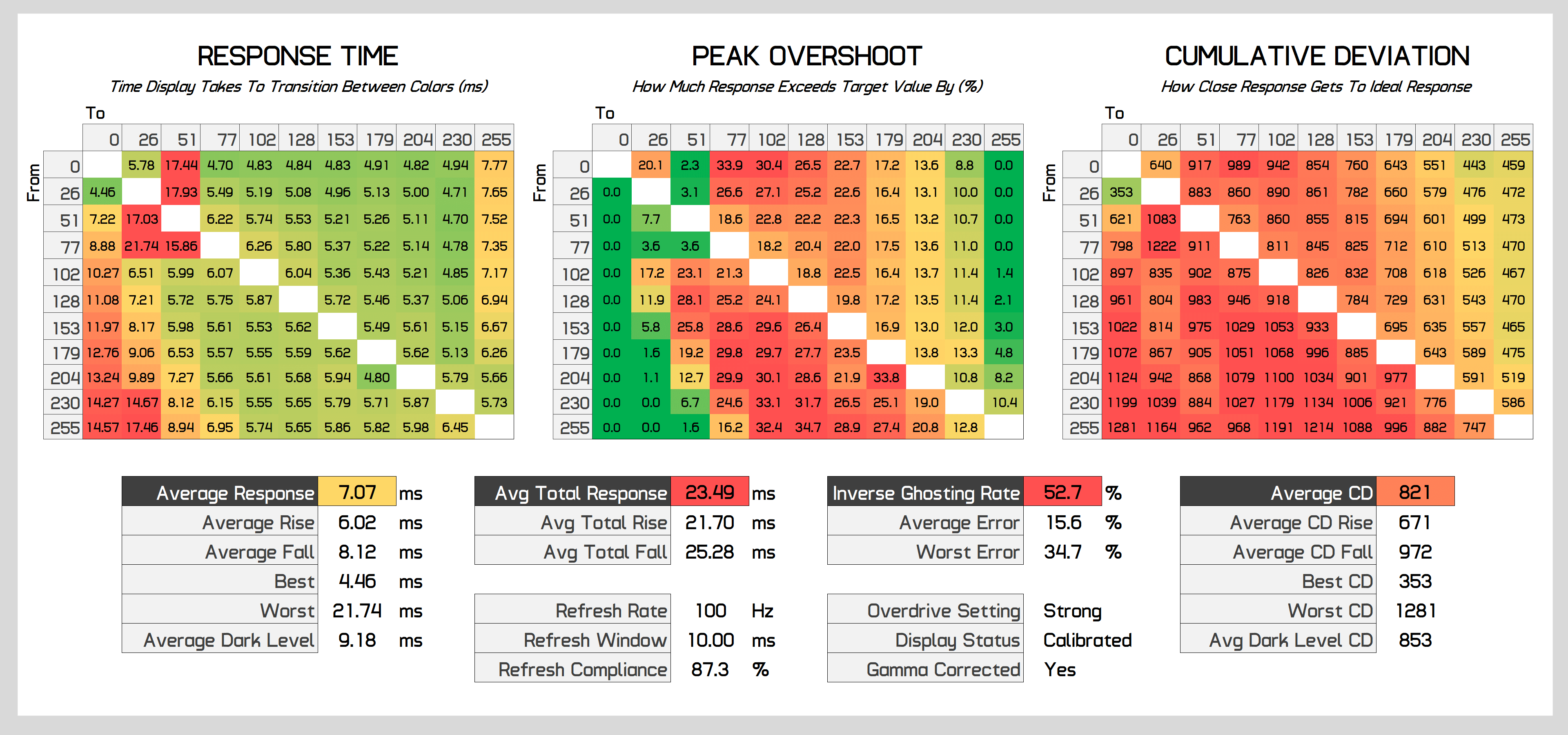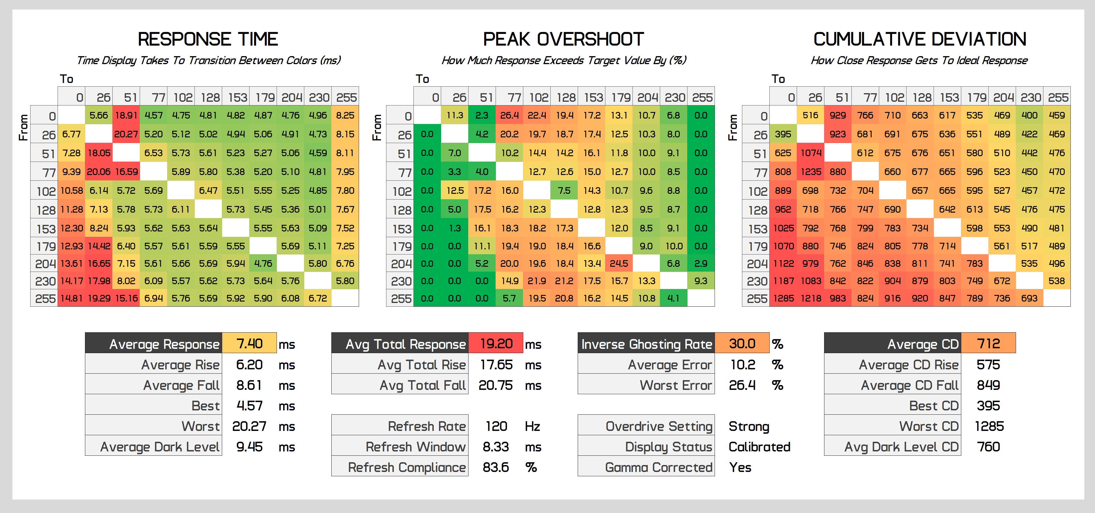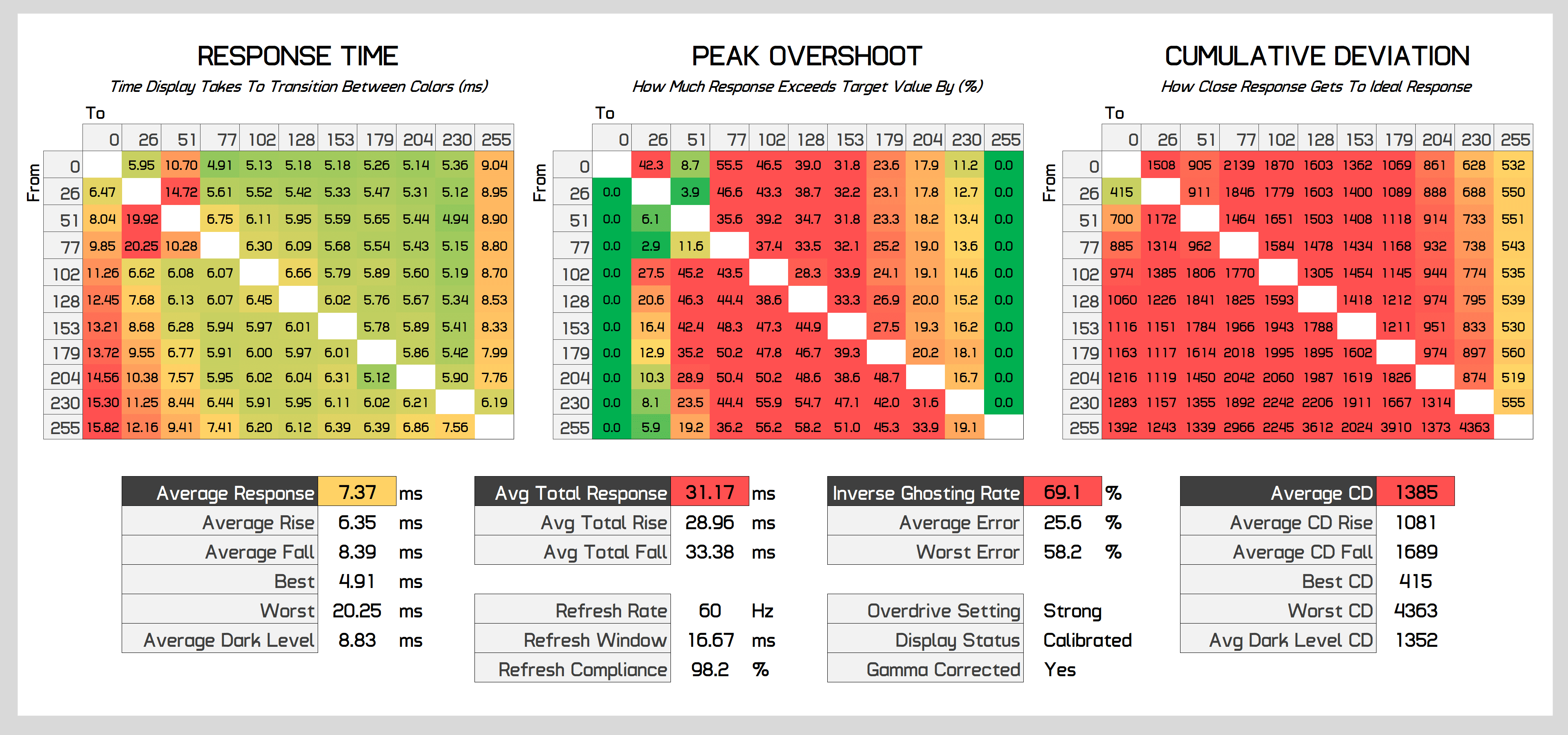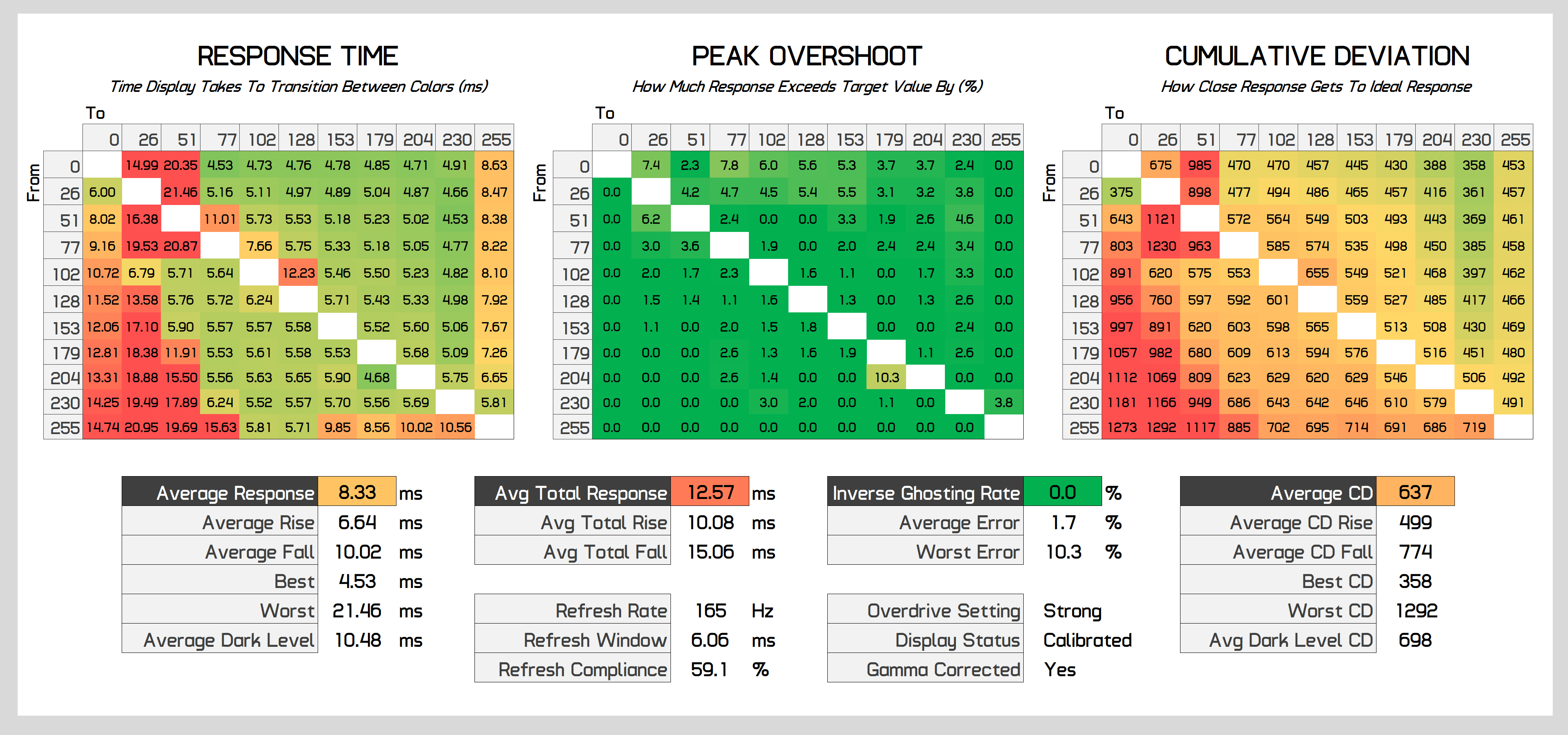 The next mode is Strong, which is an improvement in many areas. Average response time has improved to 8.33ms and cumulative deviation is now a lot better as well, all with zero overshoot at the maximum refresh rate. However as you can see performance is a bit weird, with some responses being reasonably quick, and others tailing off a bit at the end, in particular these darker transitions in this area. I've tripled checked these results including looking at the raw response curves and basically some transitions are well tuned but others are not. This isn't that uncommon for some panel types, but it's also not ideal as there can still be blur trails introduced by these slower transitions.