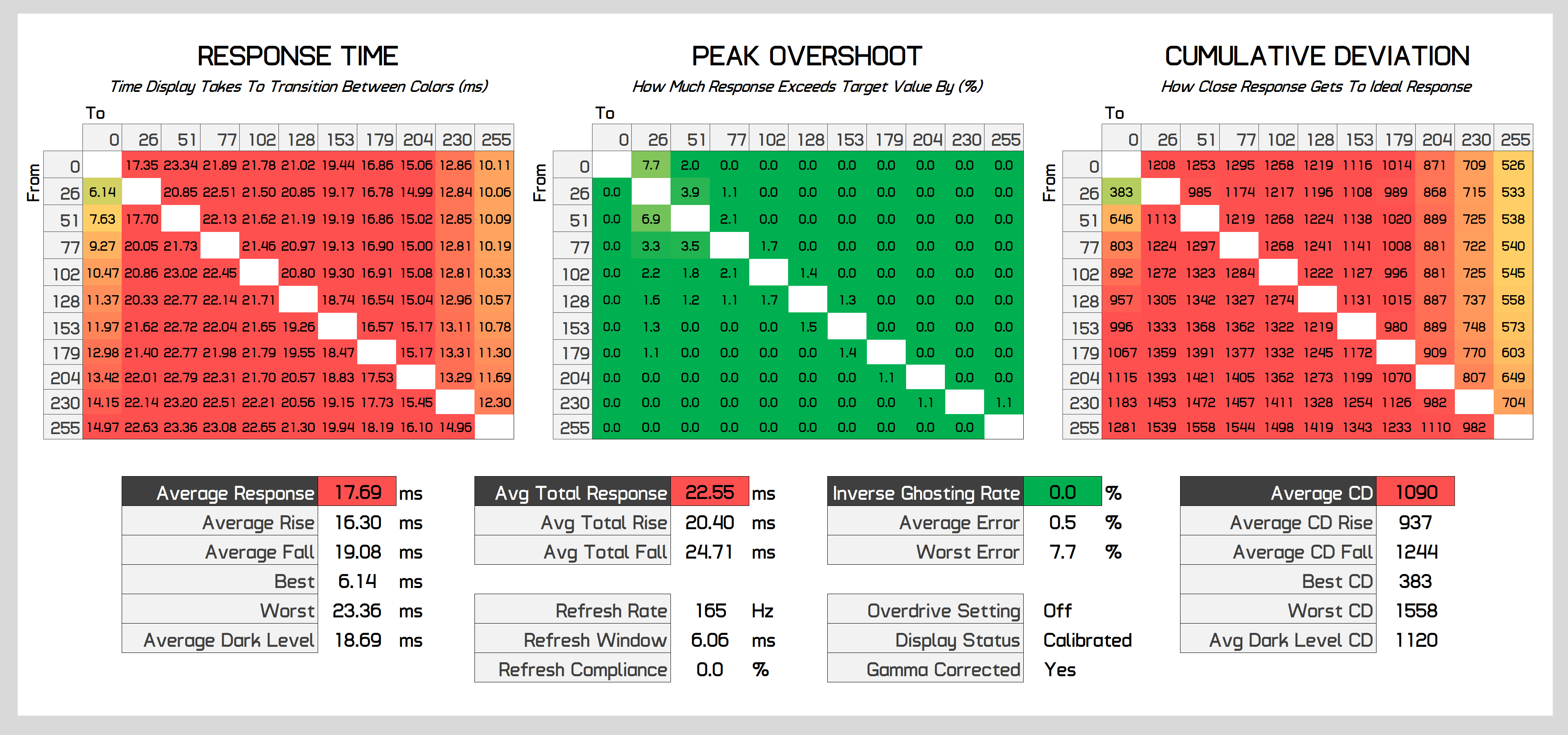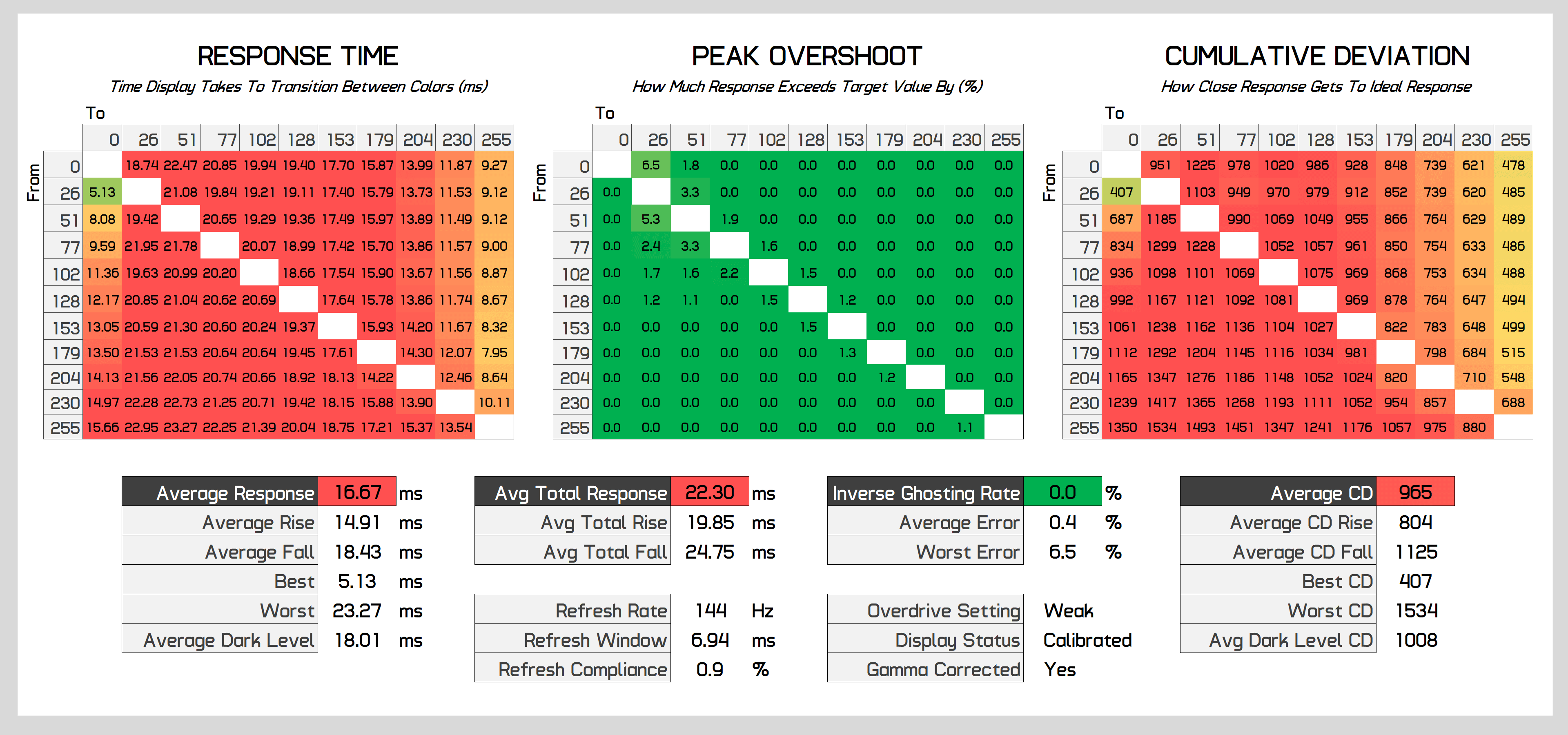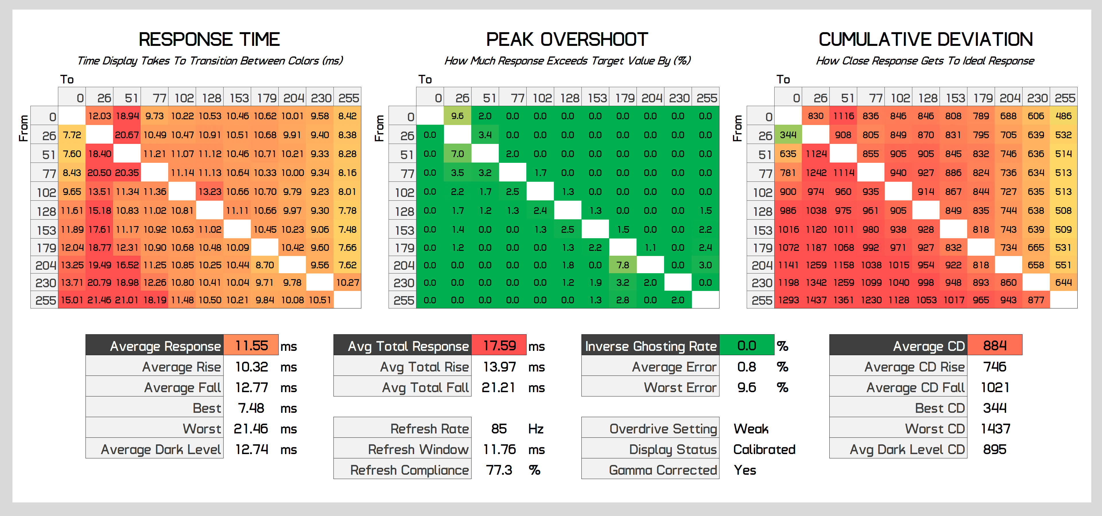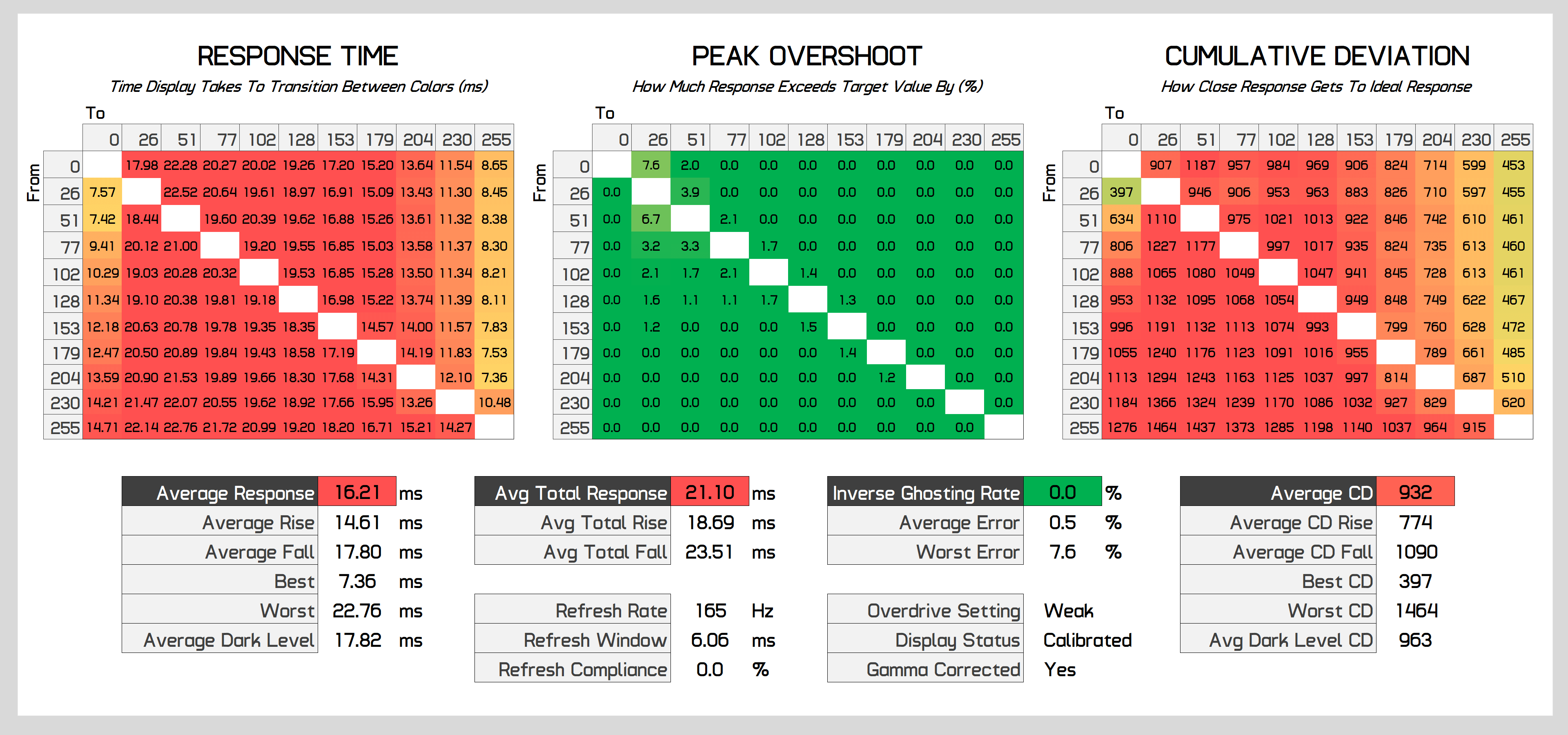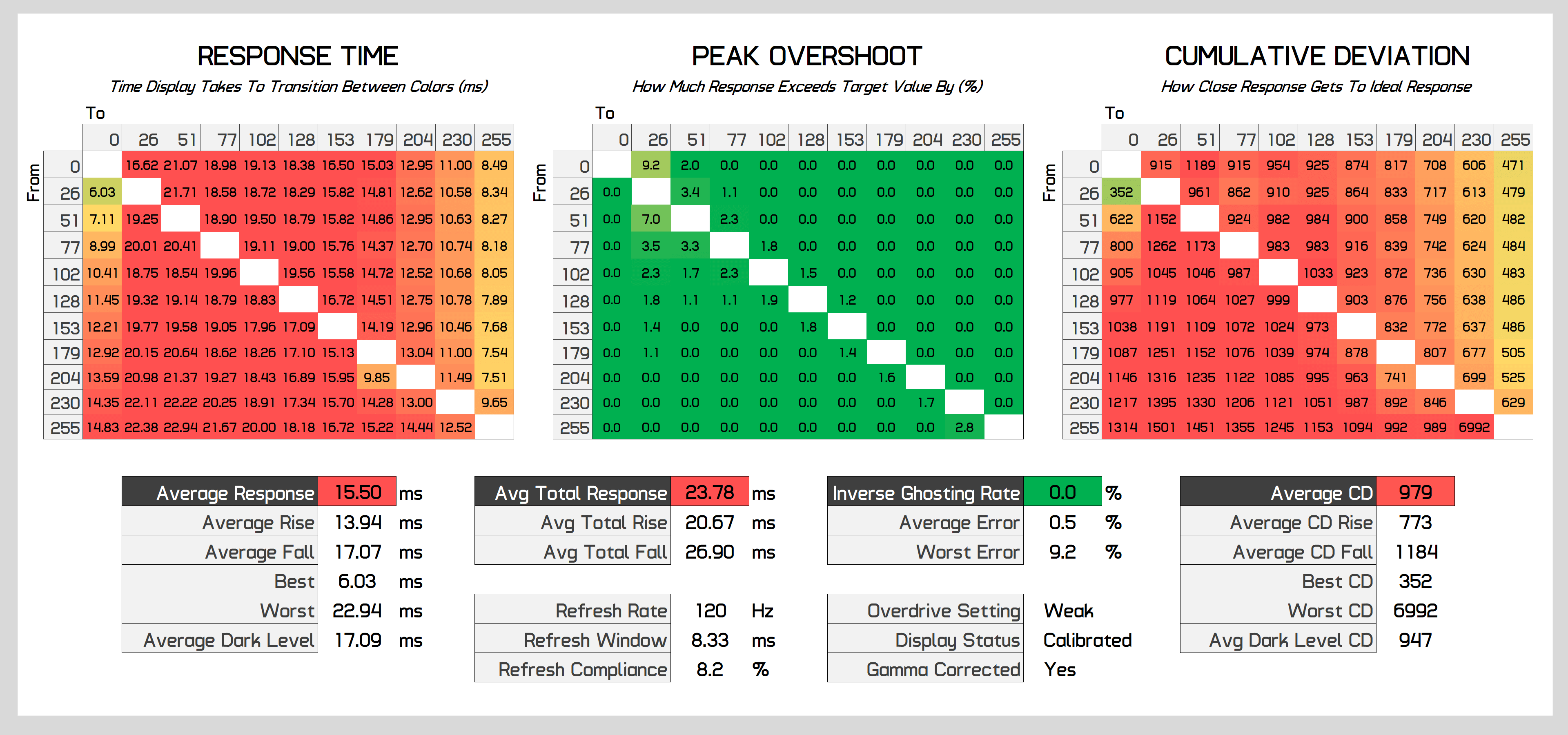 The next mode is Strong, which is an improvement in many areas. Average response time has improved to 8.33ms and cumulative deviation is now a lot better as well, all with zero overshoot at the maximum refresh rate. However as you can see performance is a bit weird, with some responses being reasonably quick, and others tailing off a bit at the end, in particular these darker transitions in this area. I've tripled checked these results including looking at the raw response curves and basically some transitions are well tuned but others are not. This isn't that uncommon for some panel types, but it's also not ideal as there can still be blur trails introduced by these slower transitions.
