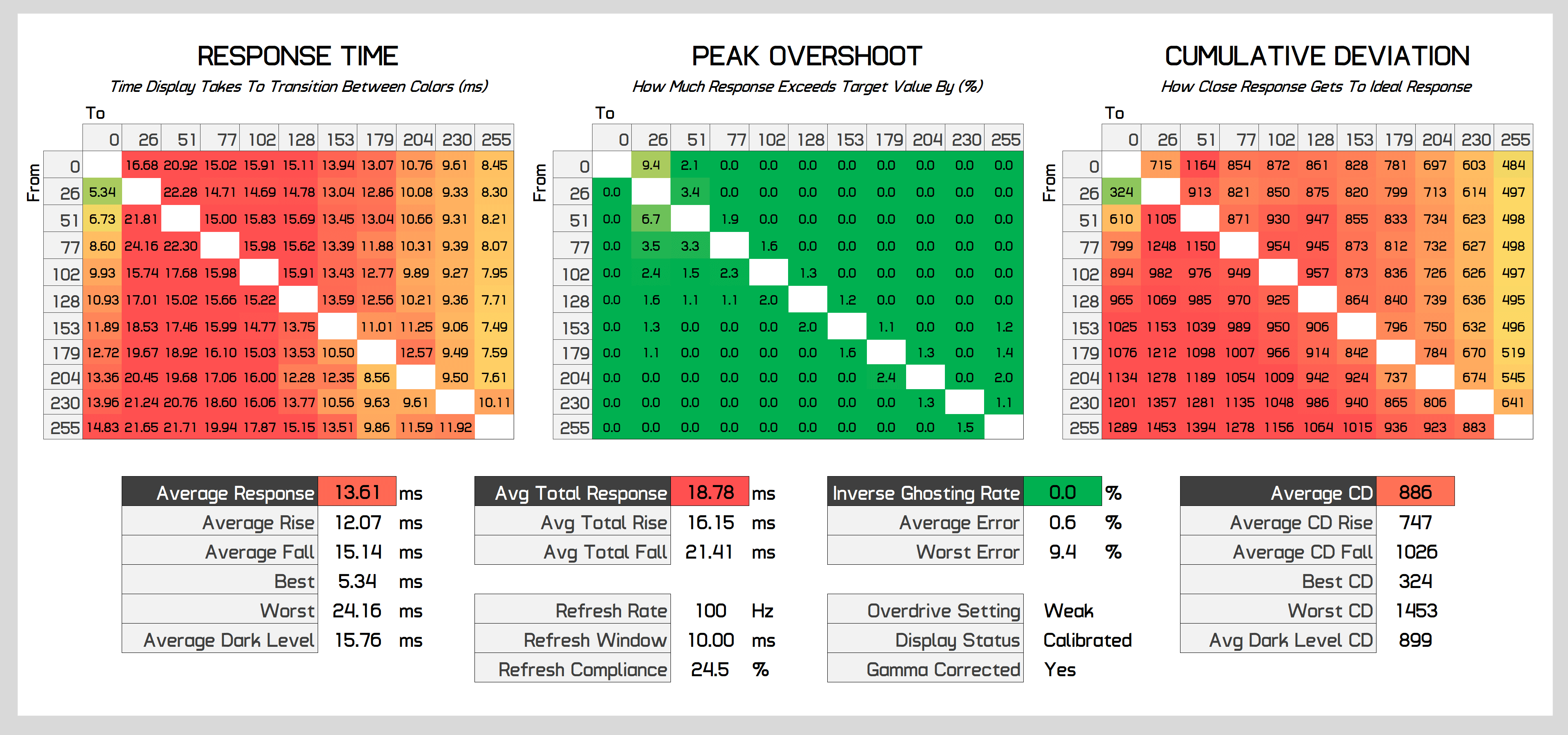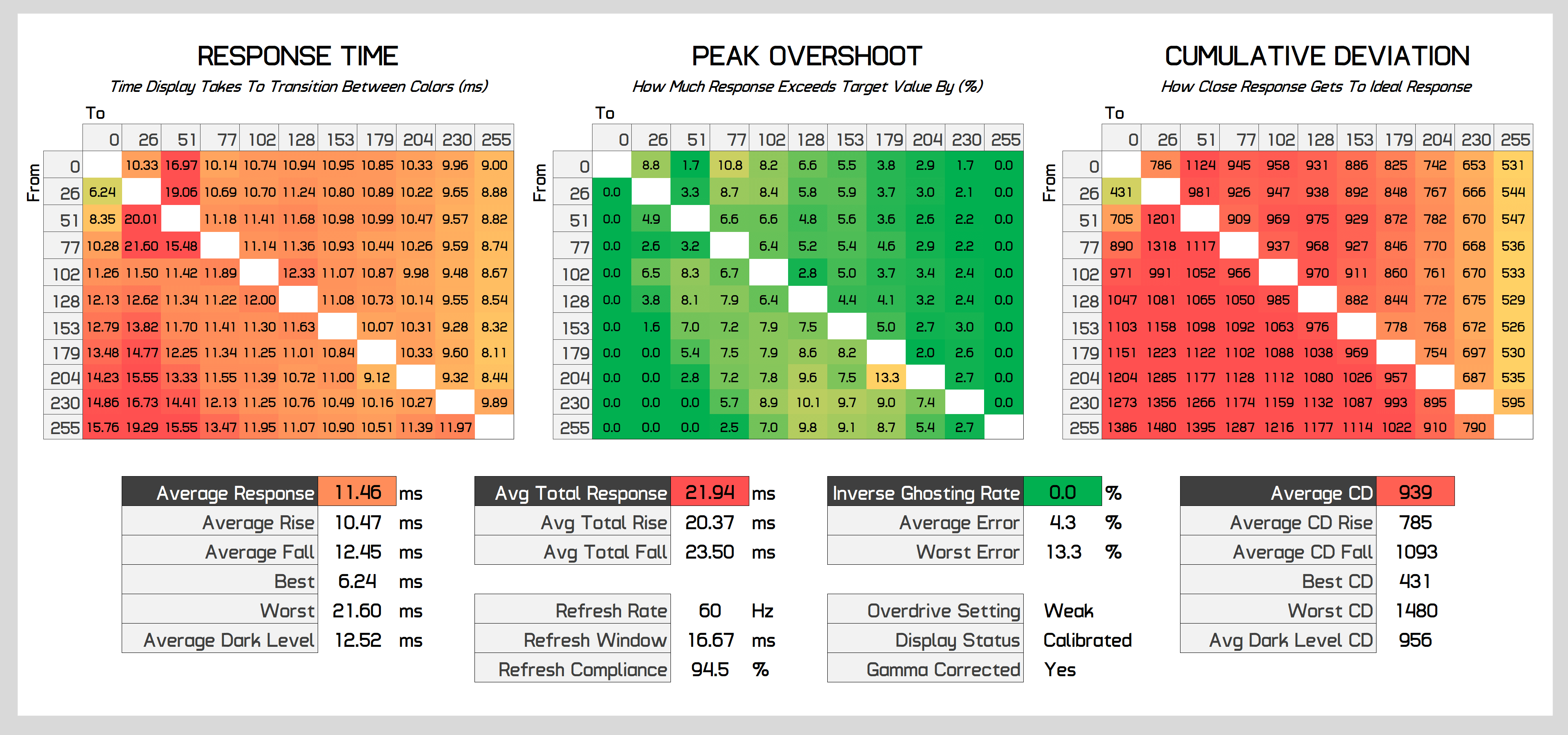First up, overdrive off performance. Not a great start with slow response times, but it's overdrive off, so we can't read too much into it. But next up we have Weak overdrive and... well this isn't much of an improvement. Cumulative deviation has decreased which is a good thing, but response times have only improved by 1.5ms so it's not exactly a big change. There are noticeable ghosting trails following moving objects using this mode and refresh rate compliance of 0% is obviously terrible.