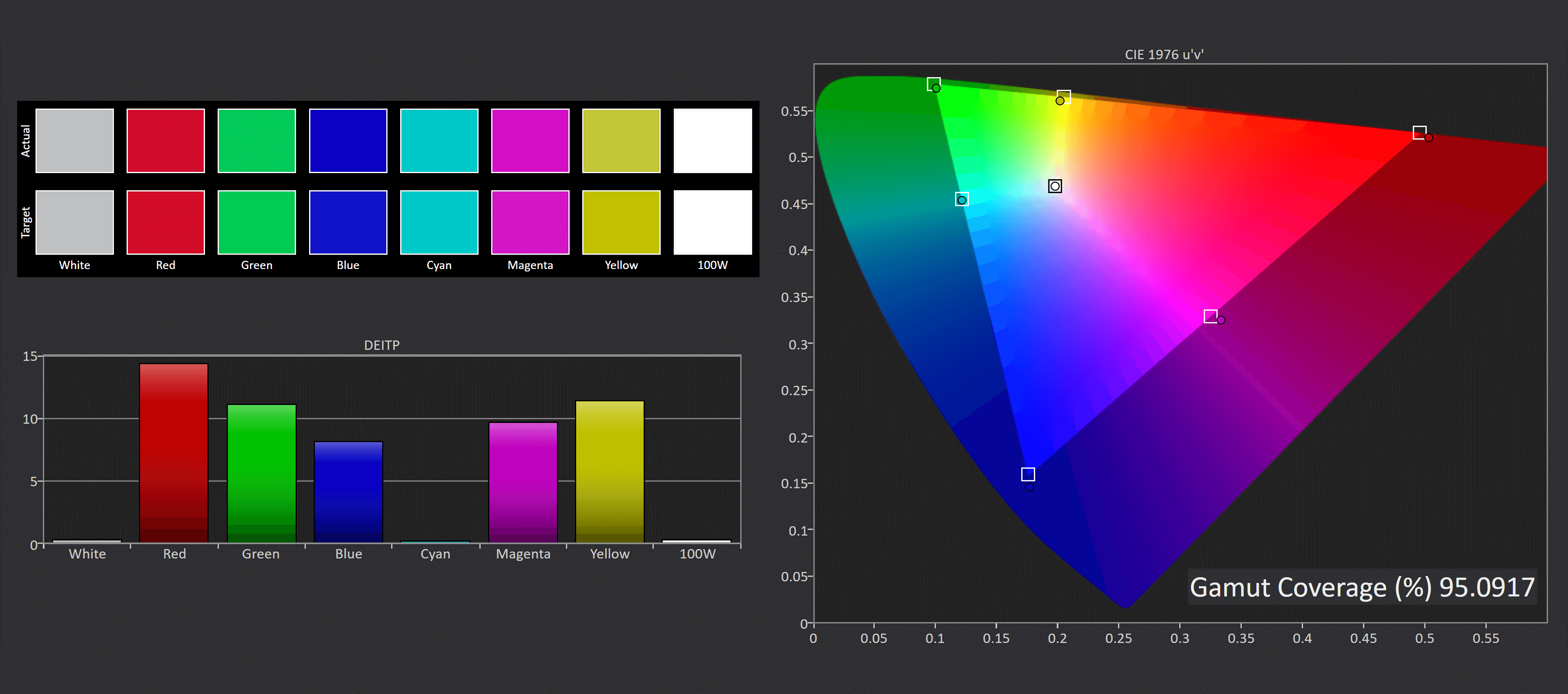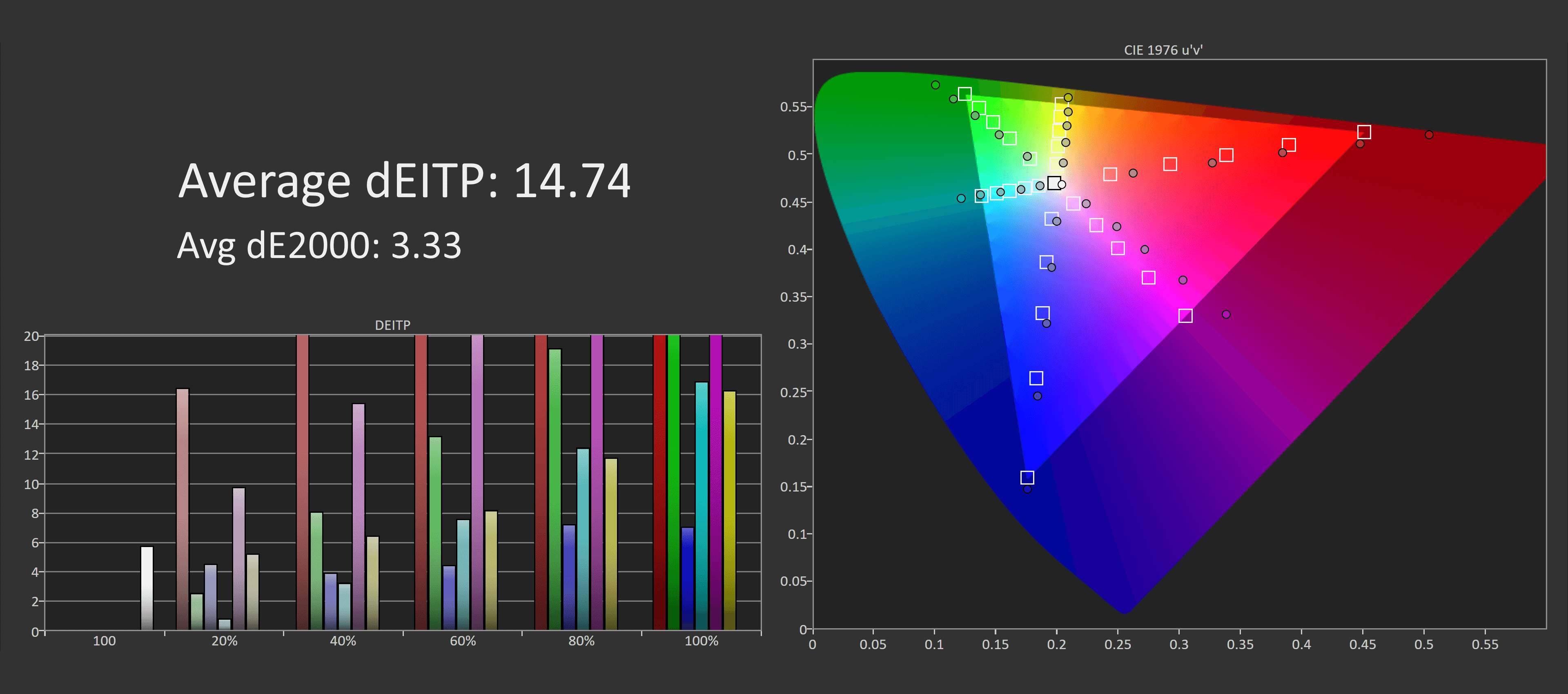 What about the DCI-P3 mode? This mode is the most accurate and Razer have at least tried to get the correct 2.6 gamma, but the white point is still incorrect, for DCI-P3 it should be green-tinted 6300K. This means anyone wanting to use this monitor for editing videos in the DCI-P3 color space will still have to calibrate it themselves.