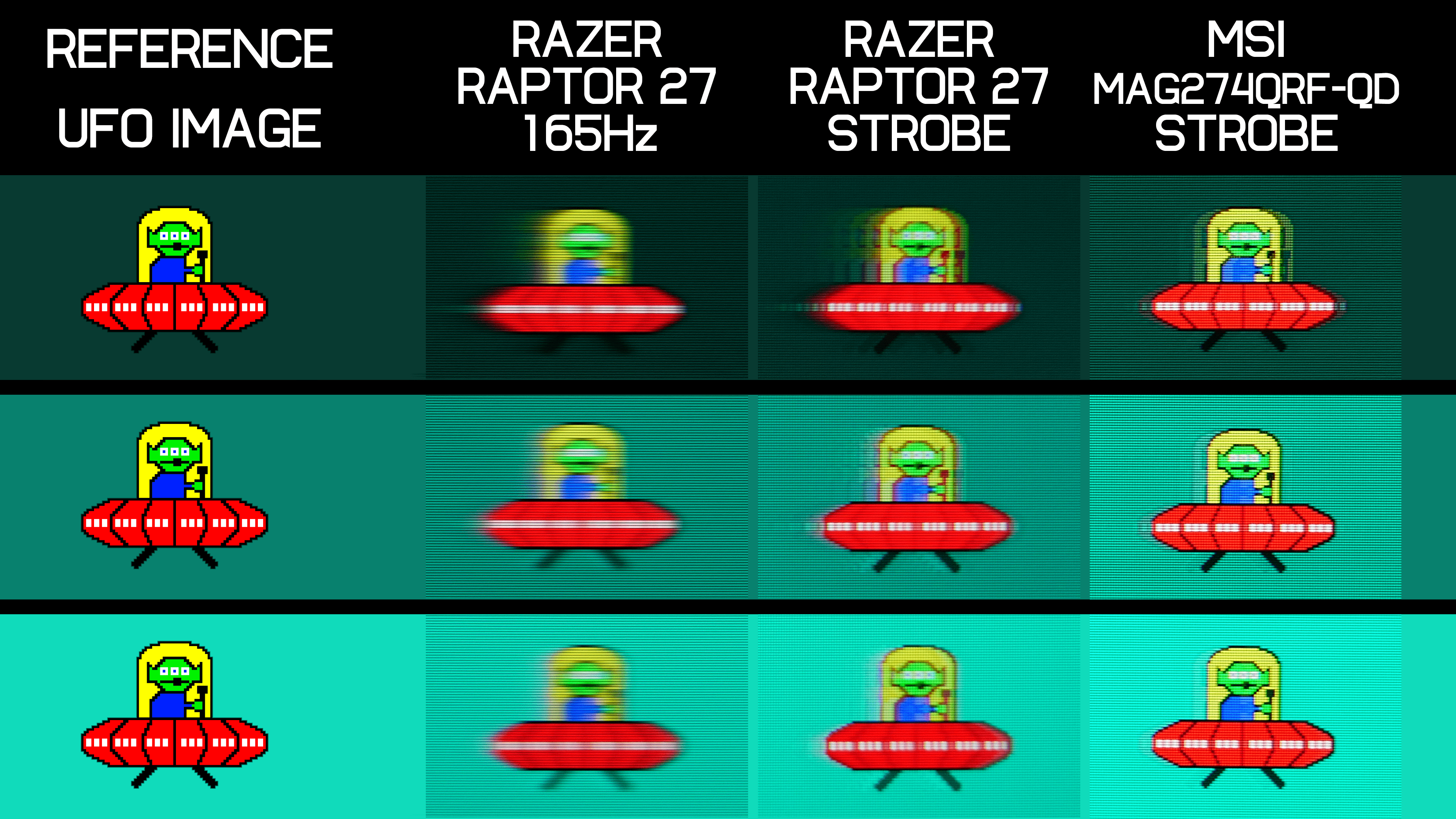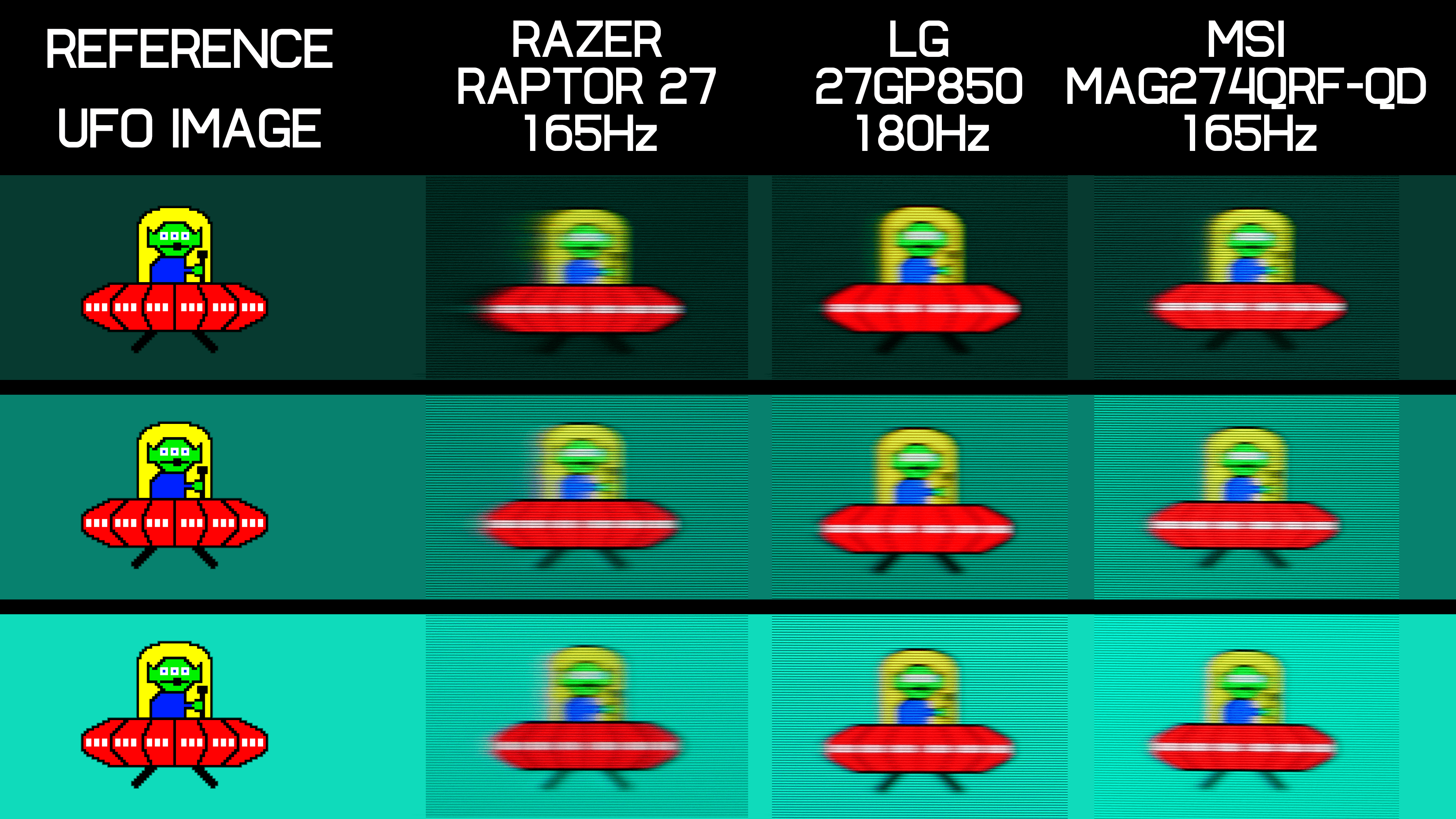 And this is illustrated really well when looking at UFO Tests using BlurBusters' utility. The Raptor 27 even in its best case scenario using strong overdrive has noticeable ghost trails behind the UFO, unlike the models from MSI and LG (which by the way are both substantially cheaper). This is how the numbers in the graph translate to real life visual effects: the MSI and LG monitors are faster in the charts and clearer in the test.