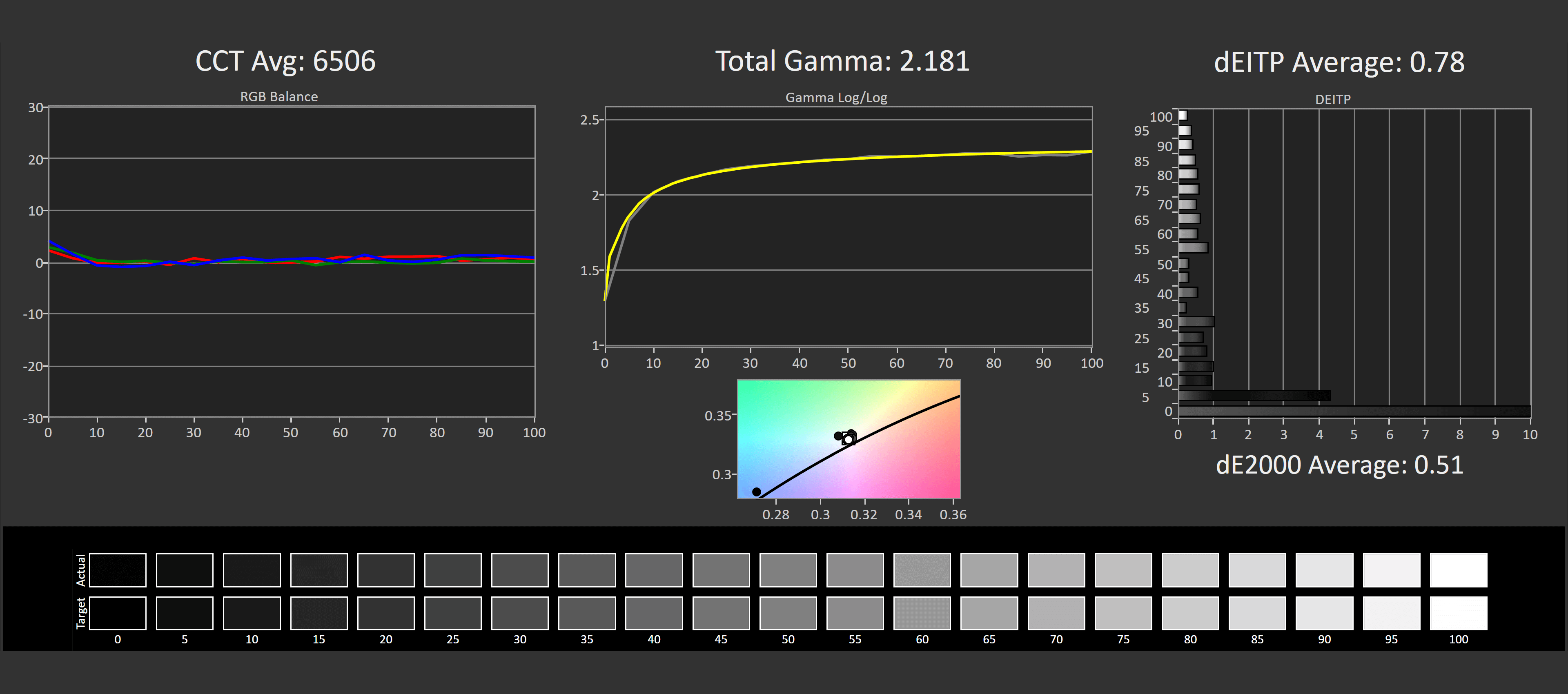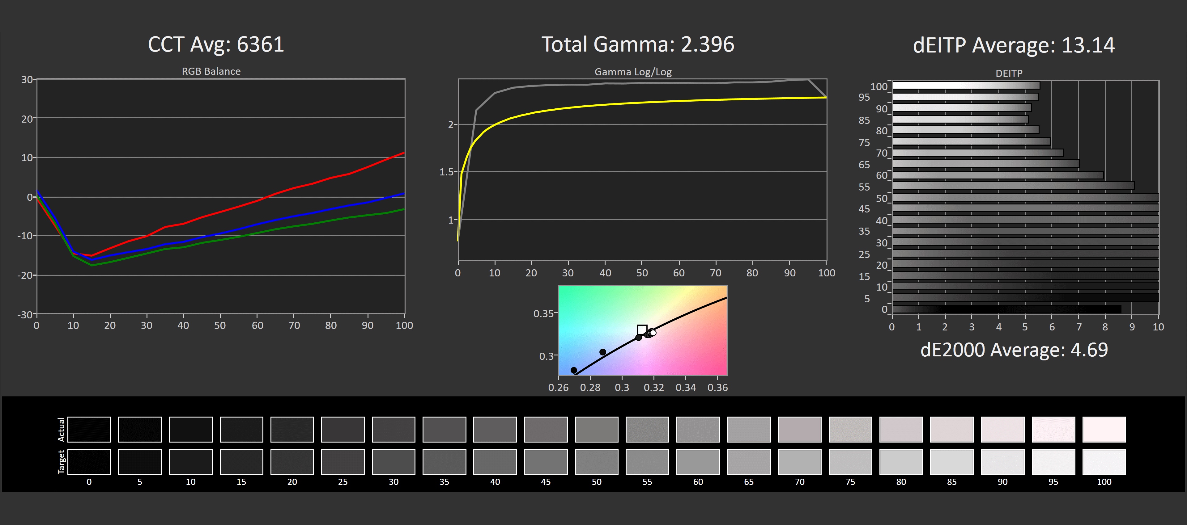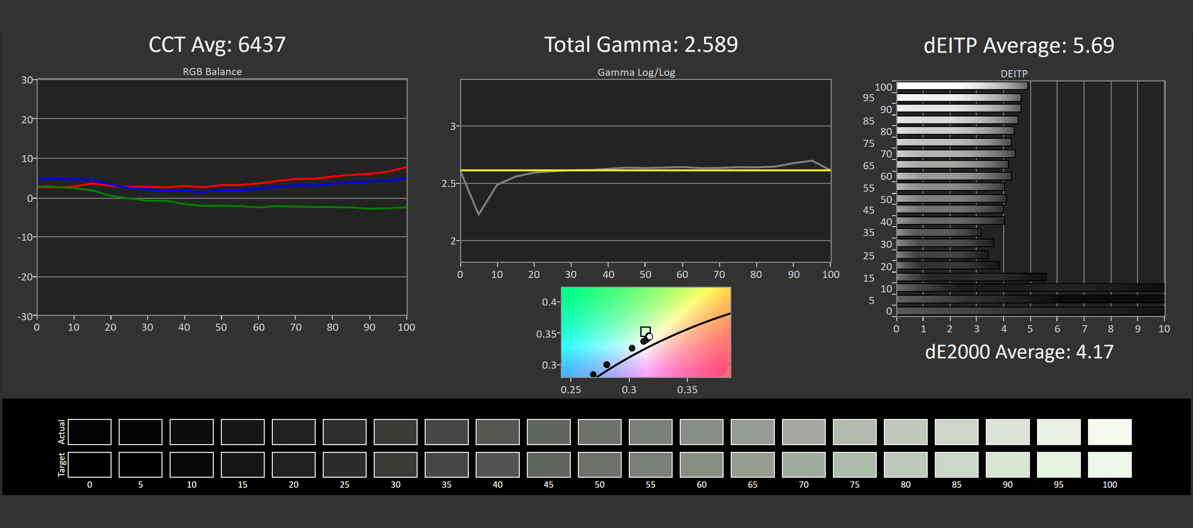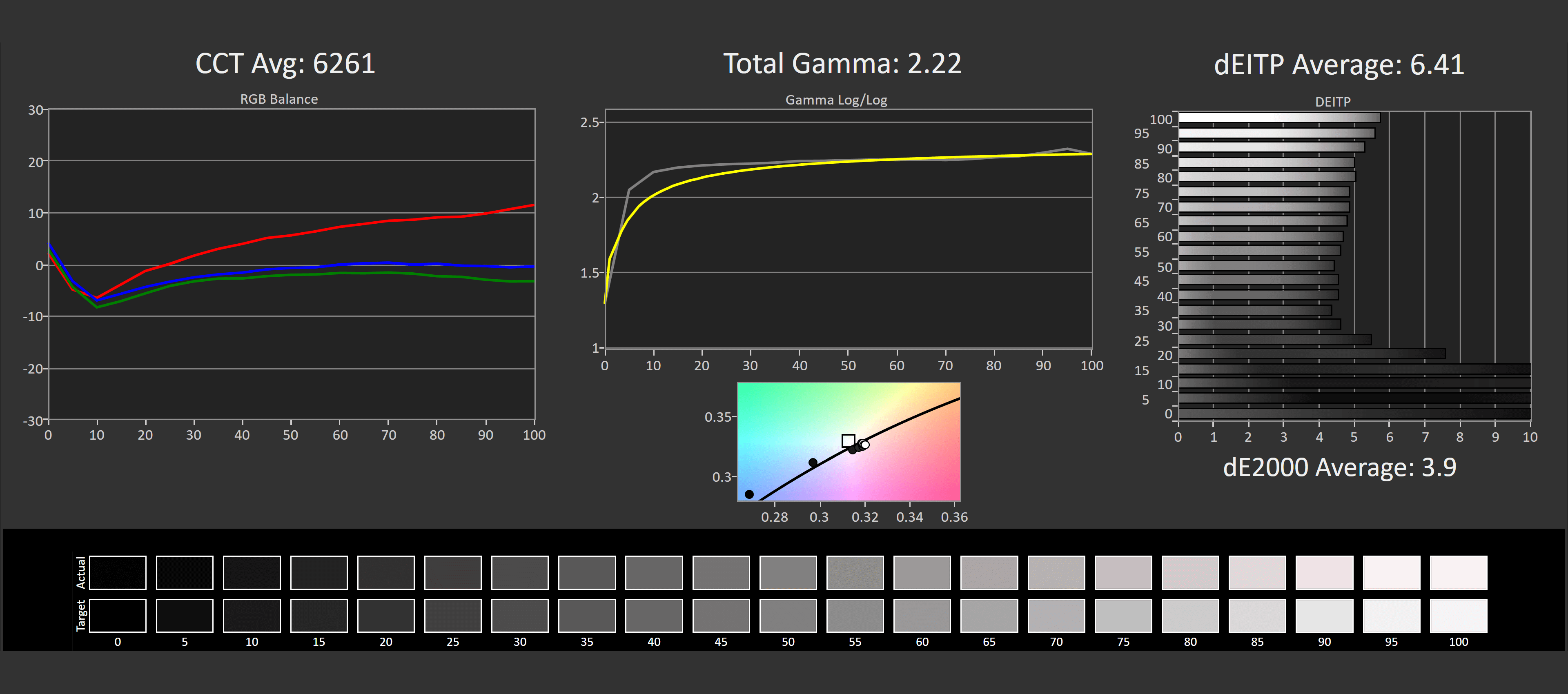 Despite the spec sheet saying the monitor is factory calibrated, actual results say that factory calibration is mediocre. Greyscale results are short of what is required for a gaming monitor. The white point is incorrect and my unit was tinted slightly red out of the box, and while gamma adherence is okay, this only leads to average deltaE results for greyscale, not what I'd call perfect. It's also oversaturated by default, as the monitor's wide gamut is unclamped, despite the vast majority of SDR content today calling for an sRGB or Rec. 709 color space.