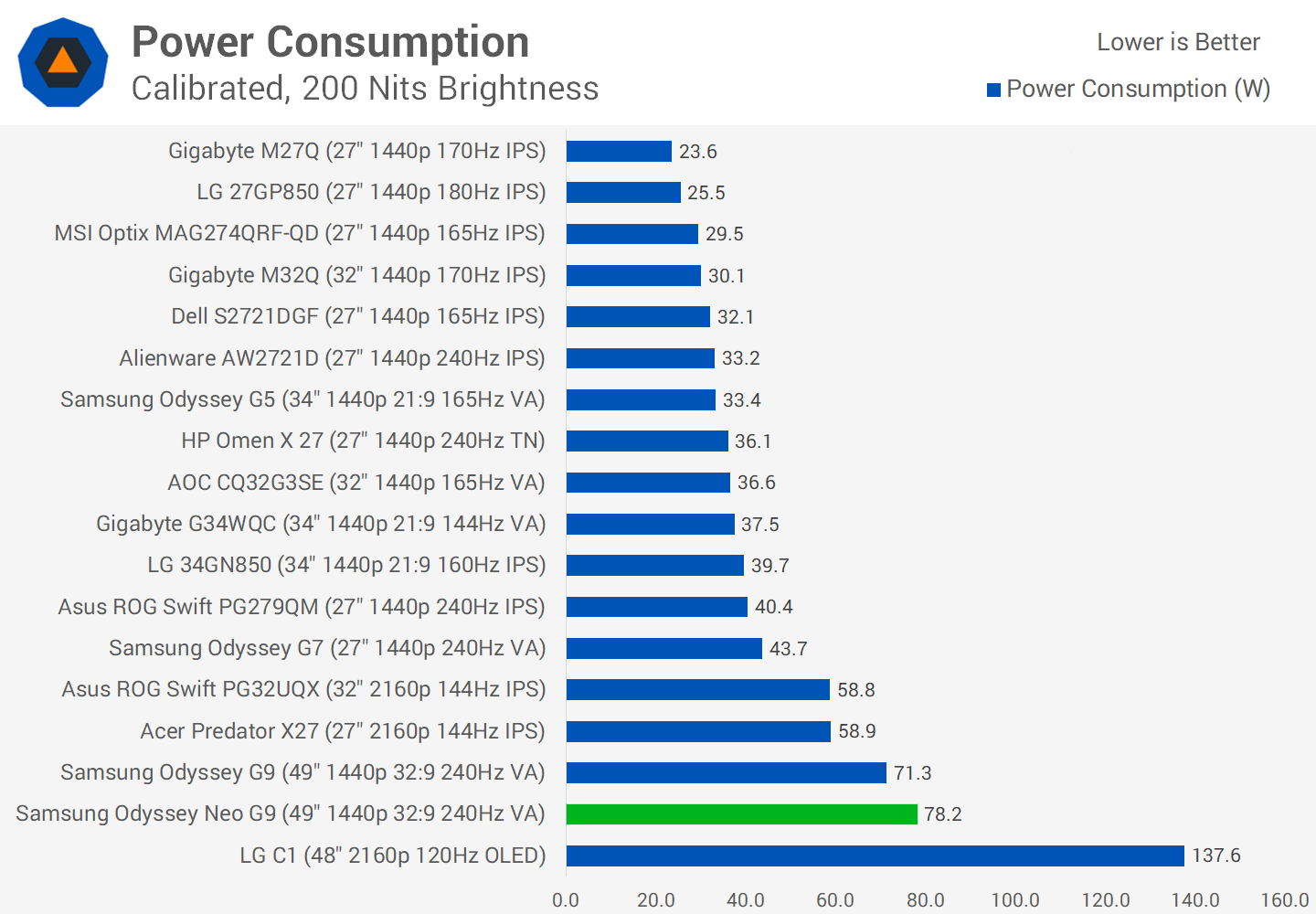Power consumption has increased by 10 percent moving from the old backlight to the new mini-LED backlight the Neo G9, making the Neo G9 a somewhat power hungry display which kind of makes sense given its size. This is only really relevant for heat output as most monitors don't consume that much power to be a significant concern, and overall the Neo G9 is similar in power consumption to two 27-inch displays which makes sense given its size.