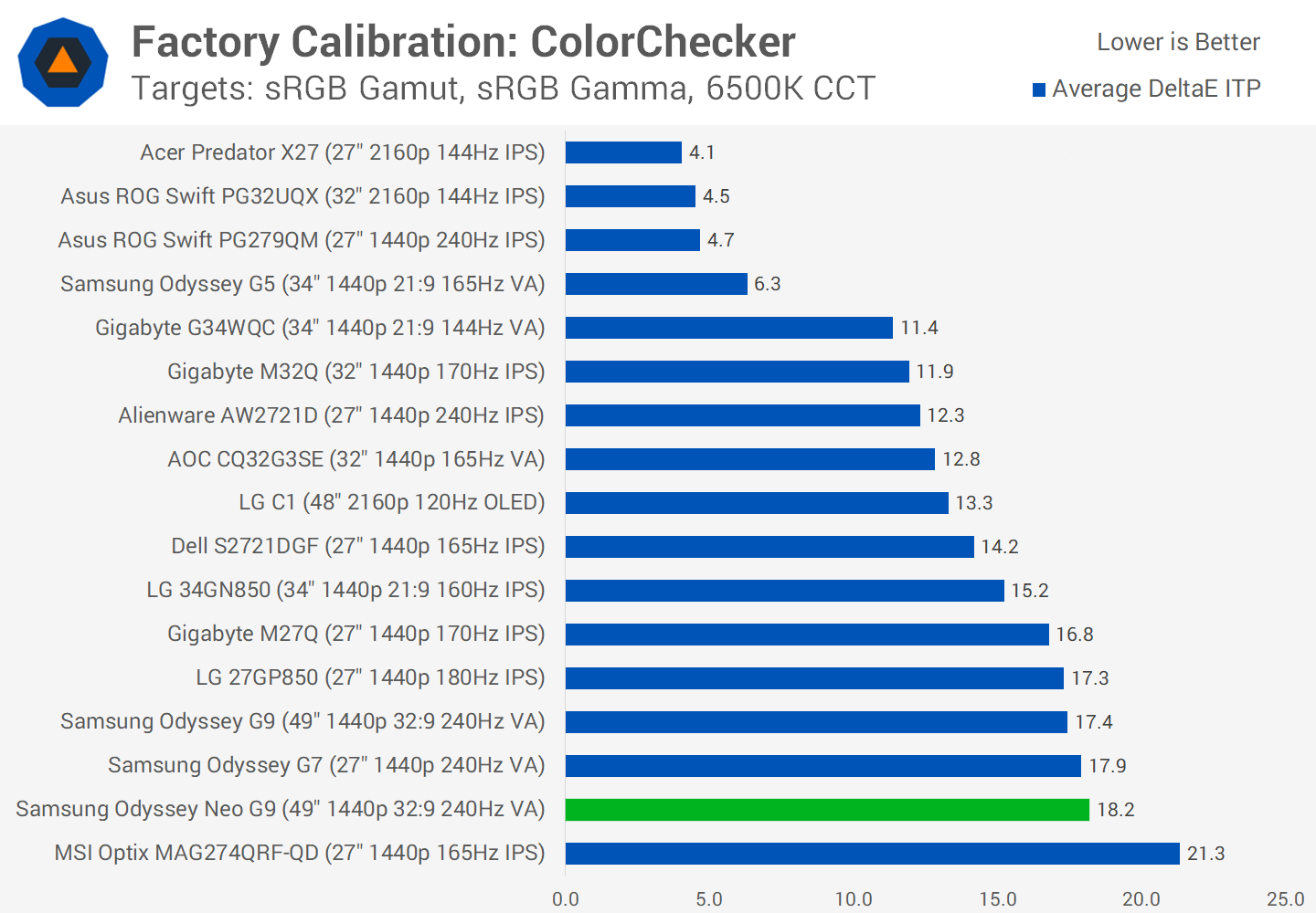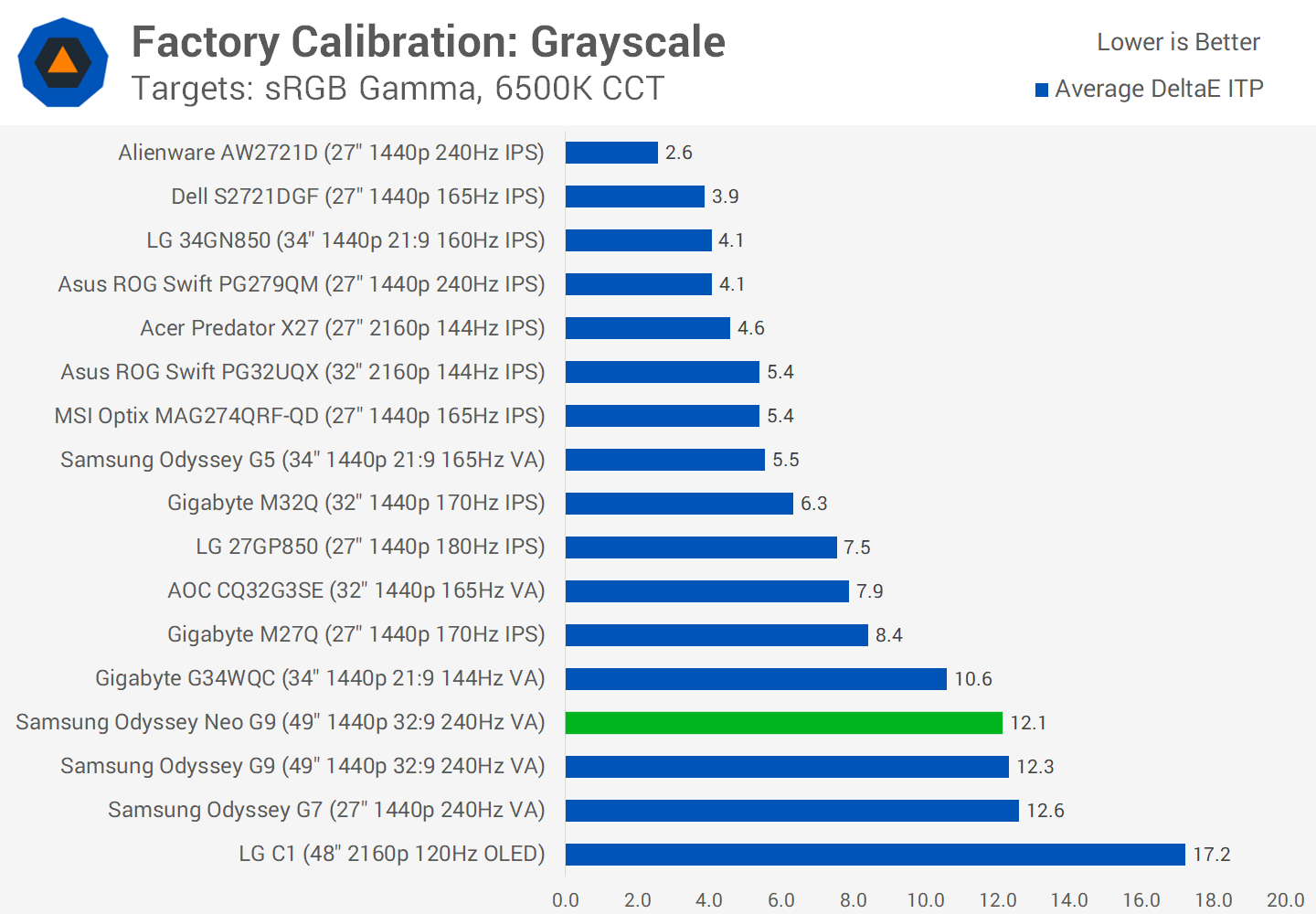 When comparing these results to other gaming monitors, both the Neo G9 and G9 have very similar factory calibration in both greyscale and ColorChecker, and that leads to a below average experience. It would be great to see Samsung put more focus into this, in particular tightening up greyscale which is the most noticeable area where the Neo G9 was off relative to accurate.