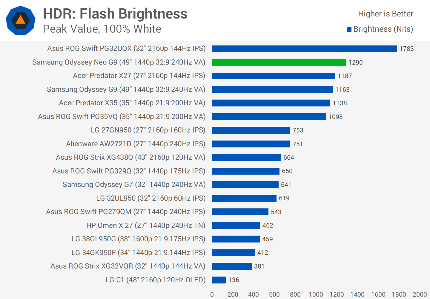 In a full screen flash, the Neo G9 increases to 1290 nits of brightness, a small upgrade on the Odyssey G9 which itself was a DisplayHDR 1000 certified display. Again we're not at the same level as the PG32UQX, but still more than sufficient for most HDR content.
