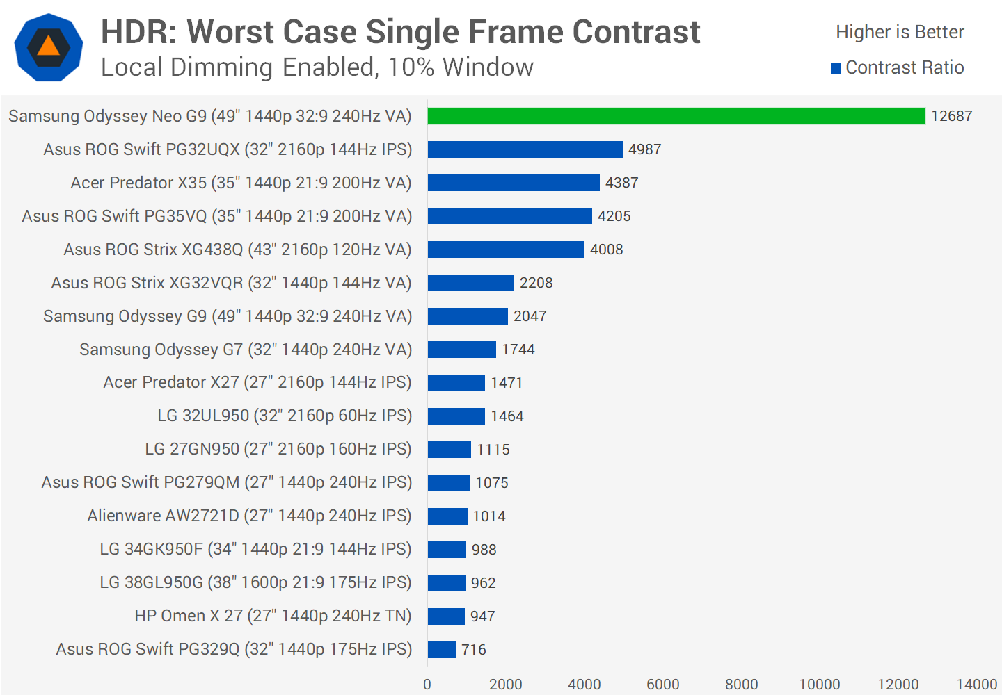 The combination of a high zone count and VA technology means the Neo G9 is significantly better in terms of HDR contrast ratio in the worst cases than any other LCD monitor I've tested so far. We're looking at 2.5x better performance than the PG32UQX which itself isn't bad, but in practice this leads to a lot less blooming with the Neo G9 in tricky conditions like starfields compared to IPS based displays like the PG32UQX.